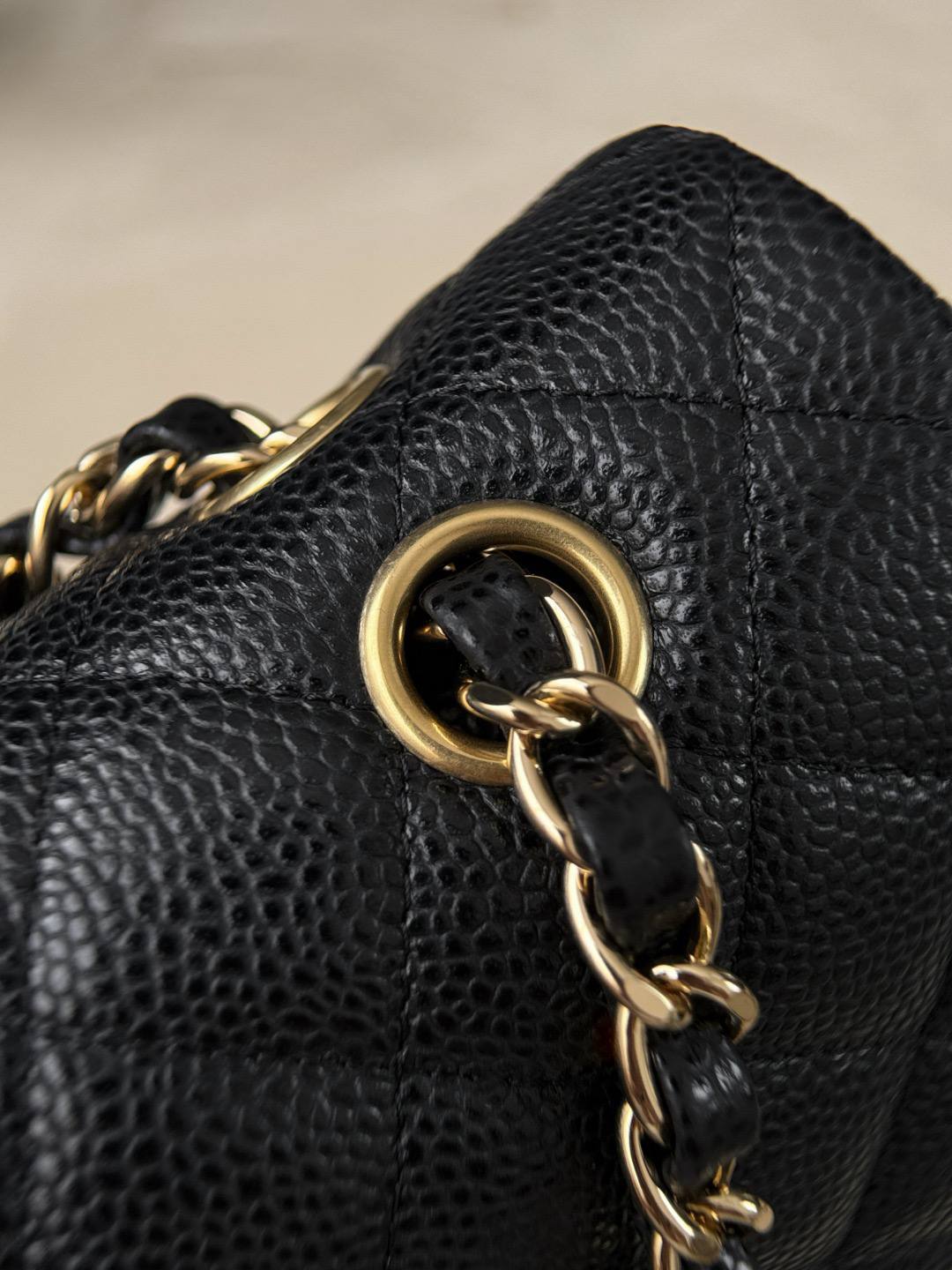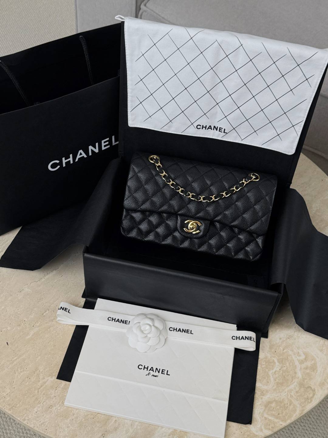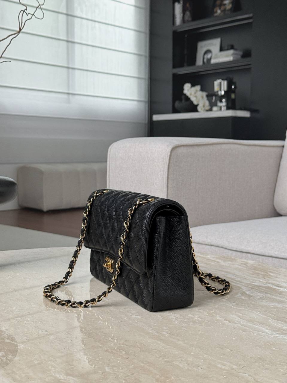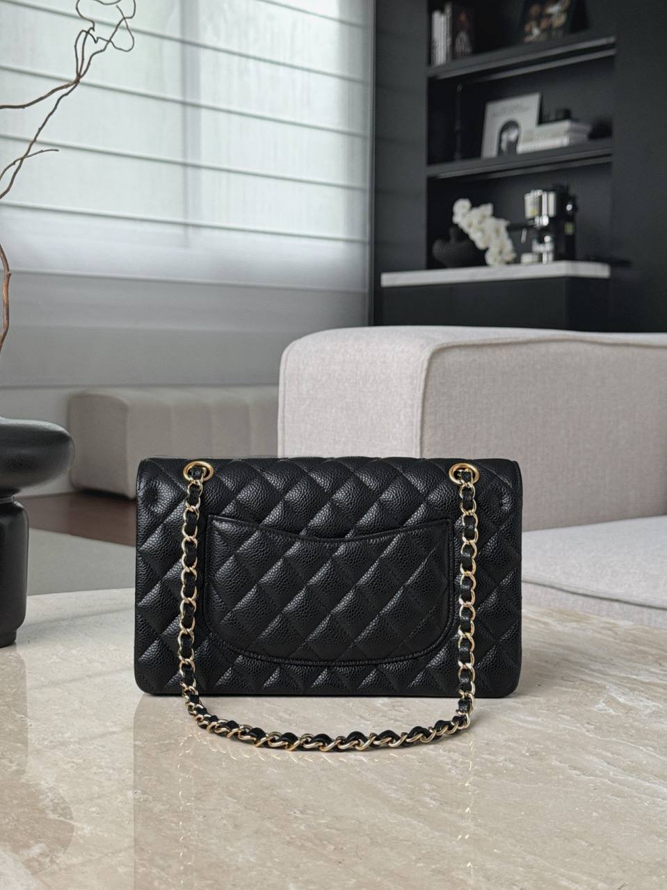 • Дизайн: классический клапан с ромбовидной стежкой, центральная застёжка-твист с логотипом CC в золоте, аккуратные округлые формы и строгая, но женственная геометрия.