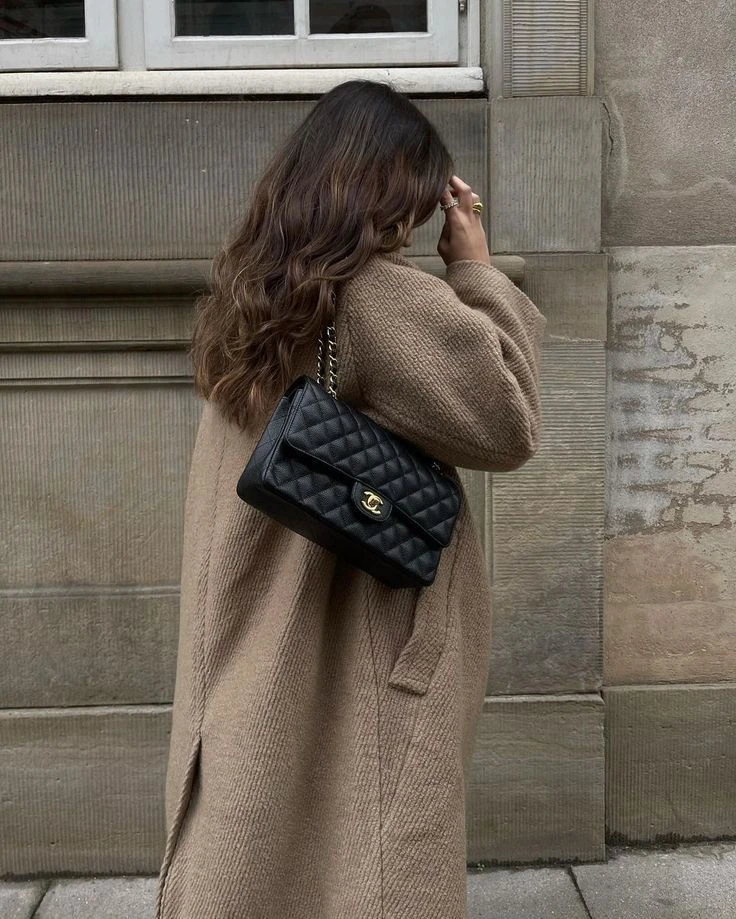 Фурнитура золотистого тона гармонично контрастирует с чёрной кожей: центральный поворотный замок в виде триумфальной эмблемы CC — узнаваемый элемент, который мгновенно выделяет сумку как часть легендарной коллекции. Цепочный ремень с переплетённой кожей удобен и универсален — его можно носить сложенным вдвое для более классического посадки на плече или распустить для перекрёстной носки.