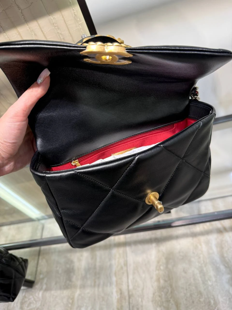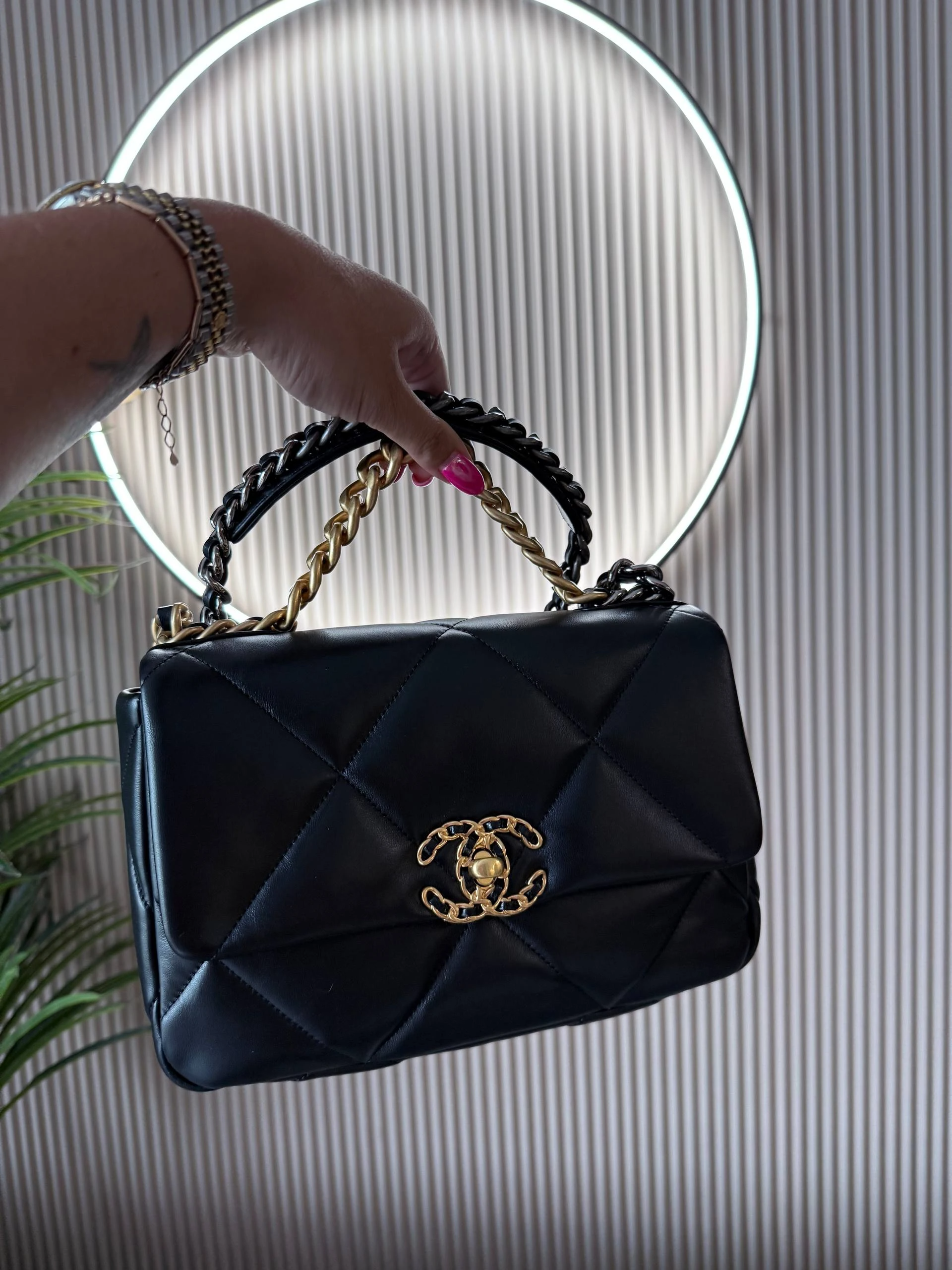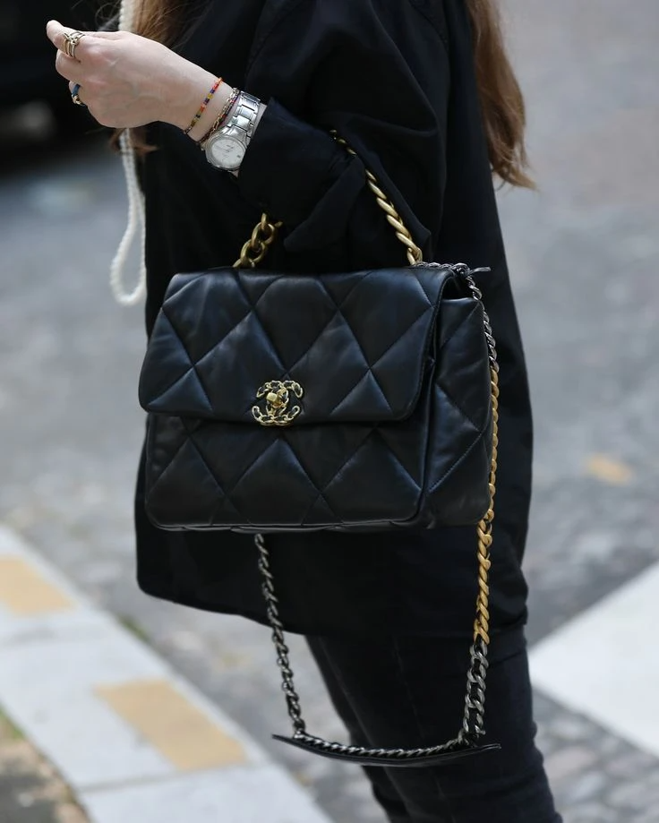 Сумка Chanel 19 — одна из самых популярных моделей от французского модного дома. Выполнена из блестящей кожи ягненка, которая отличается мягкостью и элегантным блеском. В модели используются золотистые и серебристые металлические детали. Такое сочетание создает интересный контраст и добавляет современности классическому дизайну. Сумка имеет характерную форму с мягкими линиями и объемным силуэтом. Она может носиться как на плече, так и через плечо благодаря длинной цепочке.