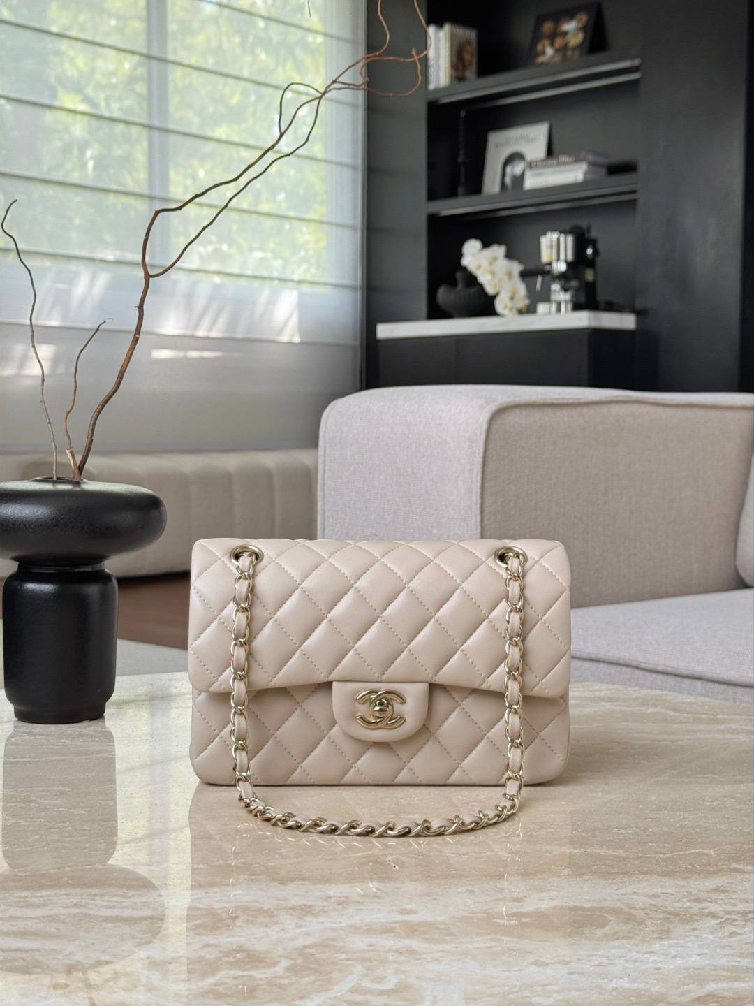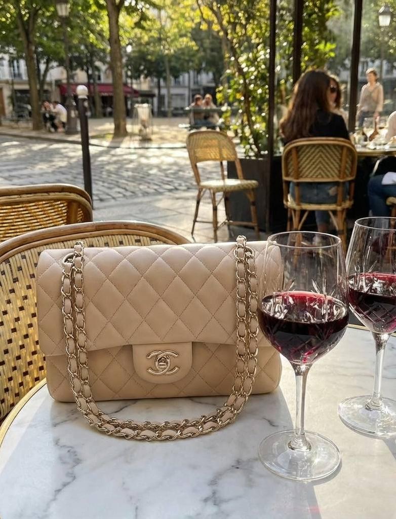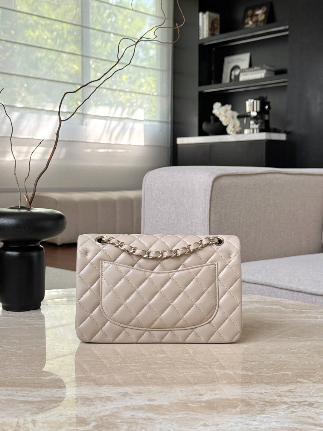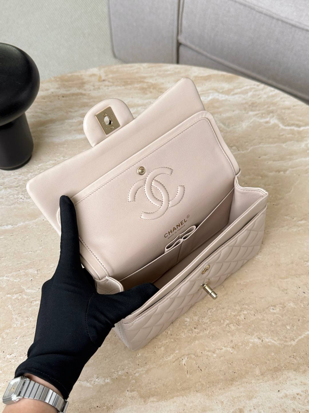 Classic Flap CF23 демонстрирует всё, за что любят CHANEL: идеальные пропорции, аккуратная стёжка «ромб», безупречная отделка и узнаваемая фурнитура. Нежный бежево‑кремовый тон делает сумку универсальной — она легко дополняет как деловые образы, так и вечерние луки. Мягкая кожа подчеркивает утончённость модели, а золотистая цепочка и логотип CC придают образу благородный блеск без излишней вычурности.