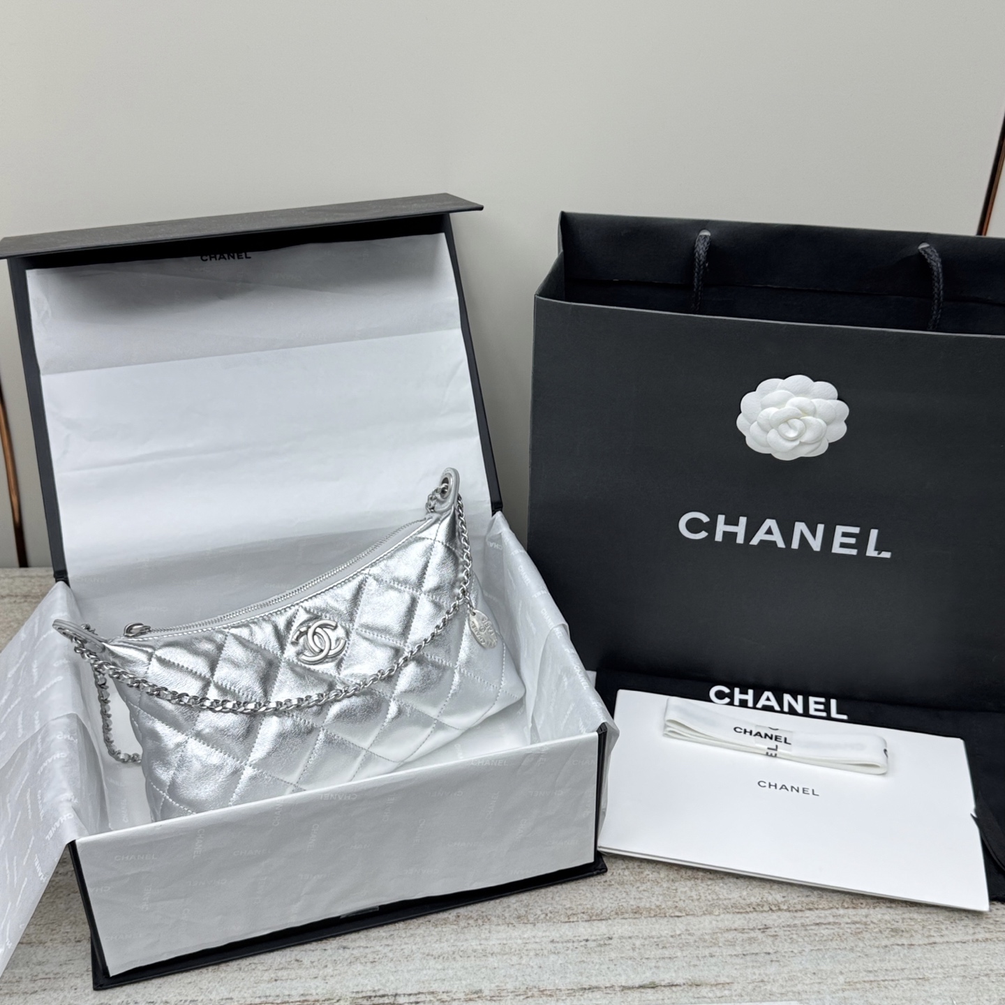 На передней части сумки элегантно выделяется металлическая эмблема — узнаваемый символ дома Chanel.