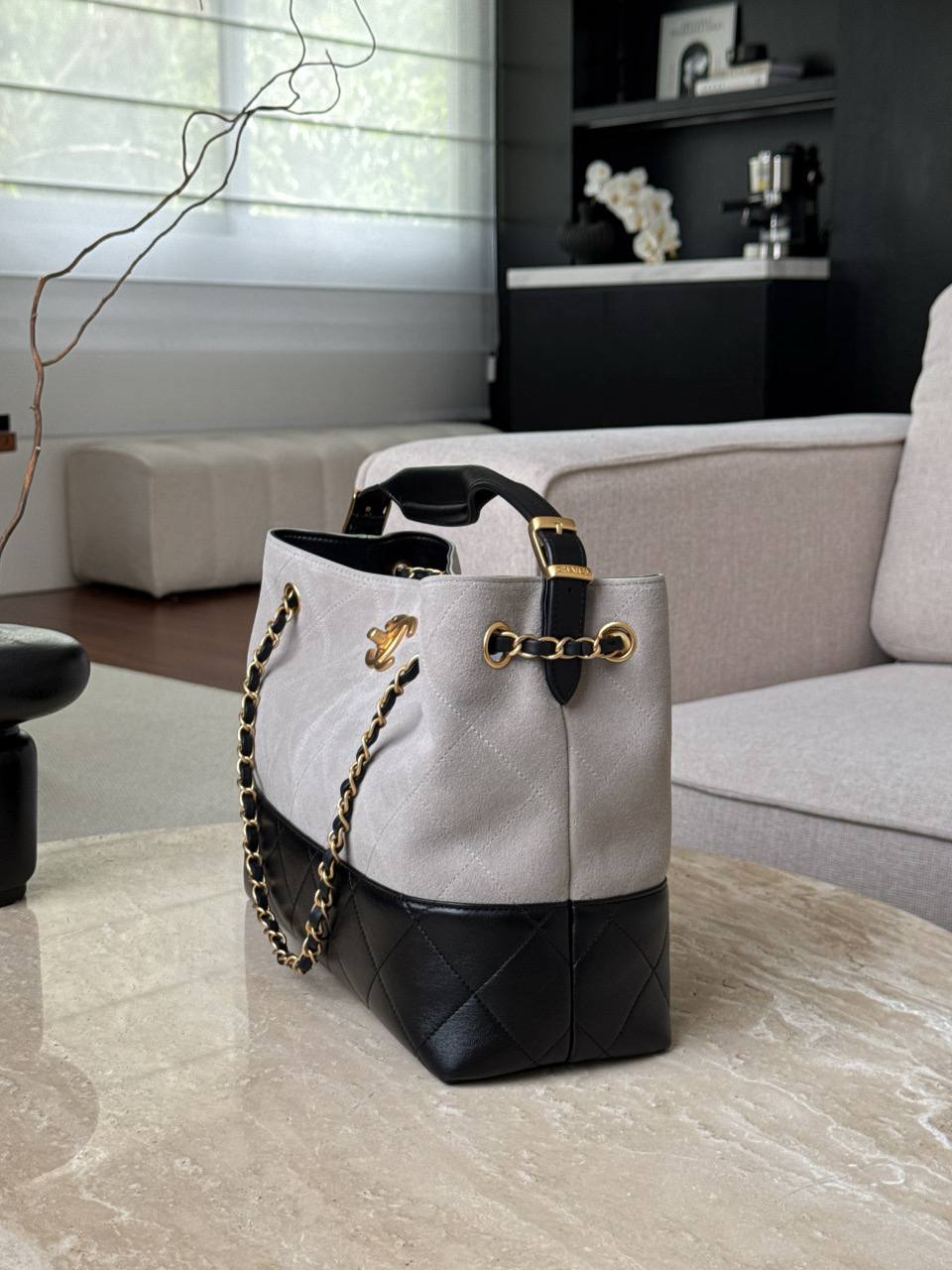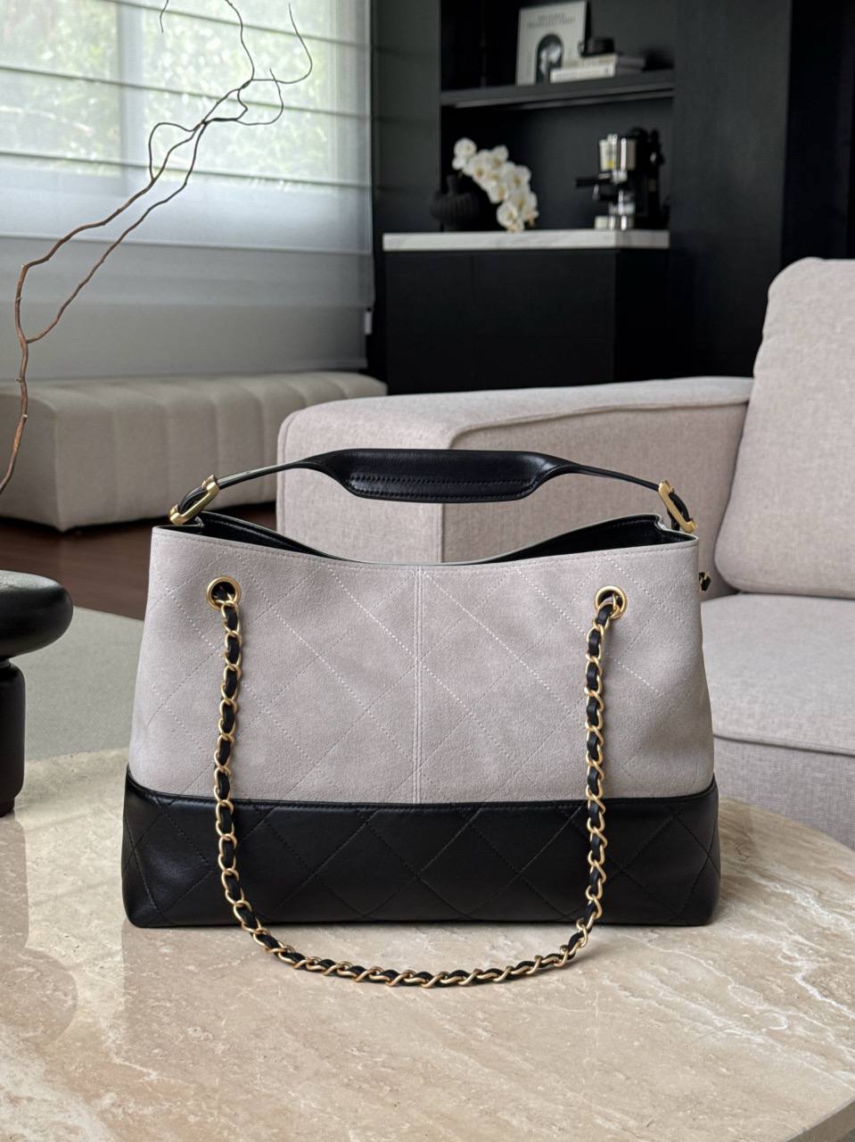 Элегантная и практичная сумка Hobo 25 от CHANEL, выполненная в благородном сочетании замши и чёрной стёганой кожи с золотистой фурнитурой. Идеальный городской аксессуар — вместительная, в то же время компактная, с узнаваемым логотипом CC и утончённой цепочной ручкой с кожаной оплёткой.