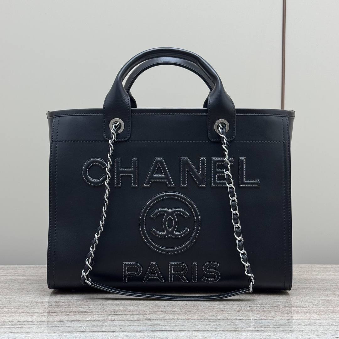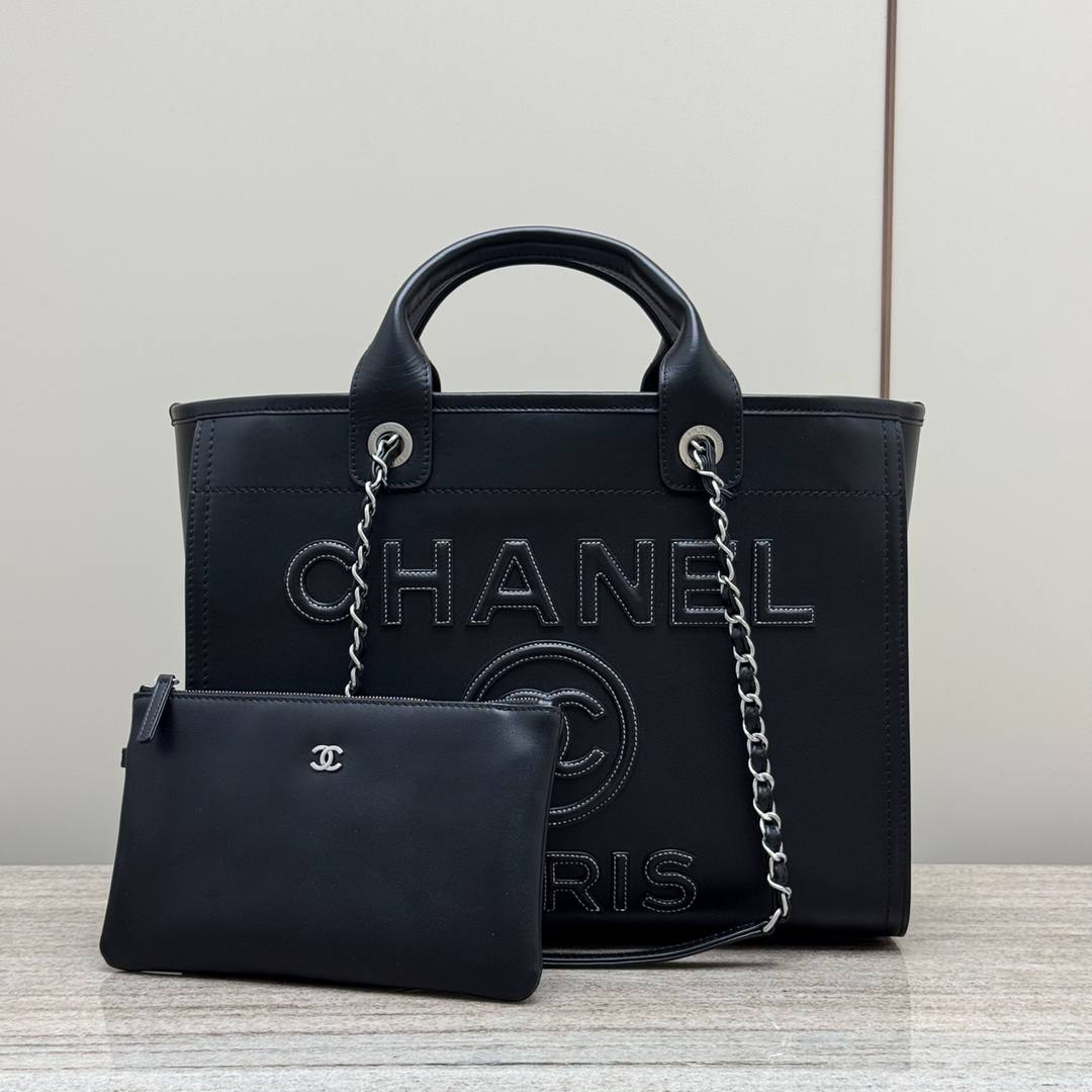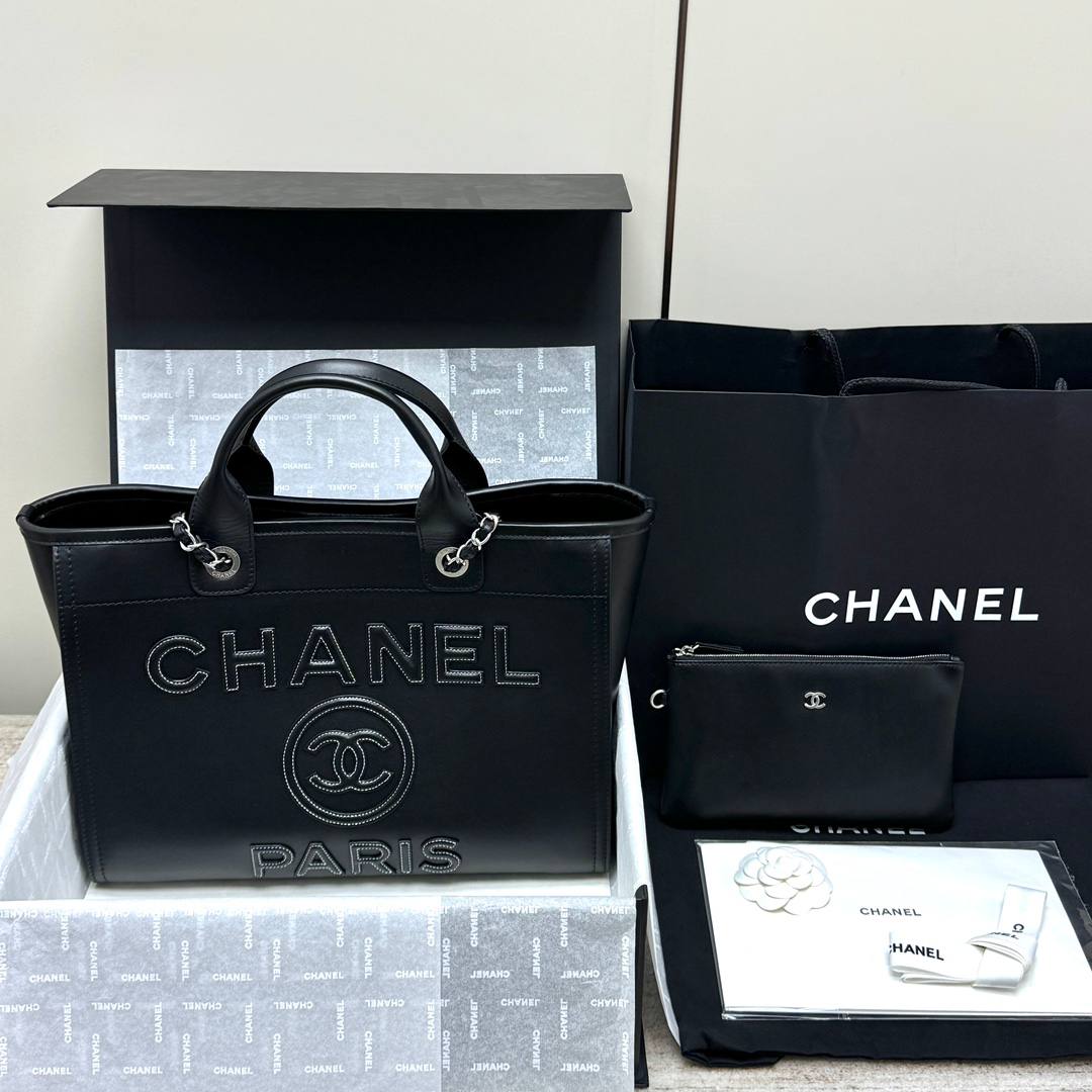 CHANEL Женская сумка‑шоппер 24A — элегантный и практичный образец городской роскоши. Эта модель выполнена из гладкой черной кожи с аккуратной контрастной отстрочкой, которая формирует узнаваемые надписи CHANEL и PARIS, а также фирменный двойной логотип CC в круге на лицевой панели. Четкие геометрические линии и плотная структурированная форма делают сумку одновременно строгой и современно женственной.