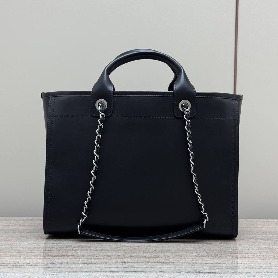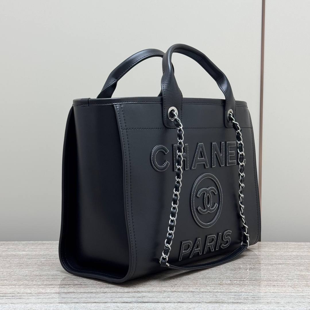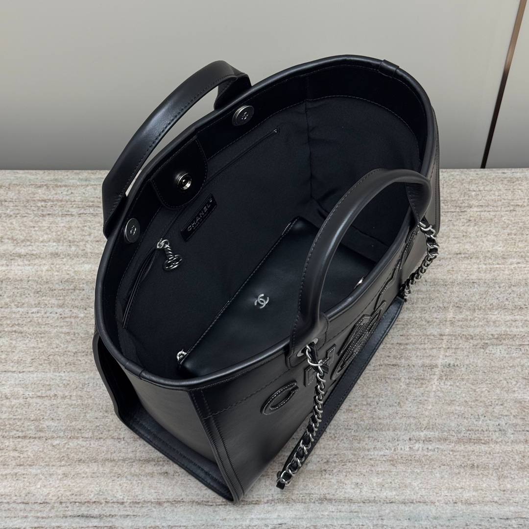 CHANEL Женская сумка‑шоппер 24A — элегантный и практичный образец городской роскоши. Эта модель выполнена из гладкой черной кожи с аккуратной контрастной отстрочкой, которая формирует узнаваемые надписи CHANEL и PARIS, а также фирменный двойной логотип CC в круге на лицевой панели. Четкие геометрические линии и плотная структурированная форма делают сумку одновременно строгой и современно женственной.