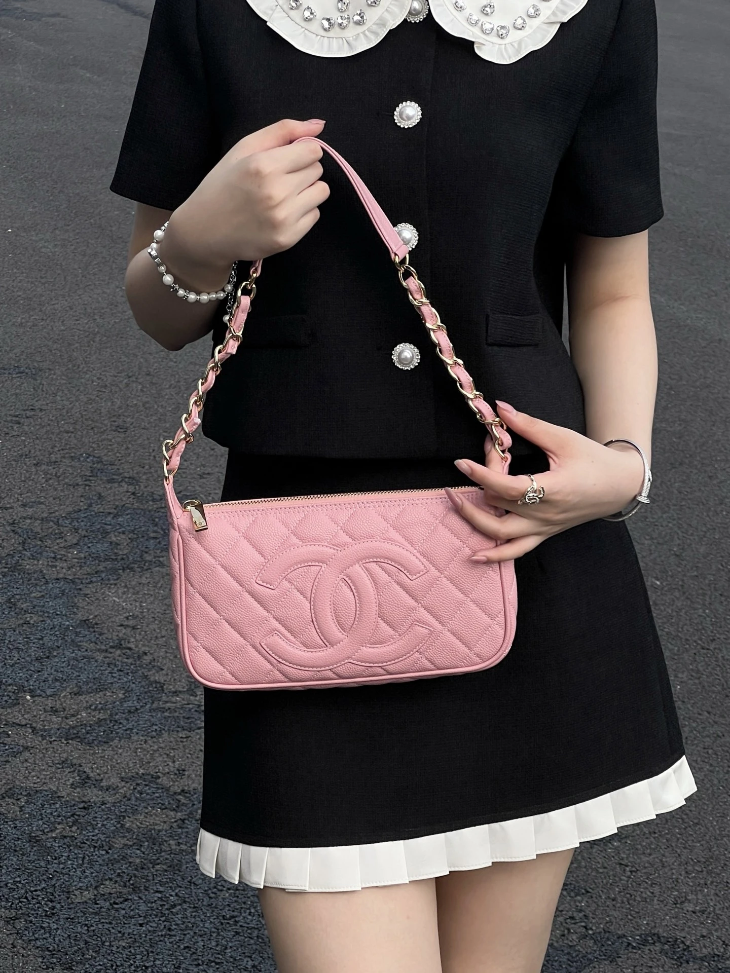 Компактная форма идеально подходит для городских образов и особых случаев. Сумка оснащена изящной золотистой цепочкой с кожаной вставкой, которая позволяет носить аксессуар на плече или в руке.
