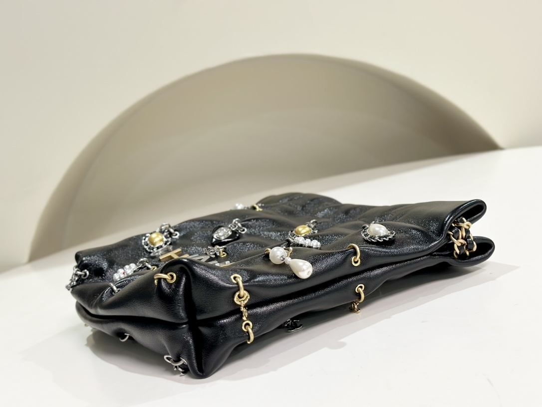 • Декор: цепочка из металла с подвесками и жемчугом, крупный логотип CHANEL
