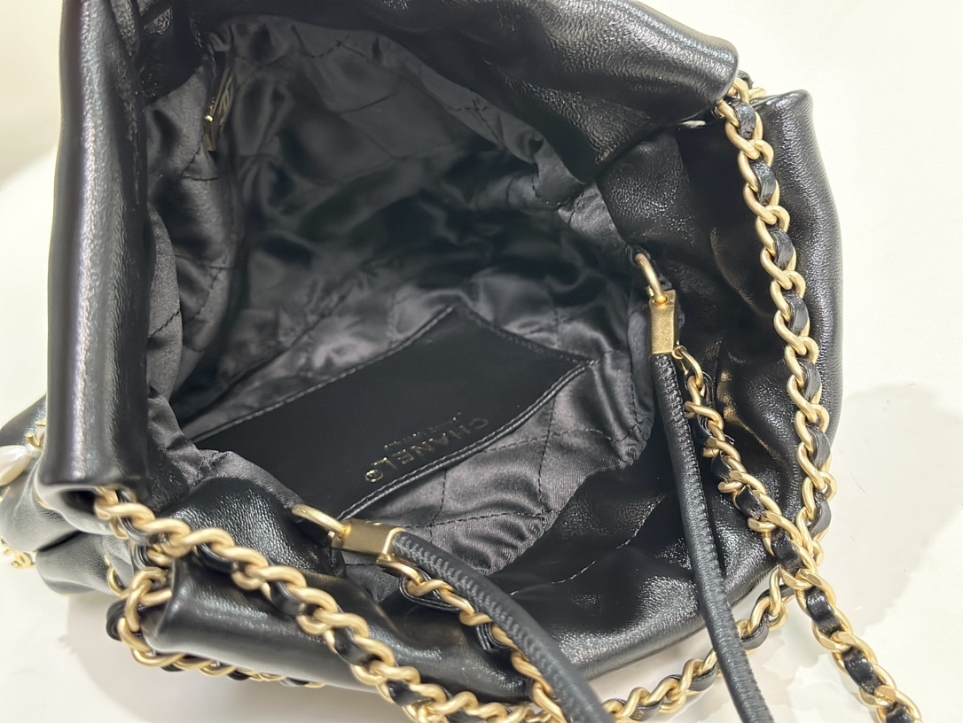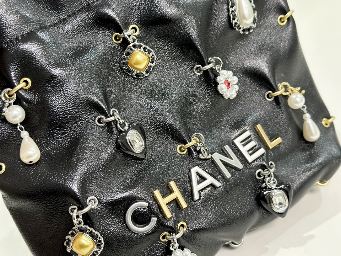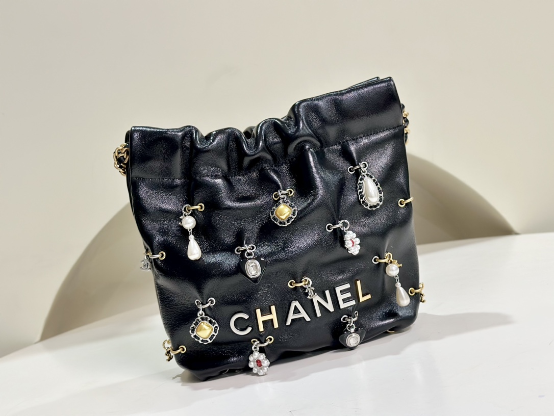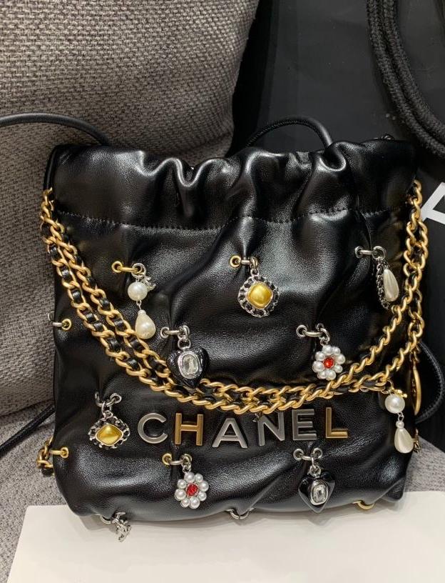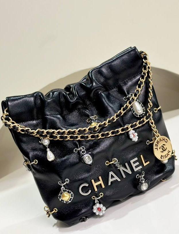 Откройте для себя культовую мини-сумку Chanel 22 — идеальный аксессуар для современных и стильных девушек. Модель выполнена из мягкой черной кожи с эффектом легкой сборки, декорирована золотистой цепочкой и изысканными подвесками с логотипом и жемчужинами. На лицевой стороне — узнаваемая эмблема "CHANEL", придающая сумке узнаваемый фирменный стиль.