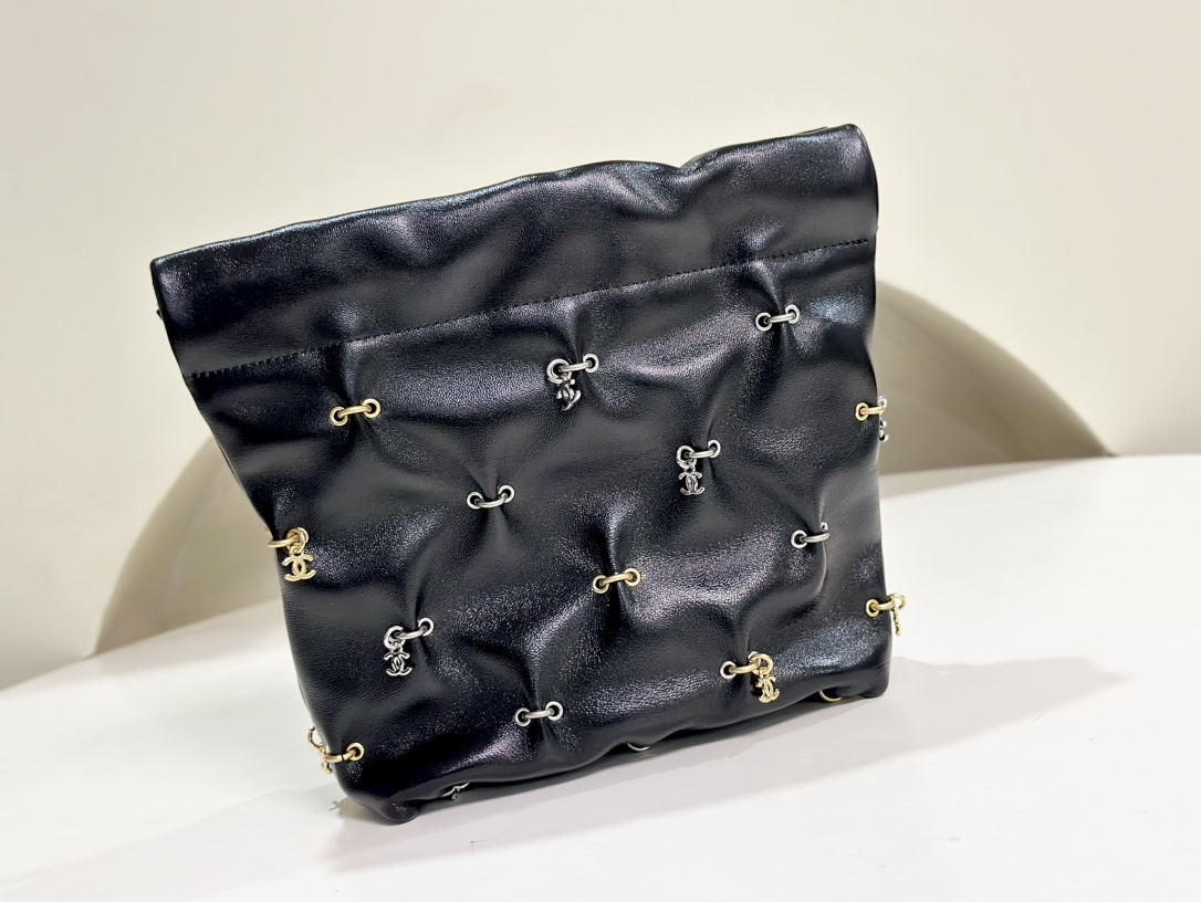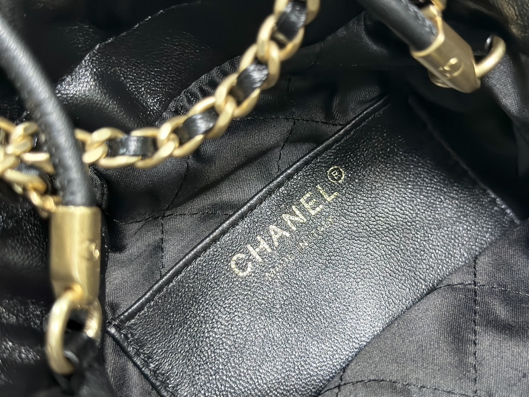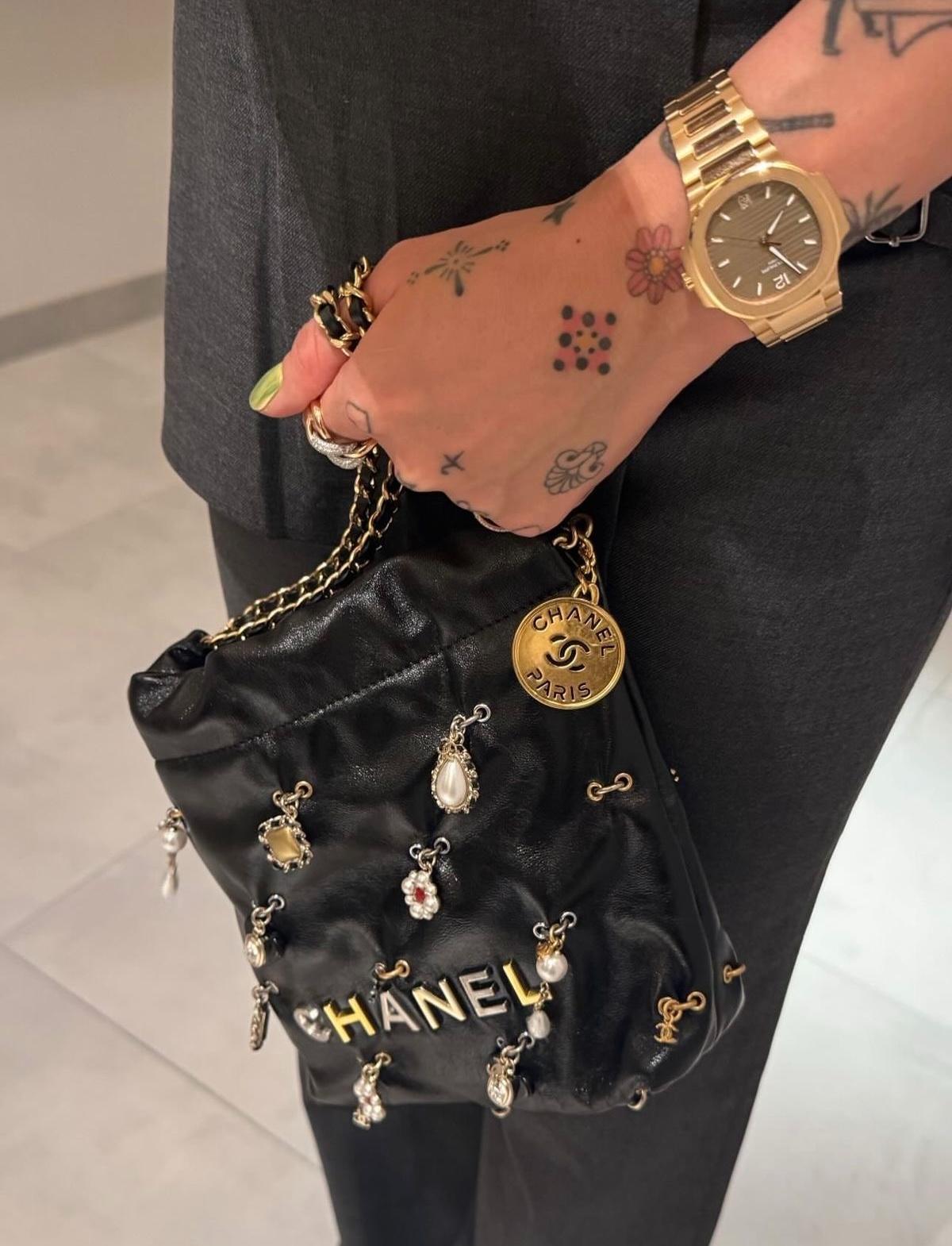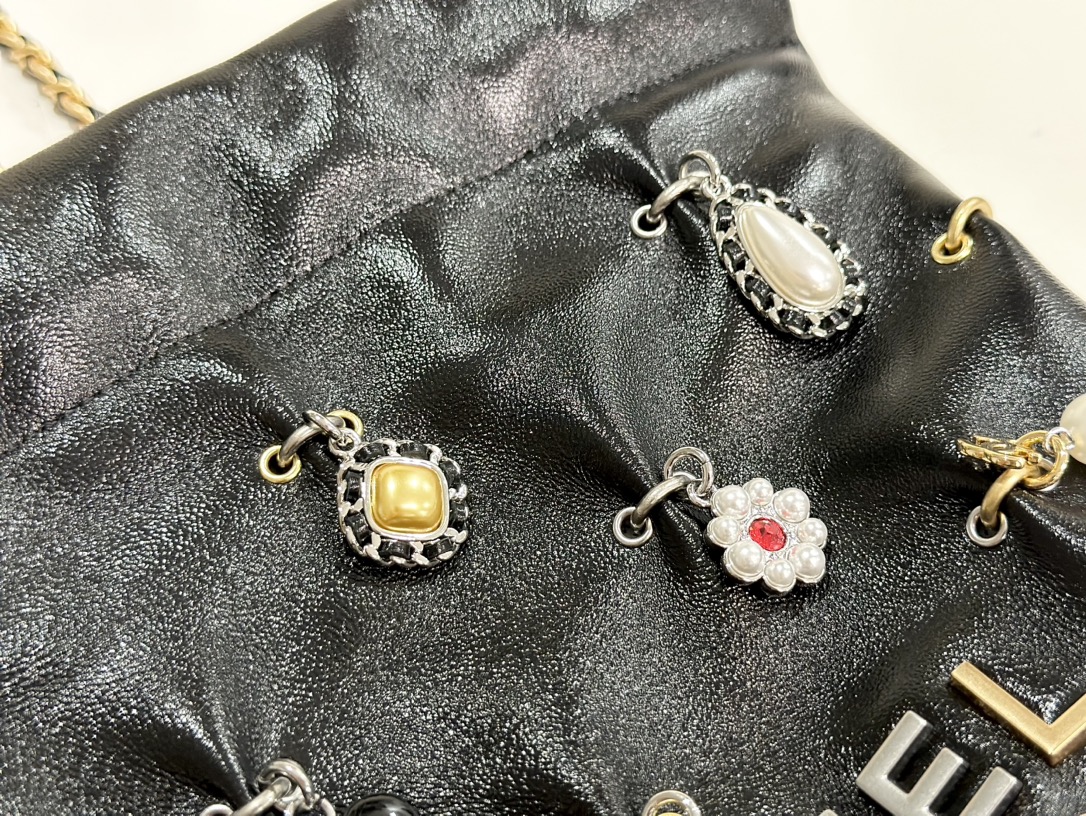Откройте для себя культовую мини-сумку Chanel 22 — идеальный аксессуар для современных и стильных девушек. Модель выполнена из мягкой черной кожи с эффектом легкой сборки, декорирована золотистой цепочкой и изысканными подвесками с логотипом и жемчужинами. На лицевой стороне — узнаваемая эмблема "CHANEL", придающая сумке узнаваемый фирменный стиль.