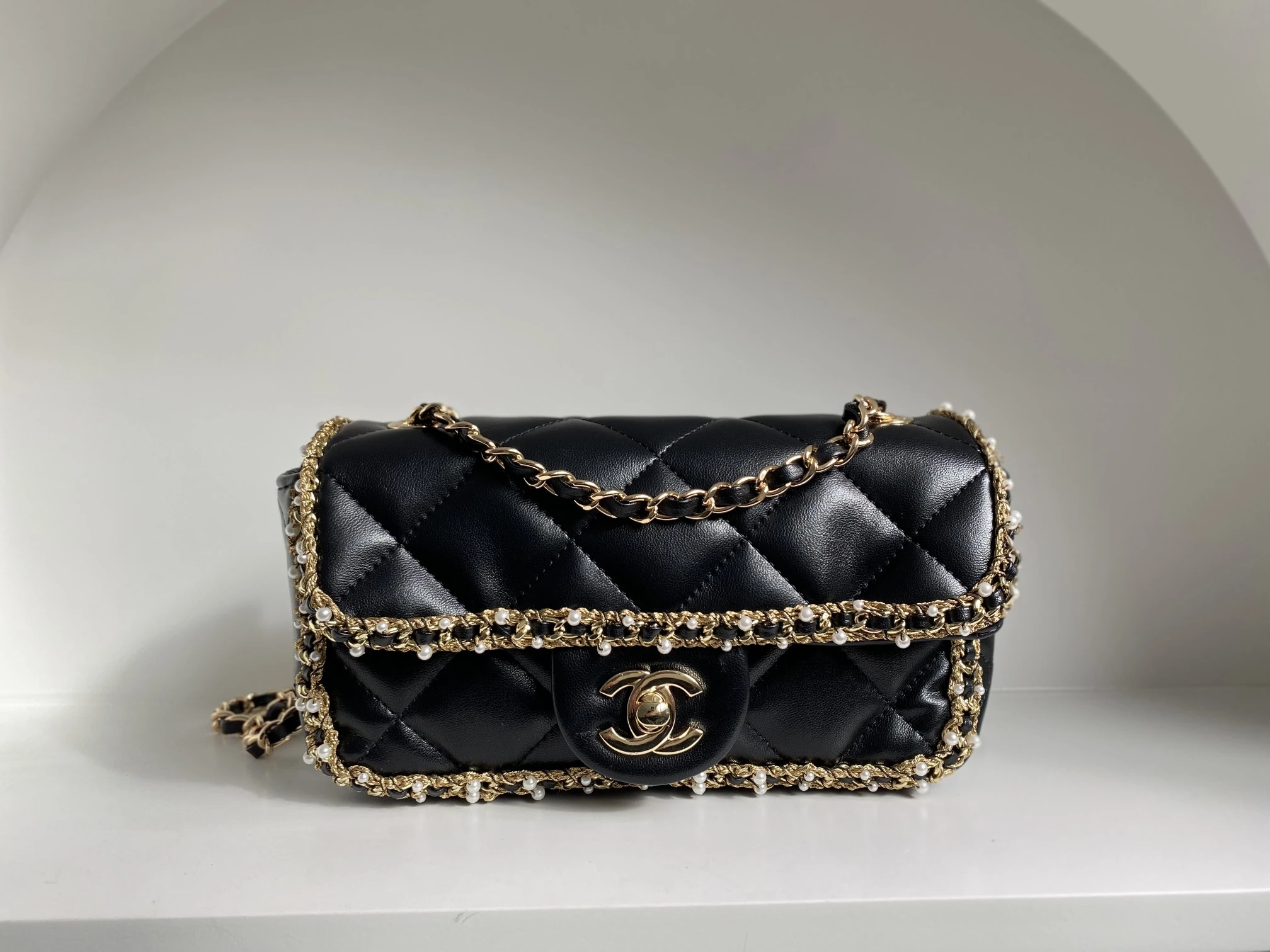 Элегантная винтажная сумка Chanel, выполненная из мягкой овчины, станет вашим идеальным аксессуаром. Классический черный цвет, культовая стеганая поверхность и декор в виде золотистой цепочки с жемчужинами по контуру придают изделию утончённость и роскошь. Фирменная застёжка с логотипом Chanel подчеркнёт ваш изысканный вкус. Компактный размер сумки 21-12-7.5 см позволяет носить её как на вечерние мероприятия, так и в повседневной жизни. Стильная и практичная, эта сумка станет достойным дополнением вашей коллекции.