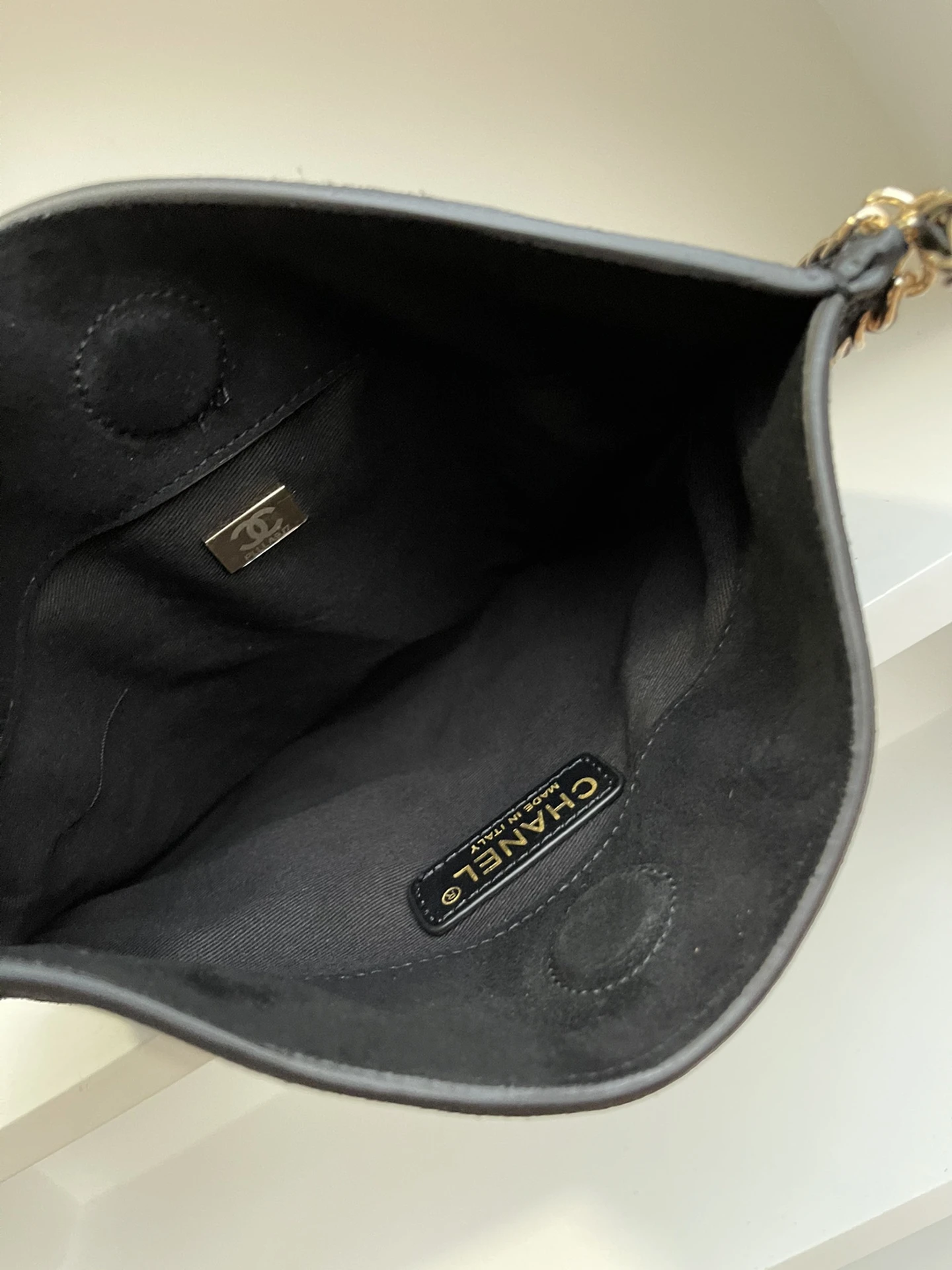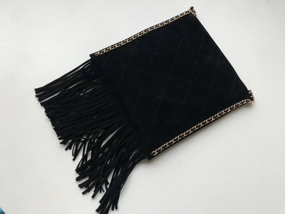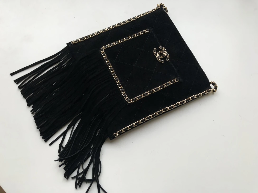 Погрузитесь в мир истинной элегантности с этой роскошной сумкой Chanel. Модель выполнена из бархатистой чёрной замши, украшена изысканной кружевной отделкой и фирменной стёжкой. Акцентом дизайна служат длинные замшевые кисточки, придающие образу стильную динамику и оригинальность.