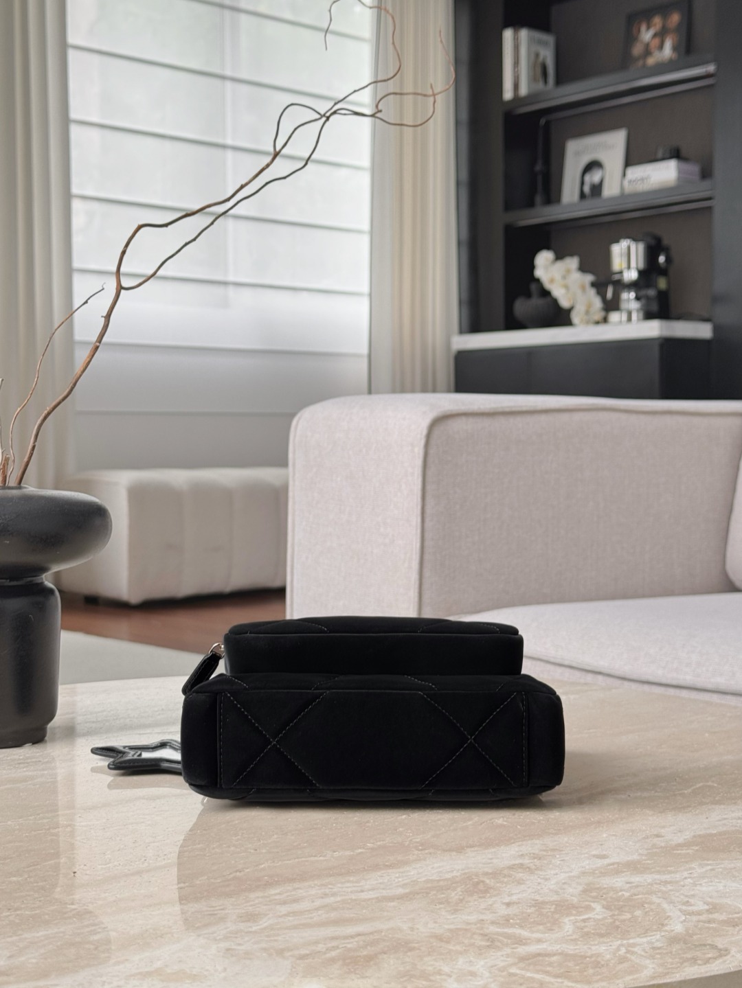 • Материалы и фурнитура: Мягкая фактура в сочетании с золотистой цепочной ручкой, переплетающейся с кожаной лентой, создаёт роскошный контраст черного и металла. Застёжки и молнии выполнены в тёплом золотистом тоне, обеспечивая гармоничный и дорогой вид.