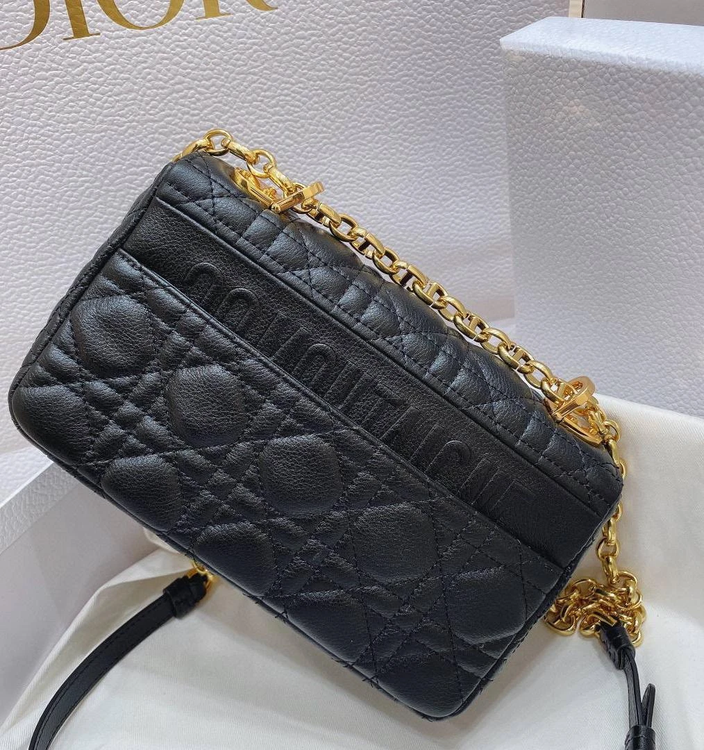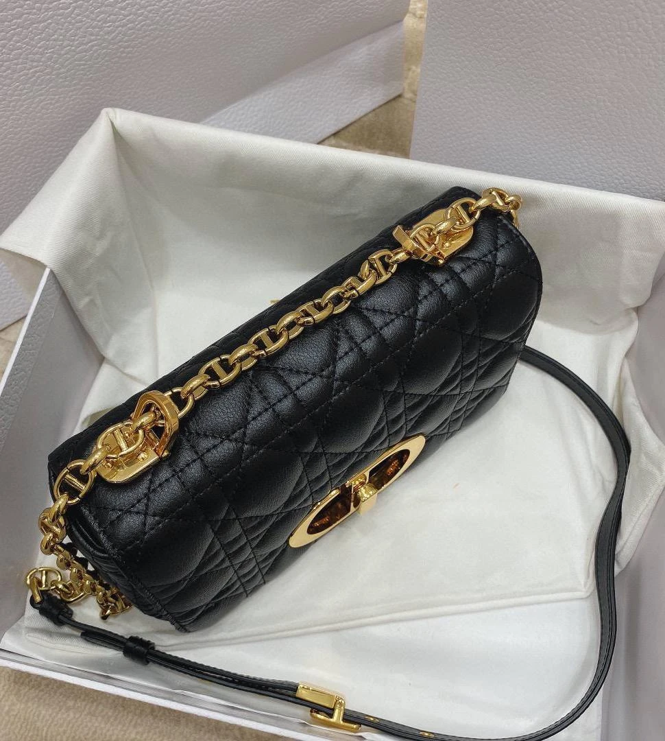 Элементы золотистого фурнитуры, включая крупную застежку в виде логотипа Dior, добавляют роскоши и изысканности. Сумка оснащена регулируемой цепочной ручкой, что позволяет носить её как в руке, так и на плече.
