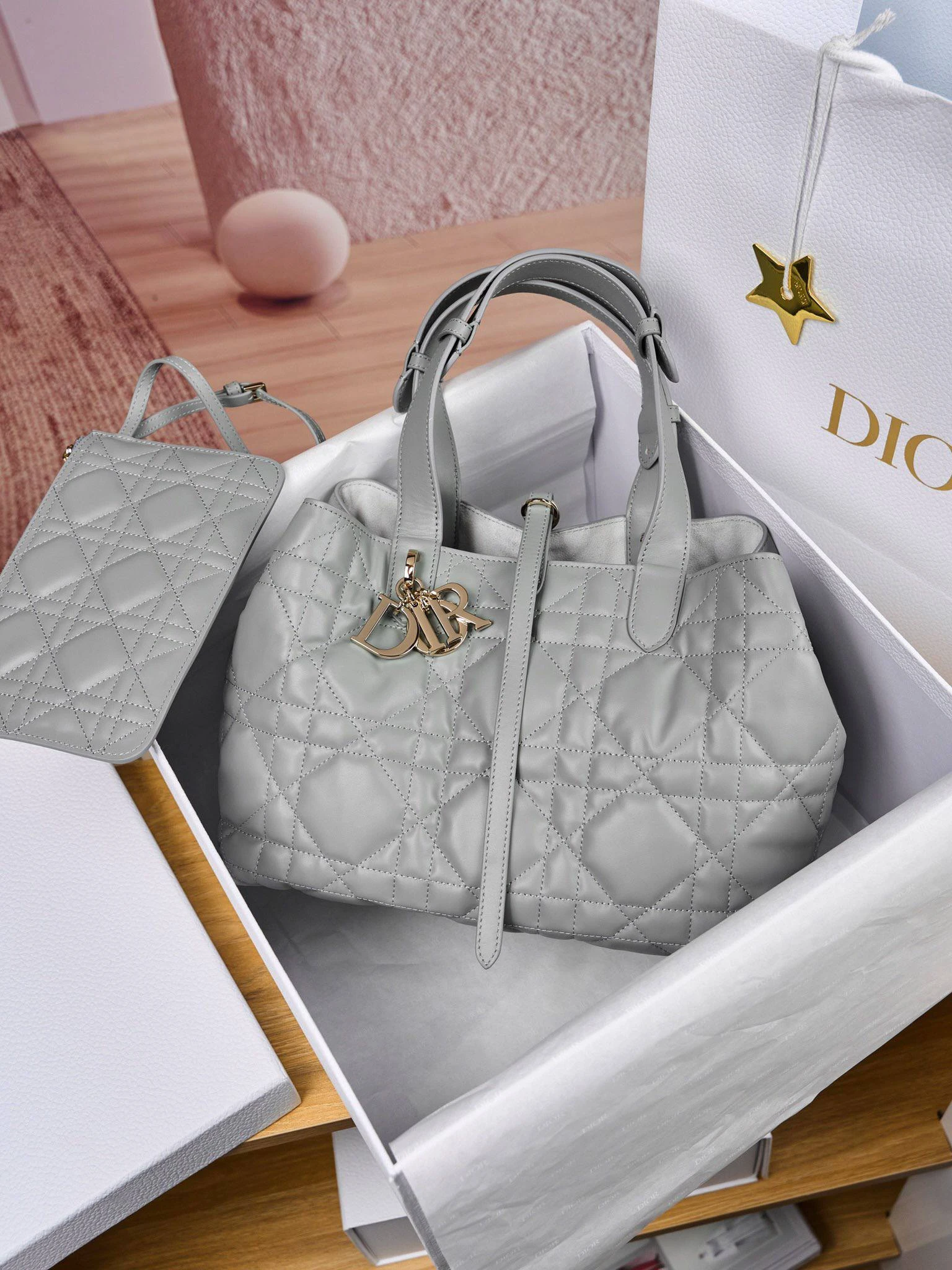 Сумка Christian Dior Toujours — это воплощение элегантности и утончённого стиля. Выполненная из мягкой кожи нежного серого оттенка, она украшена культовой стёжкой Cannage, которая подчёркивает её изысканный дизайн.
