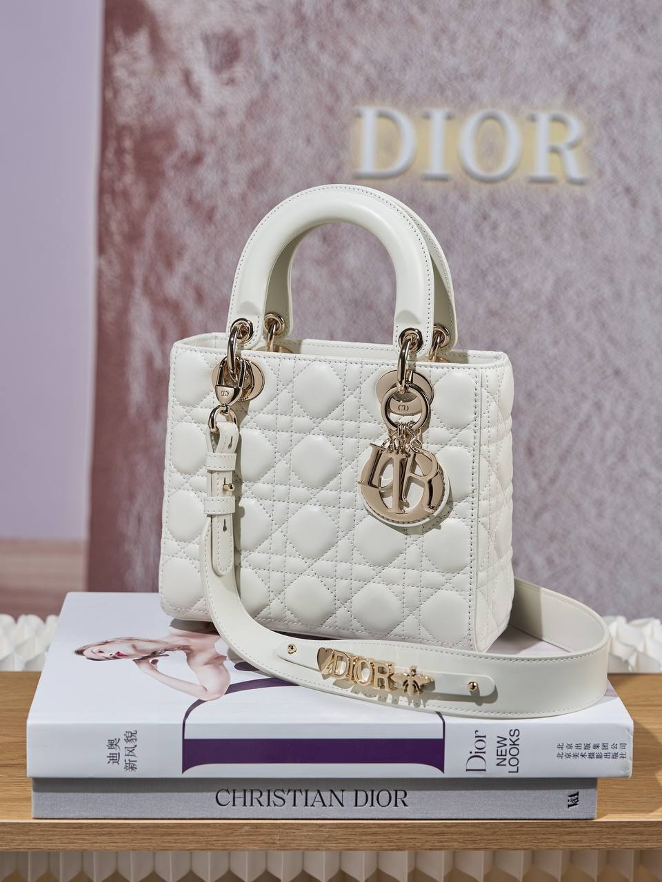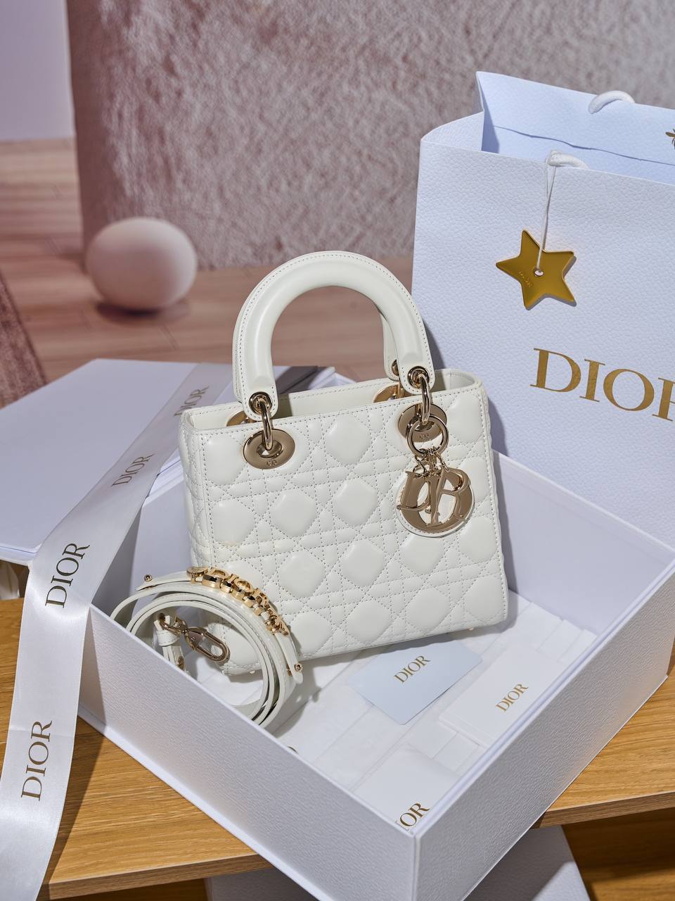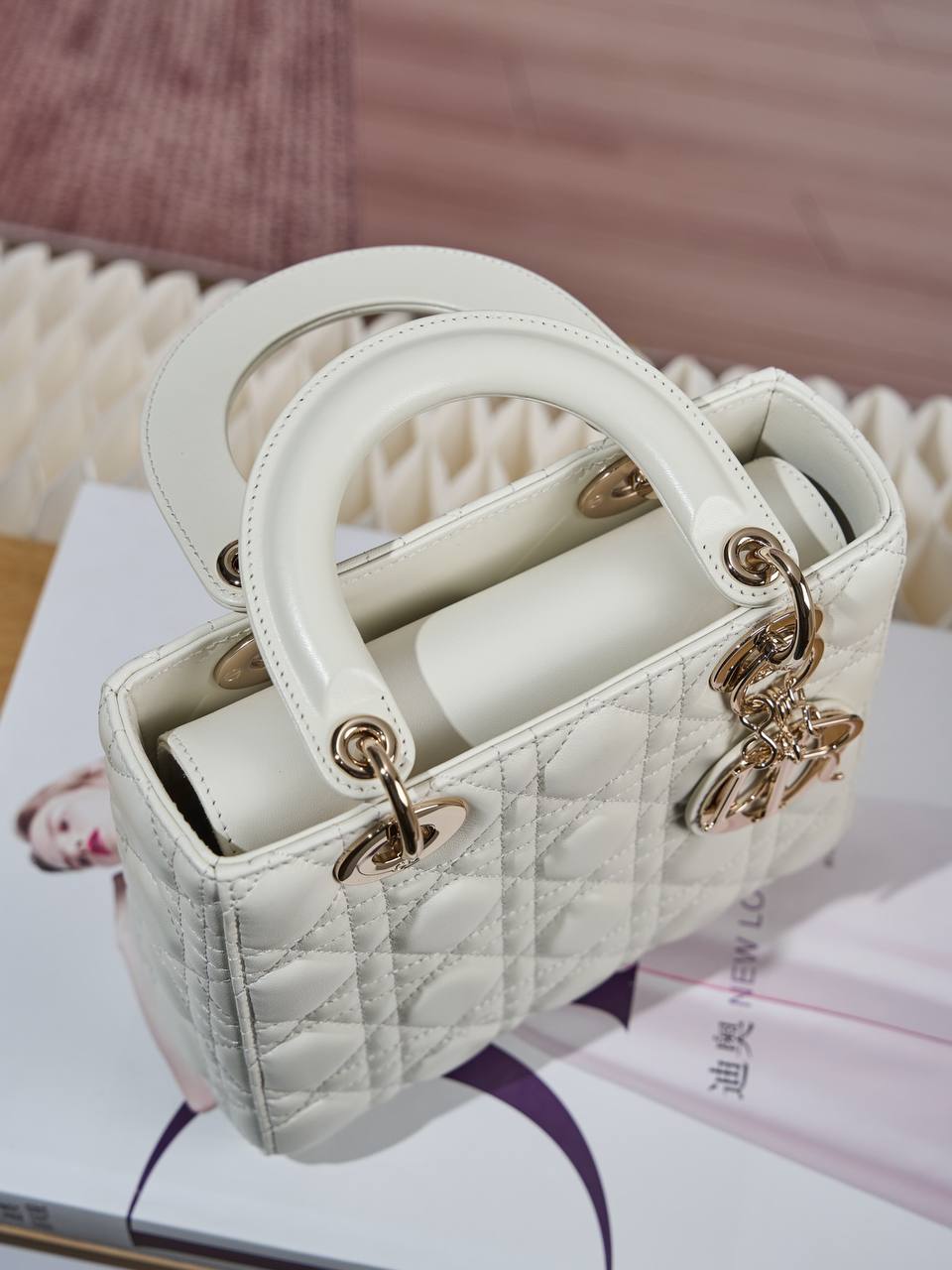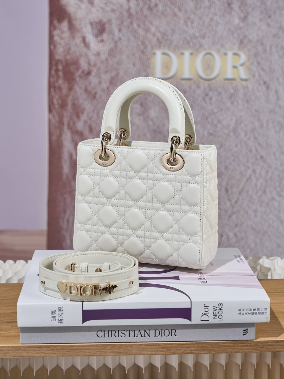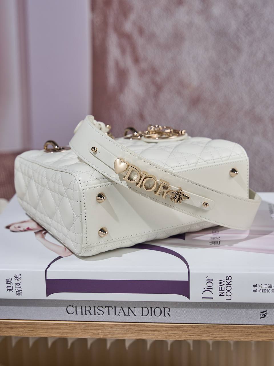 Сумка украшена культовыми подвесками с буквами DIOR в золотистом цвете, которые добавляют изысканный штрих. Жёсткая ручка позволяет носить сумку в руке, а съёмный регулируемый плечевой ремень с декором даёт возможность носить её на плече или через плечо, создавая разные образы под настроение.