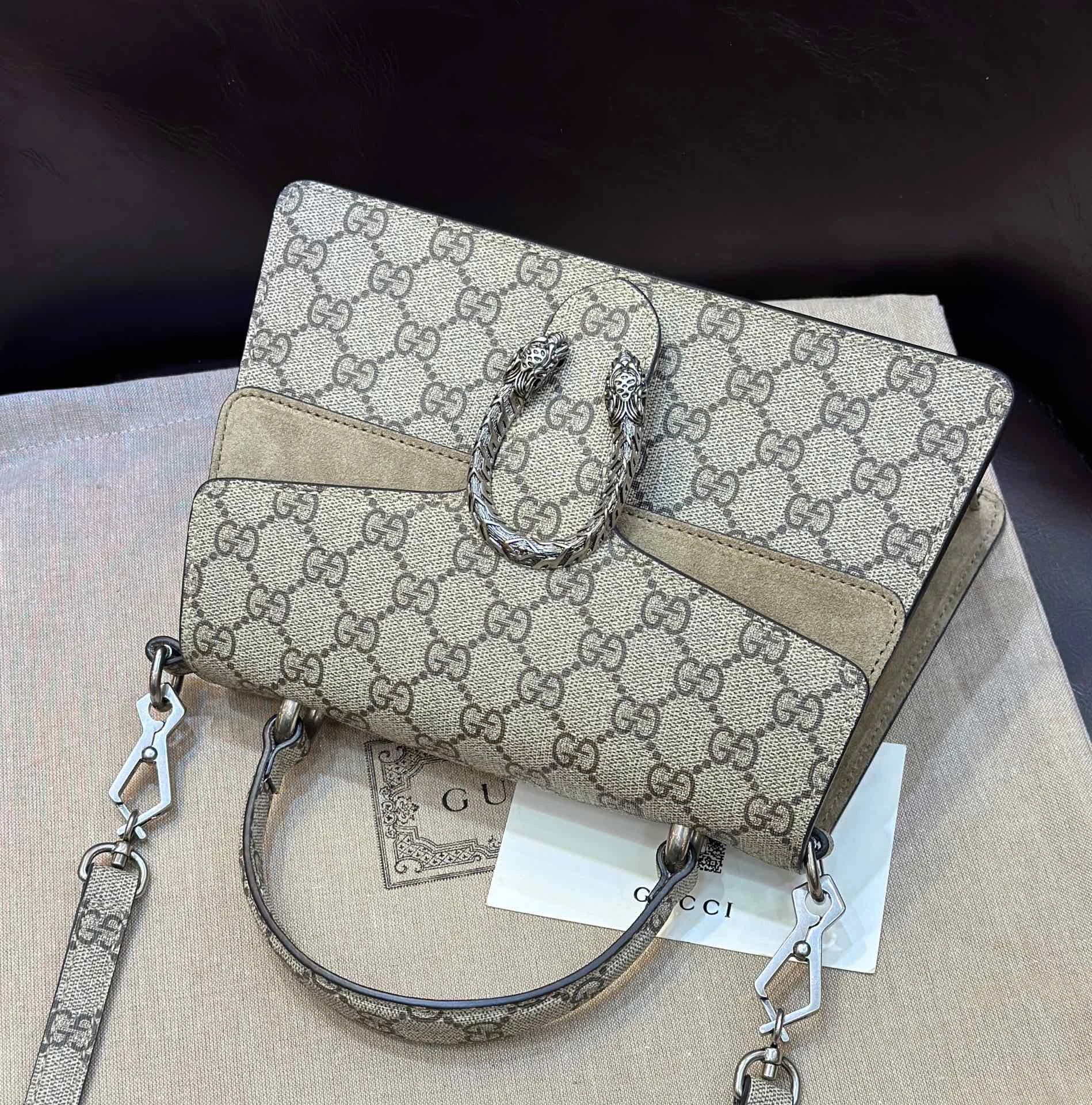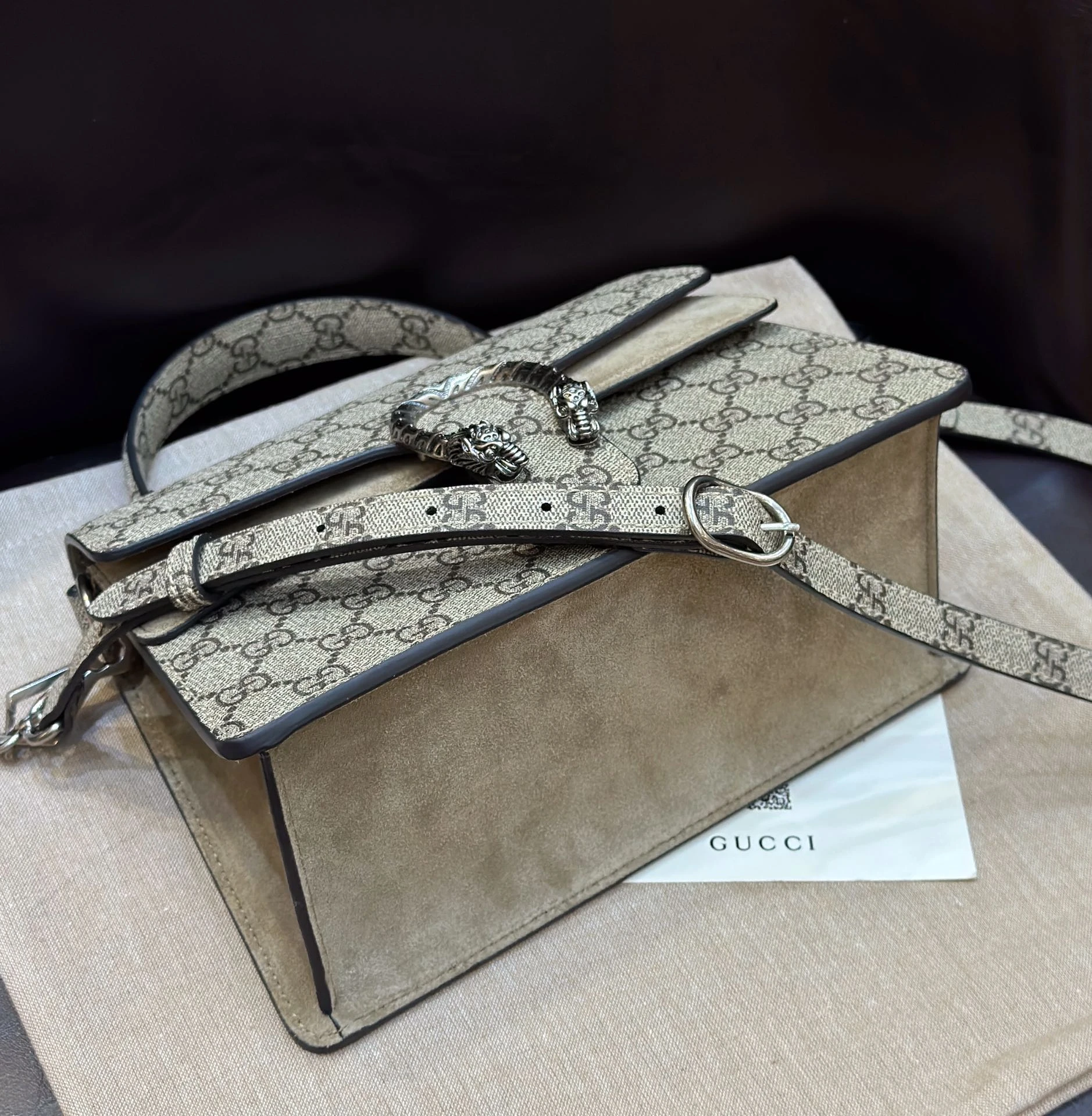 Иконическая сумка Gucci Dionysus в GG Supreme канвасе с серебристой фурнитурой в виде тигрового замка, топ‑хендлом и регулируемым плечевым ремнём. Стильная и практичная — идеальна для дня и вечера.