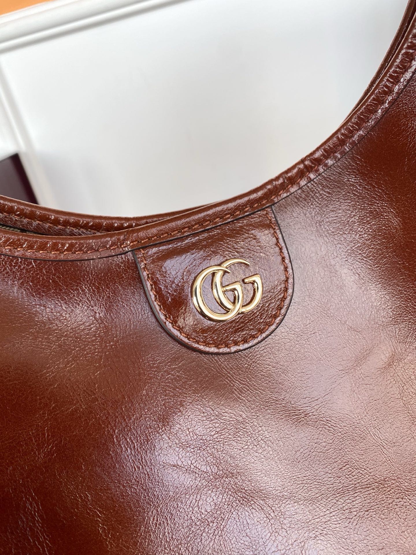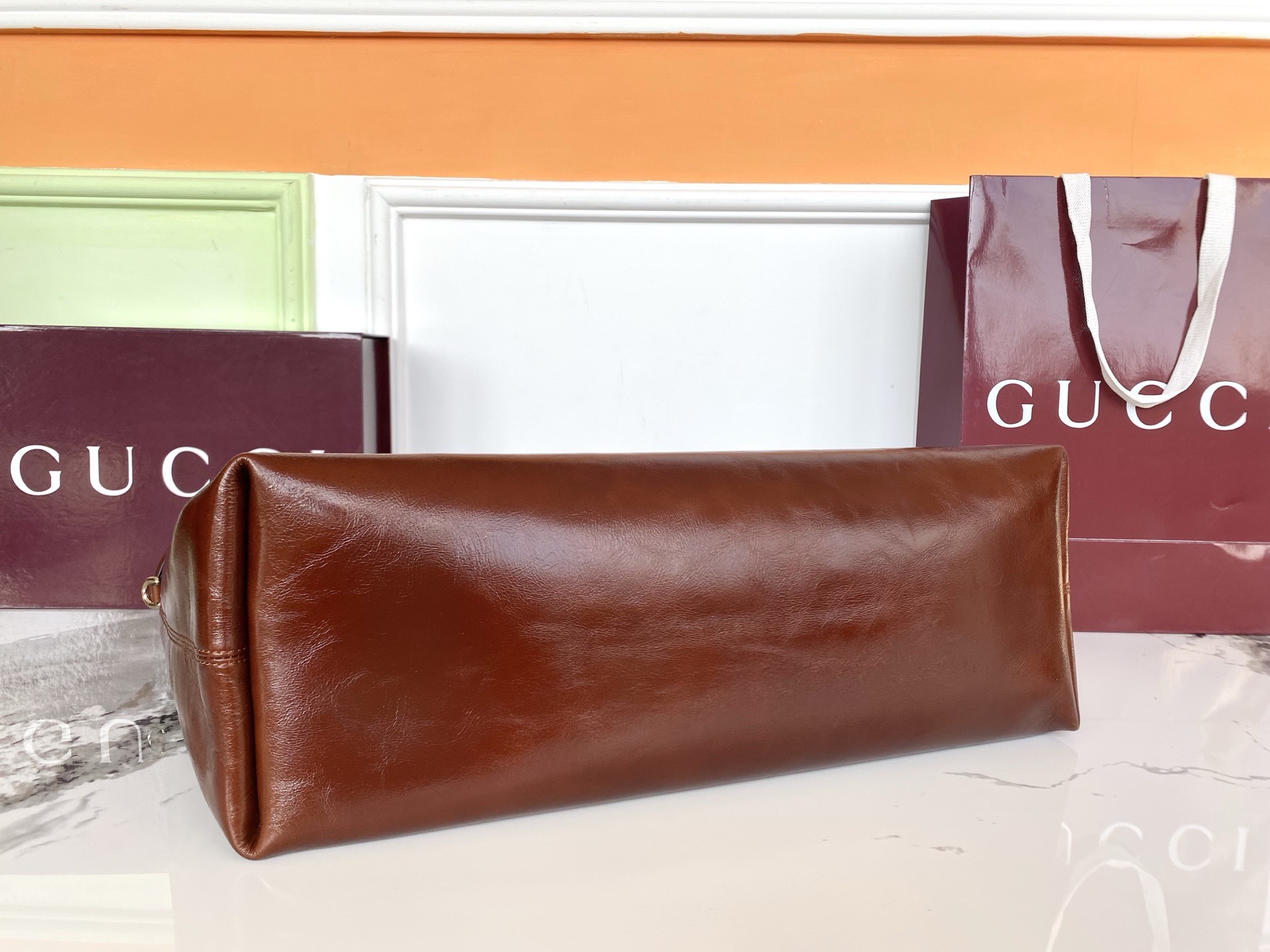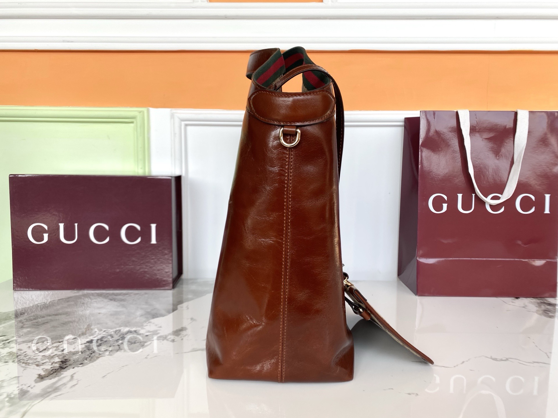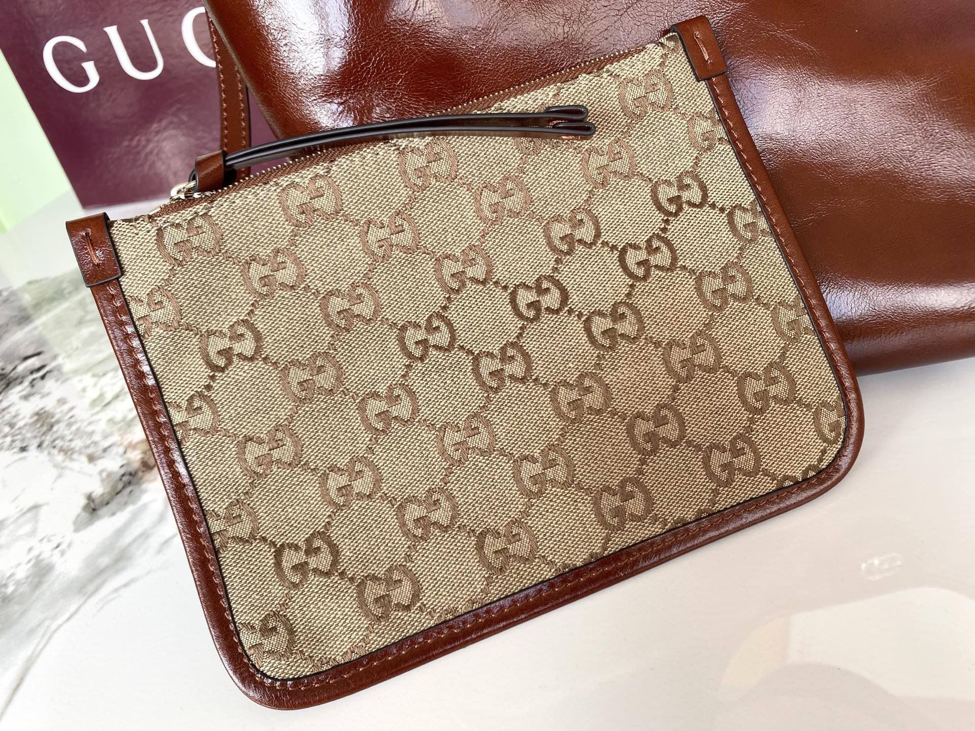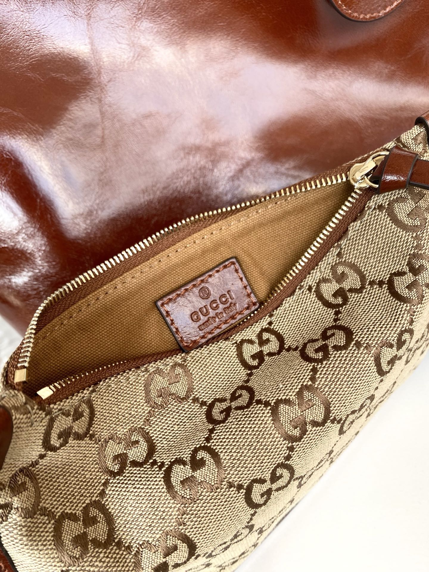 Фирменный логотип GG на передней панели подчёркивает узнаваемый стиль Gucci, а внутренняя отделка с характерными зелёно-красными акцентами добавляет премиальный штрих. Удобная ручка позволяет комфортно носить сумку на плече или в руке.