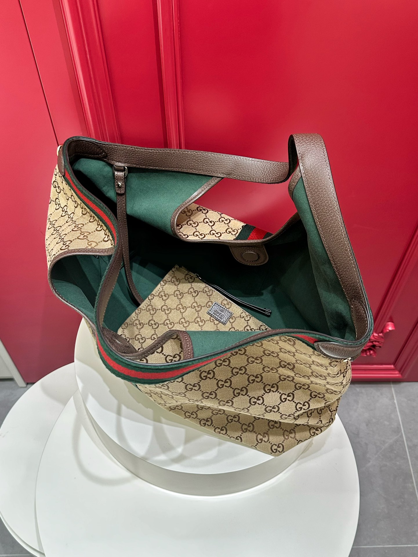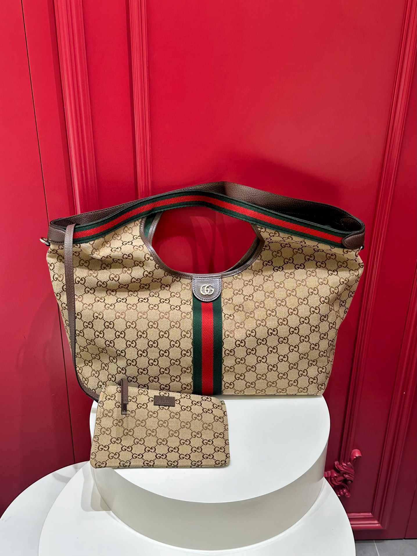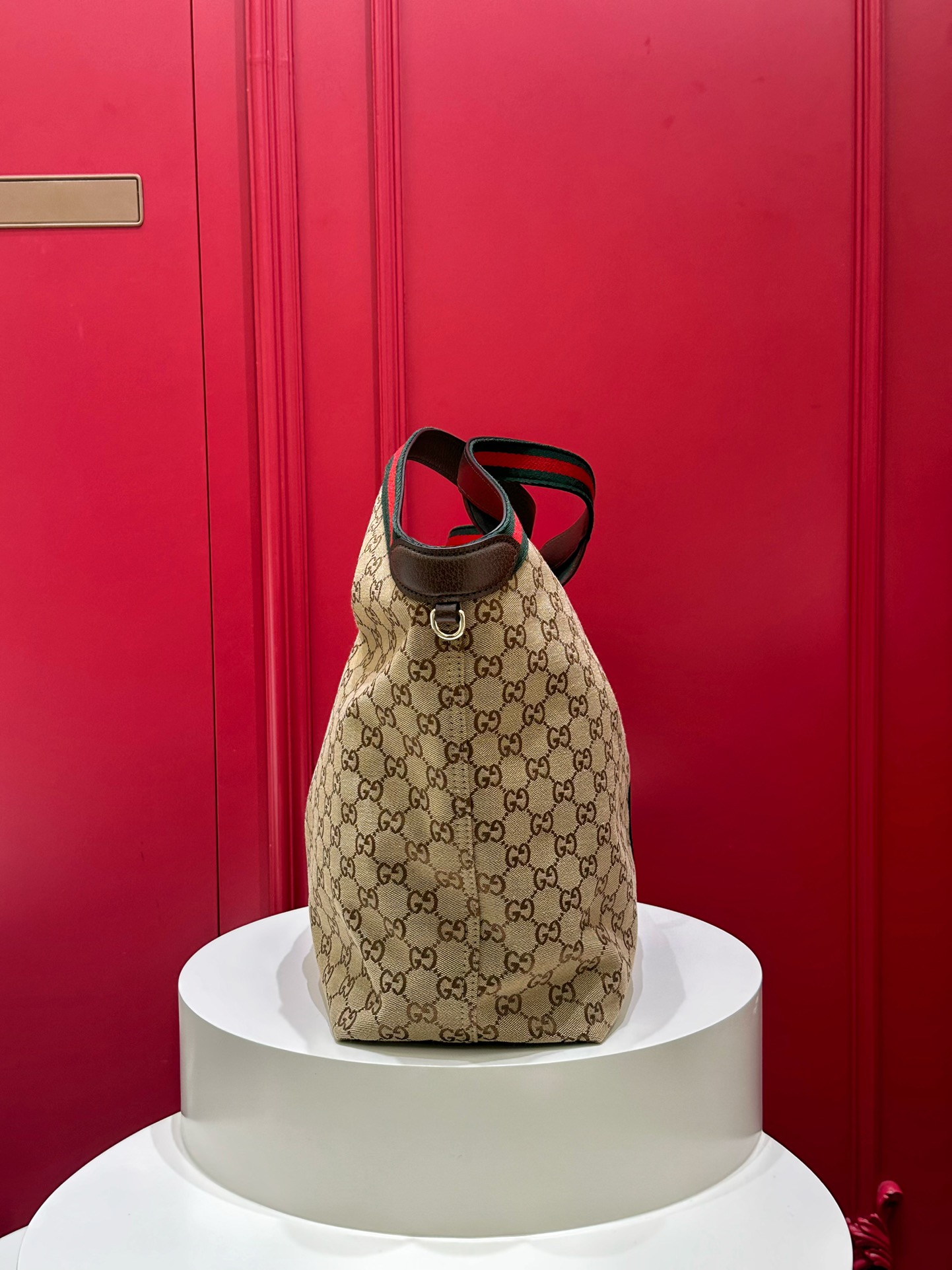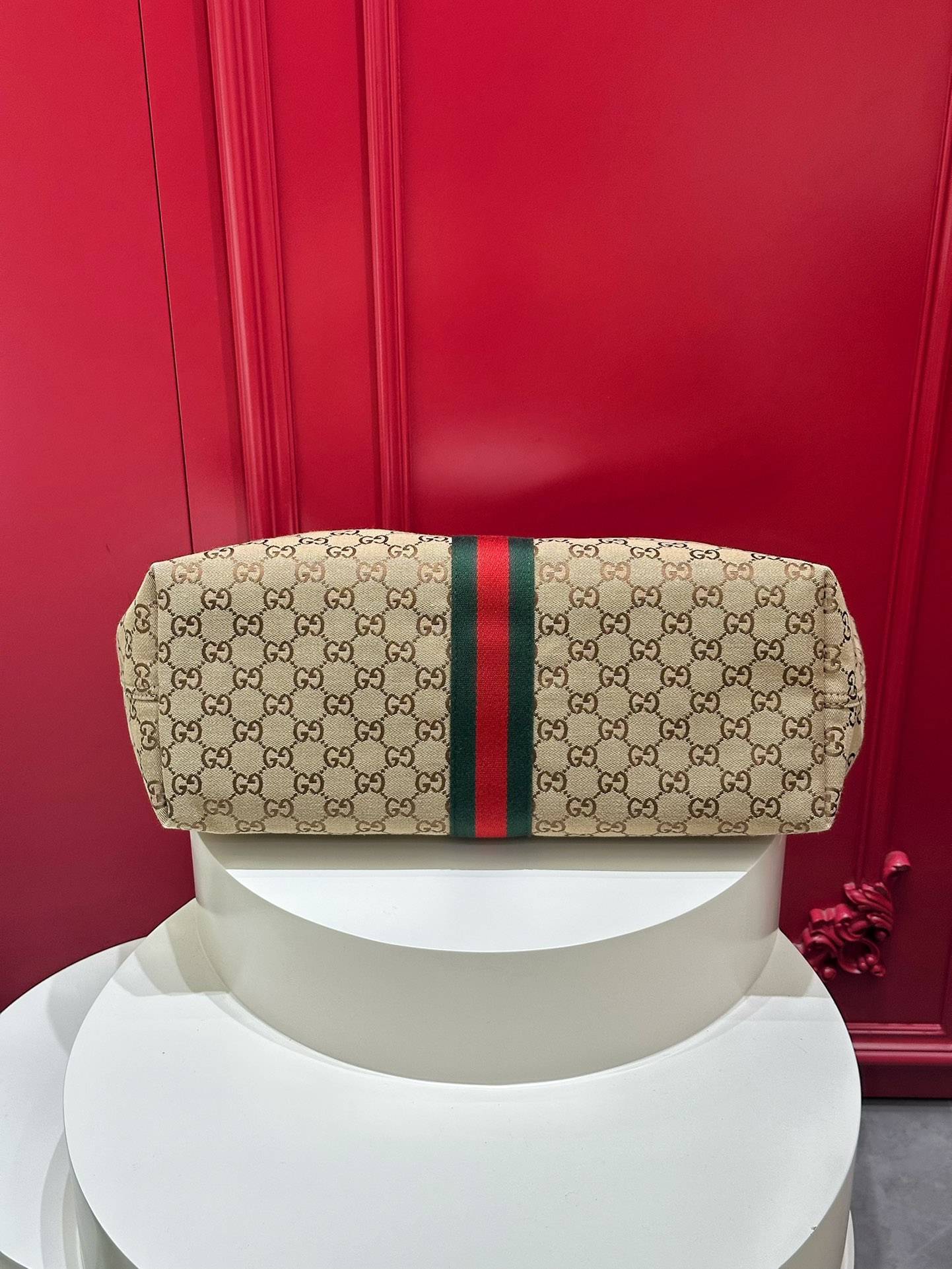 Сумка выполнена из прочного бежевого GG canvas с коричневыми кожаными акцентами и широкой Web-полосой сбоку для узнаваемого Gucci-стиля. Золотистая фурнитура с двойным G-логотипом дополняет минималистичный силуэт, а магнитная застежка обеспечивает удобство.