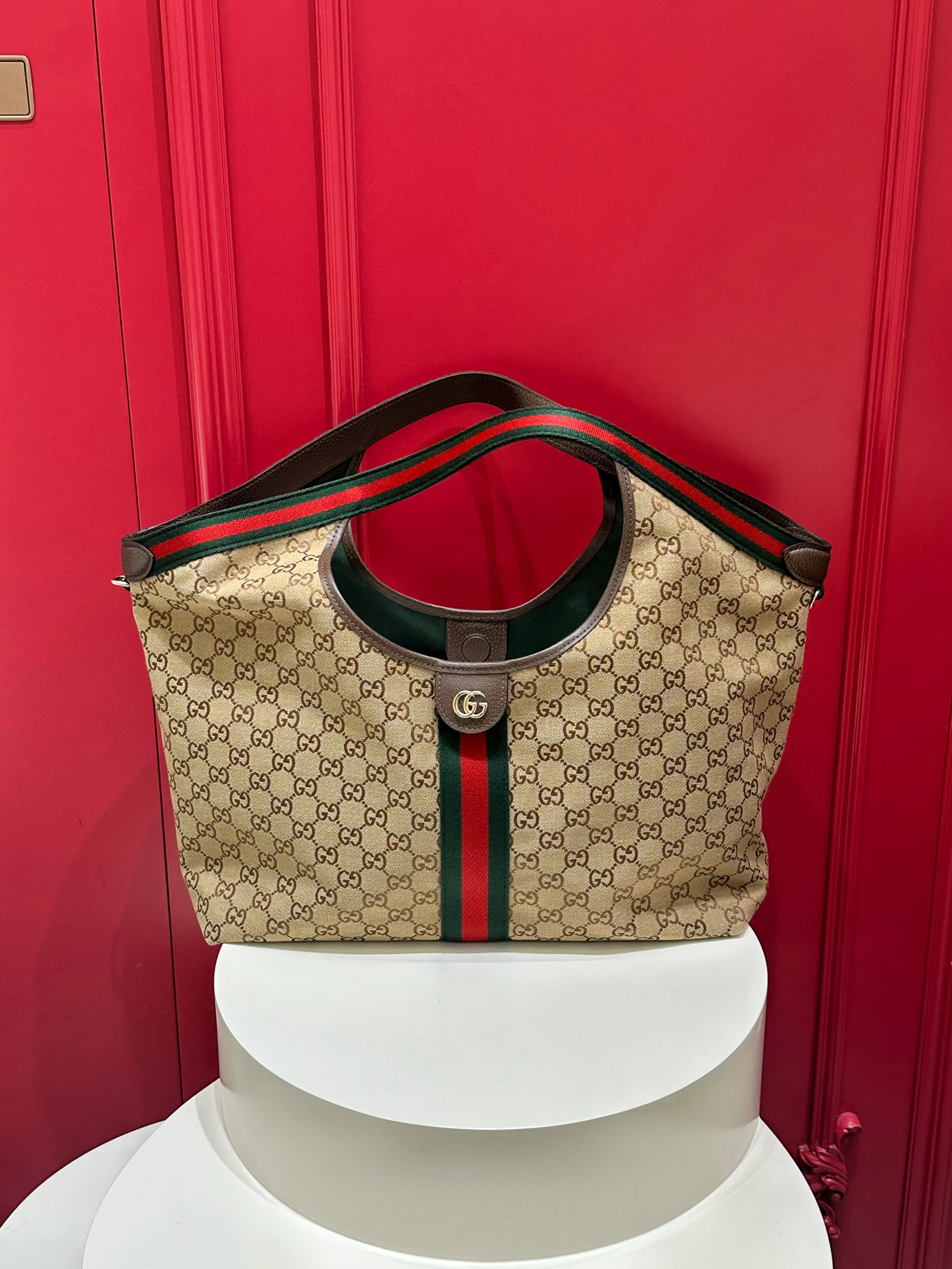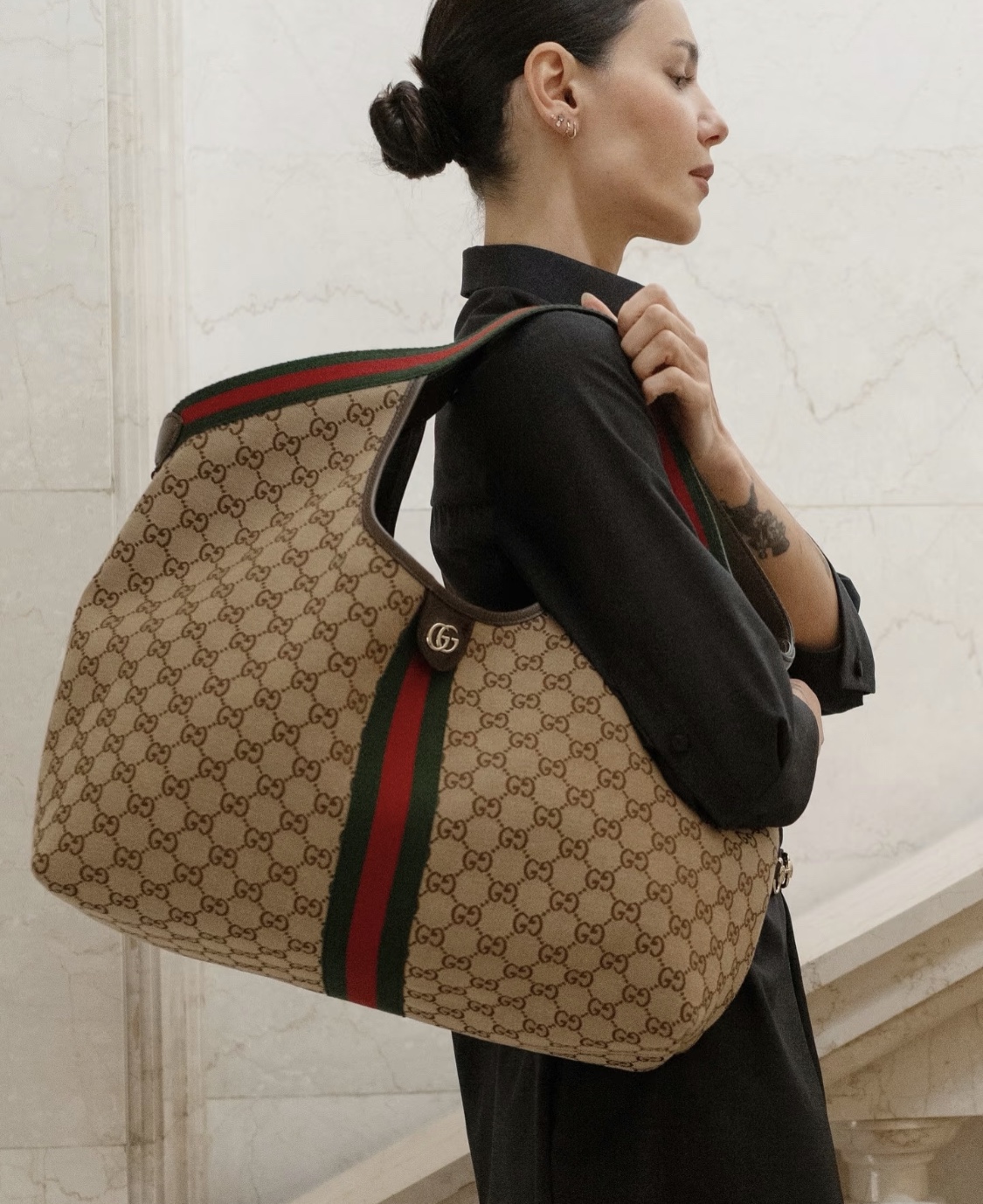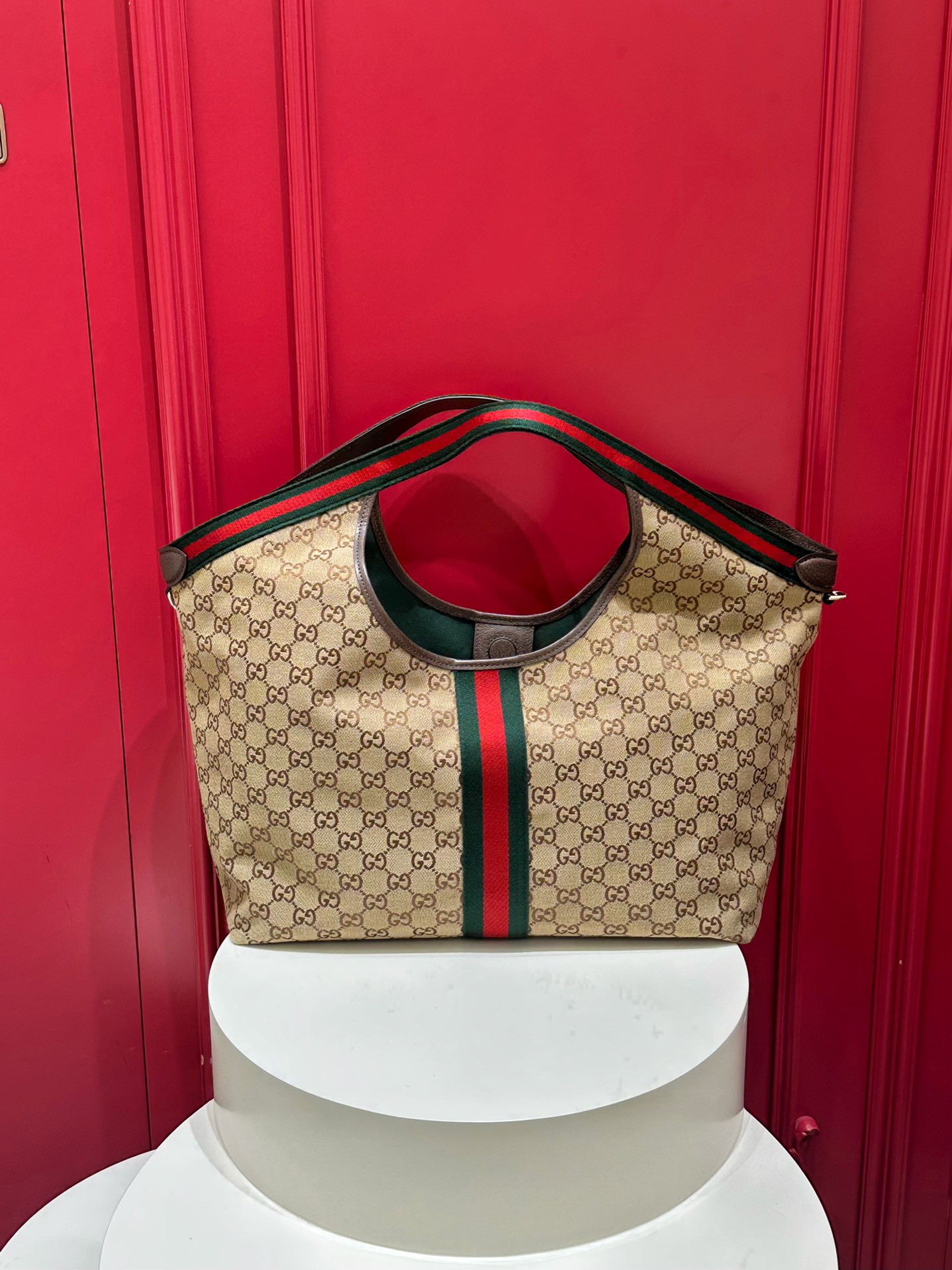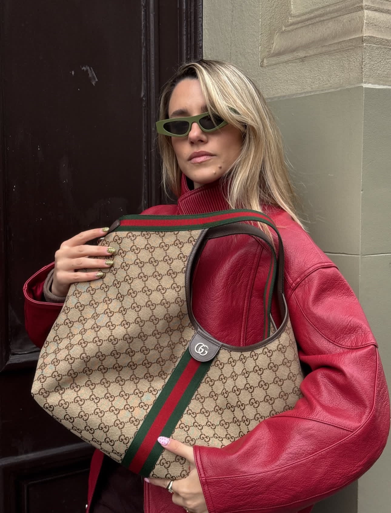 Элегантная сумка Gucci Giglio large tote в бежевом GG canvas идеально сочетает классику и современность. Эта модель, представленная на показе Cruise 2026, отдает дань флорентийским корням бренда с использованием знакового монохромного узора GG и зеленой-красной Web-отделки.