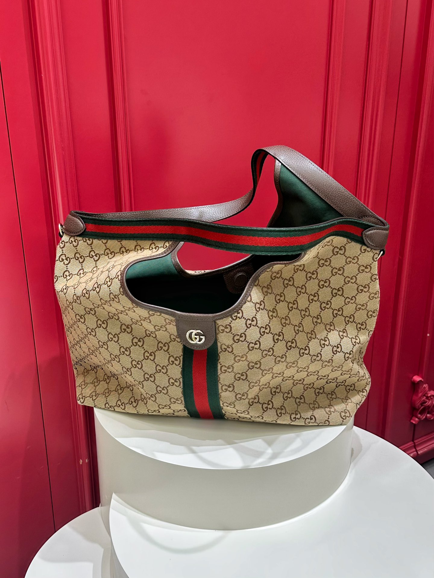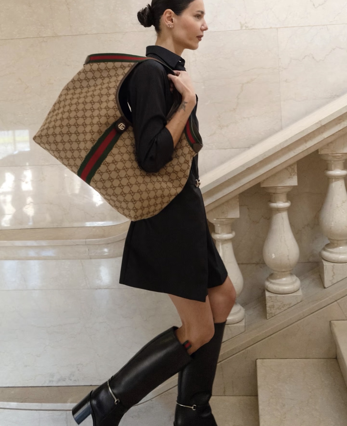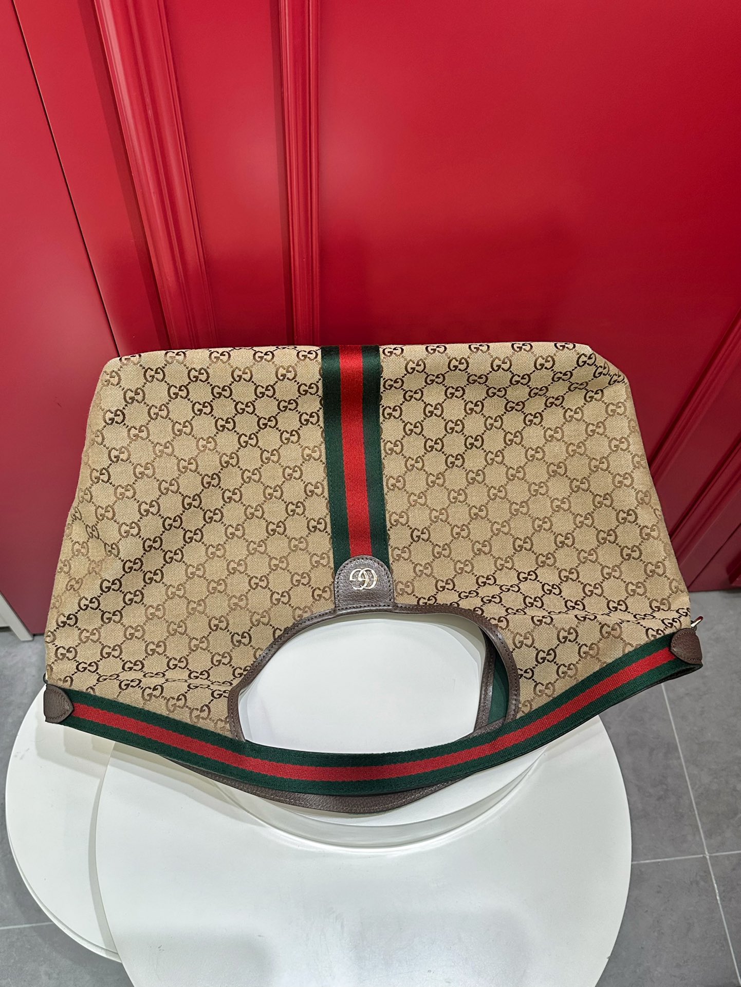 Элегантная сумка Gucci Giglio large tote в бежевом GG canvas идеально сочетает классику и современность. Эта модель, представленная на показе Cruise 2026, отдает дань флорентийским корням бренда с использованием знакового монохромного узора GG и зеленой-красной Web-отделки.