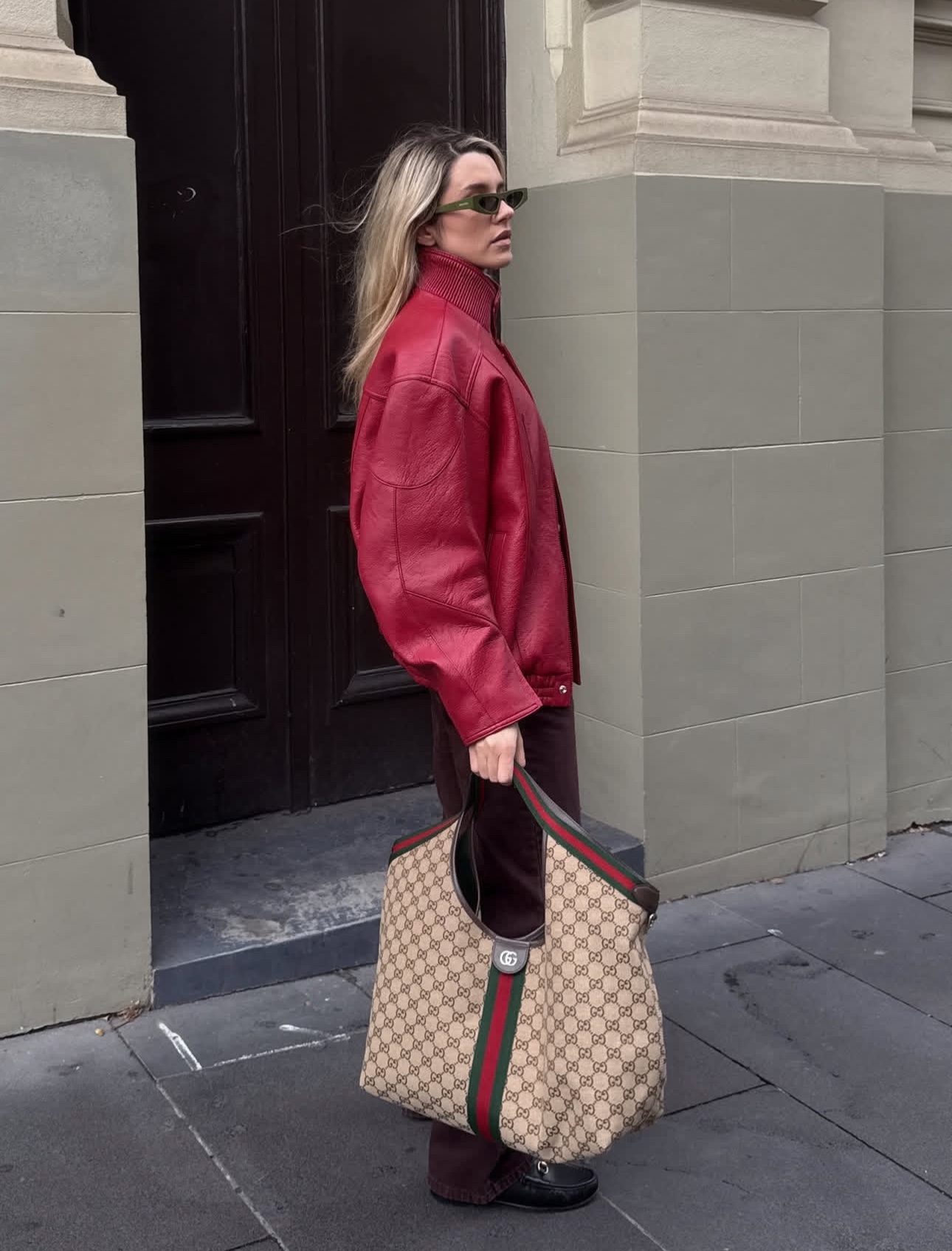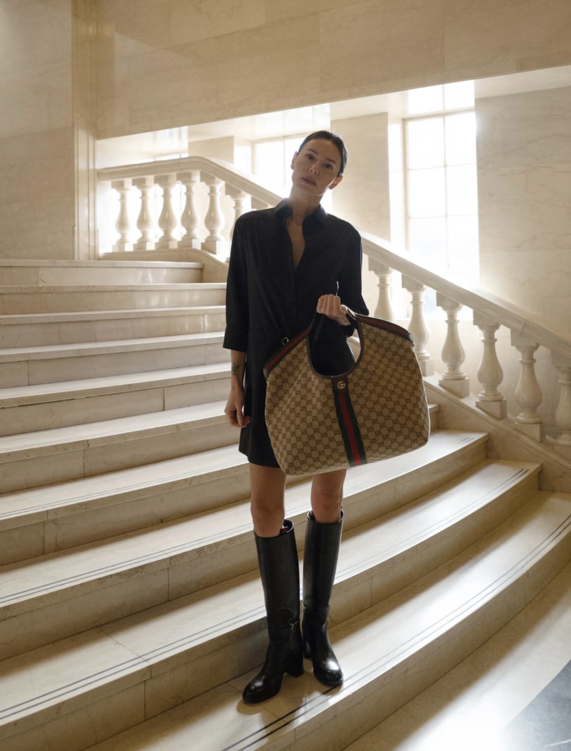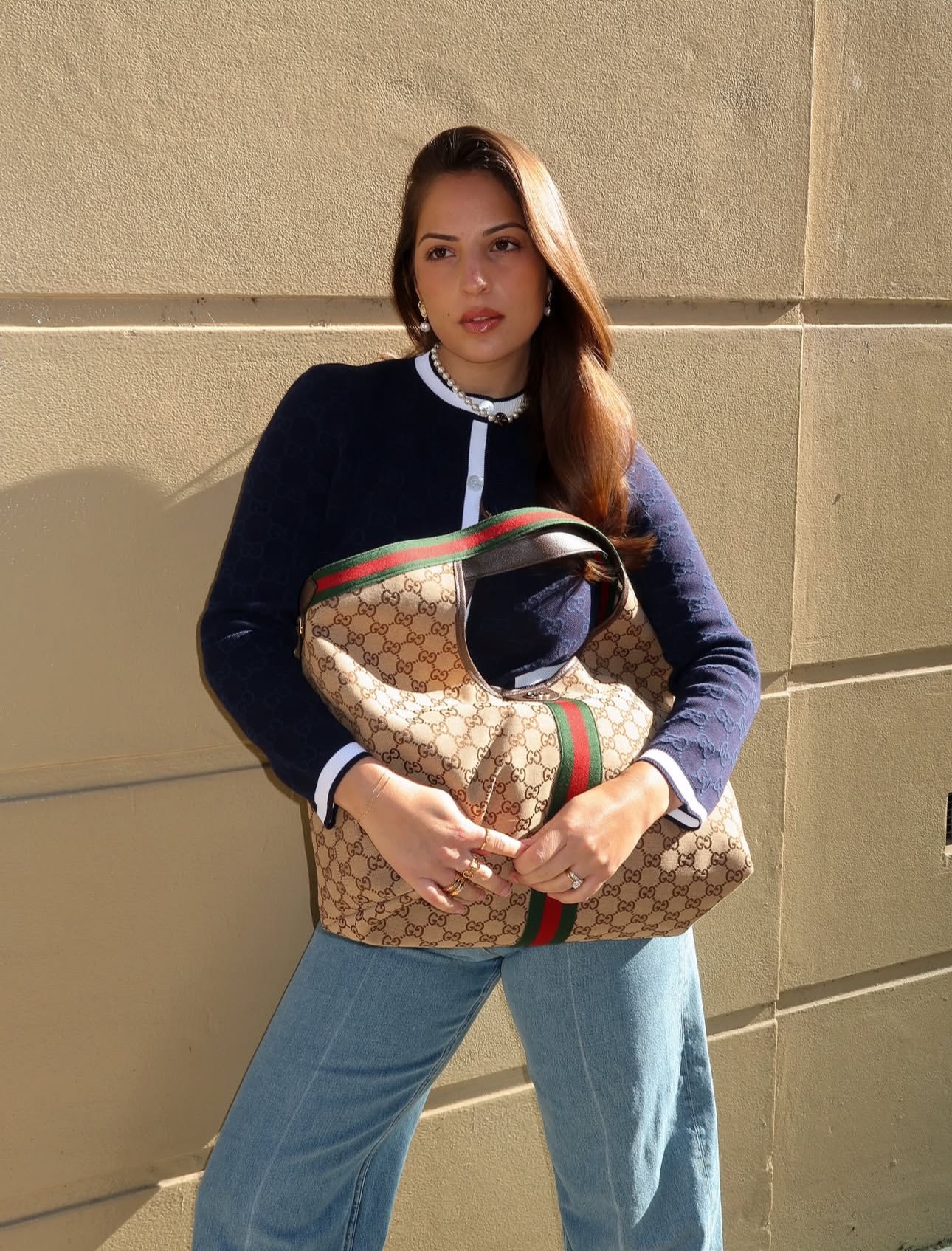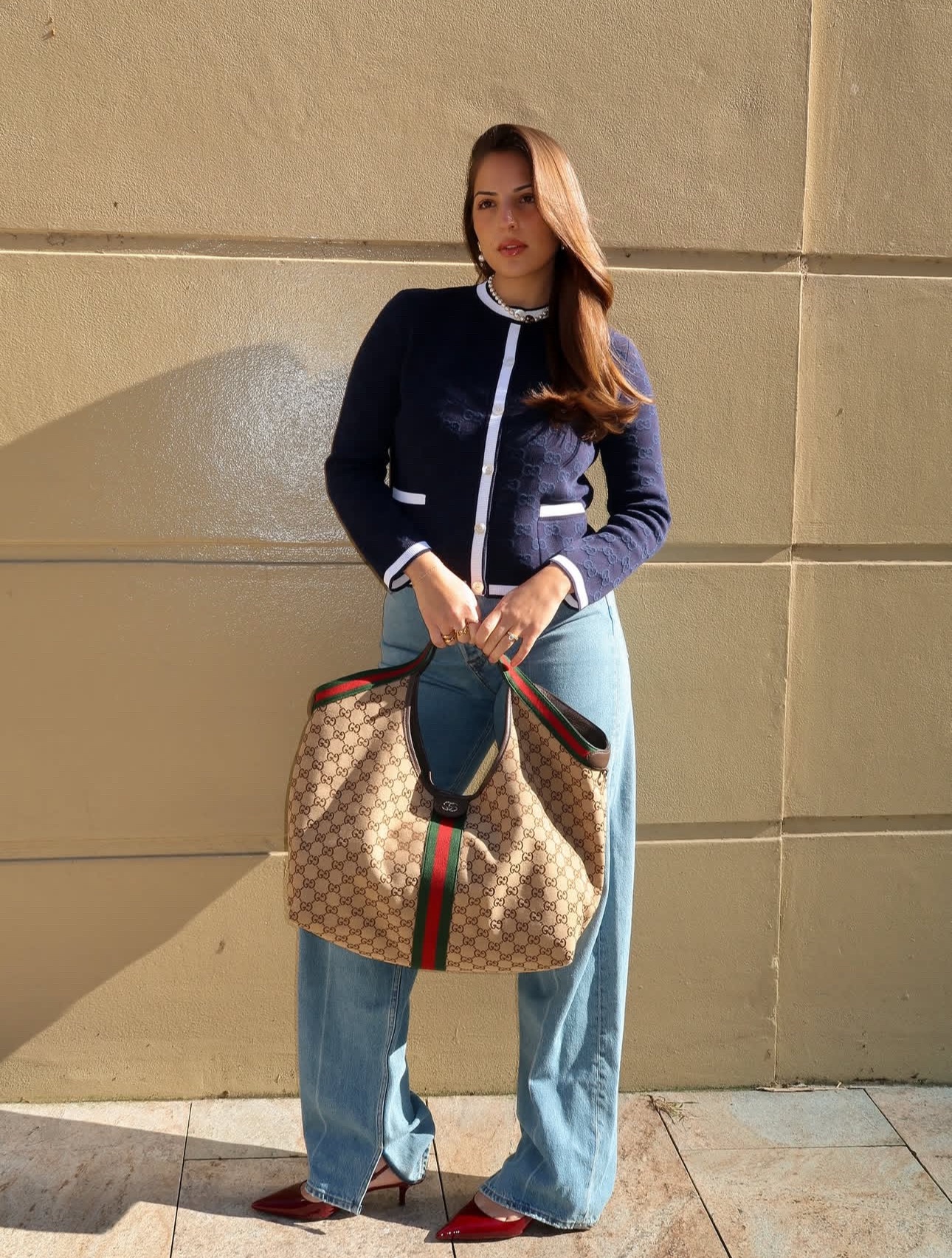 Элегантная сумка Gucci Giglio large tote в бежевом GG canvas идеально сочетает классику и современность. Эта модель, представленная на показе Cruise 2026, отдает дань флорентийским корням бренда с использованием знакового монохромного узора GG и зеленой-красной Web-отделки.