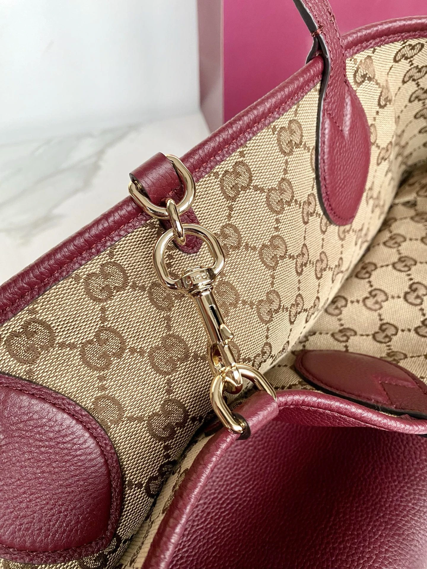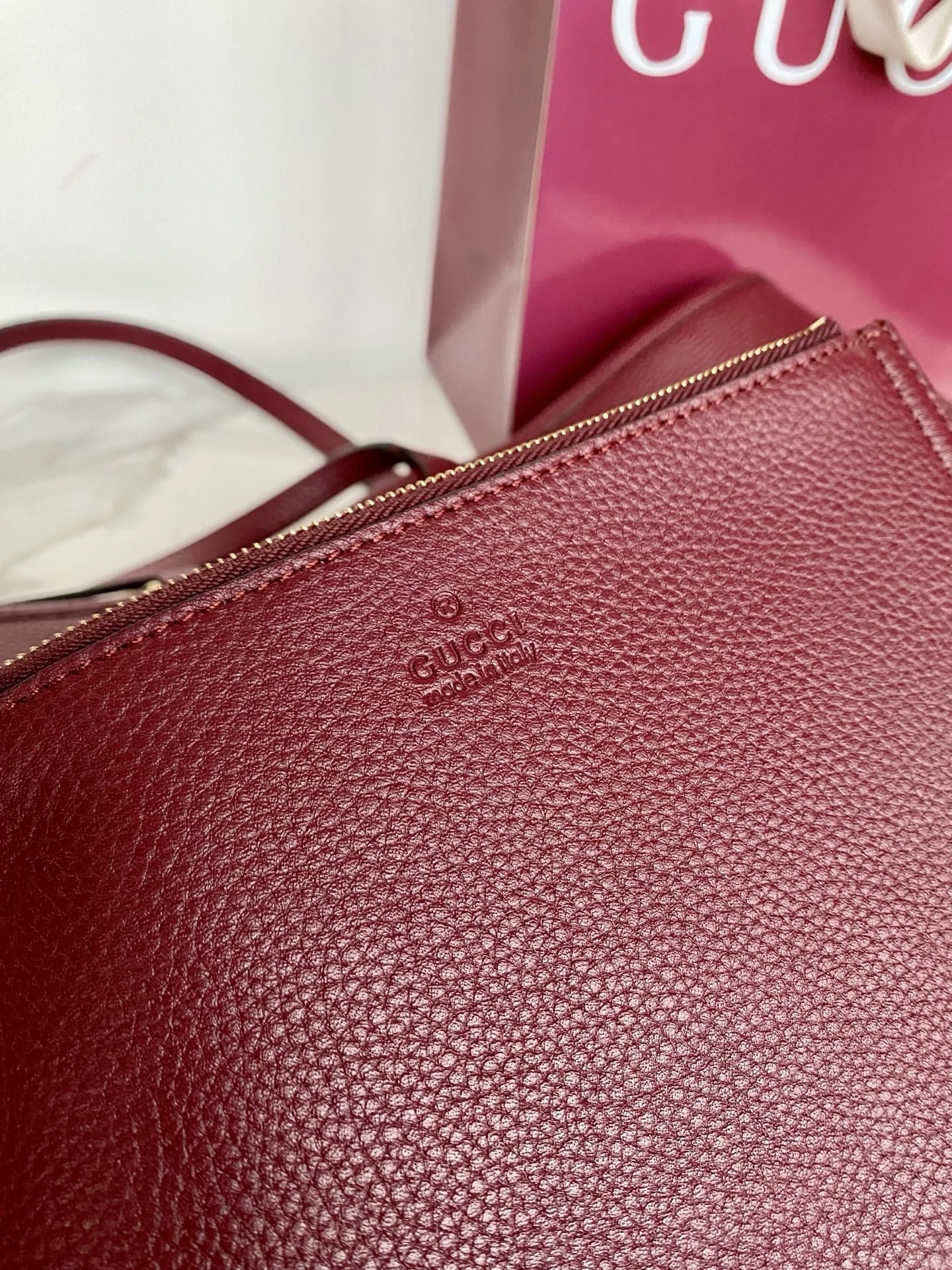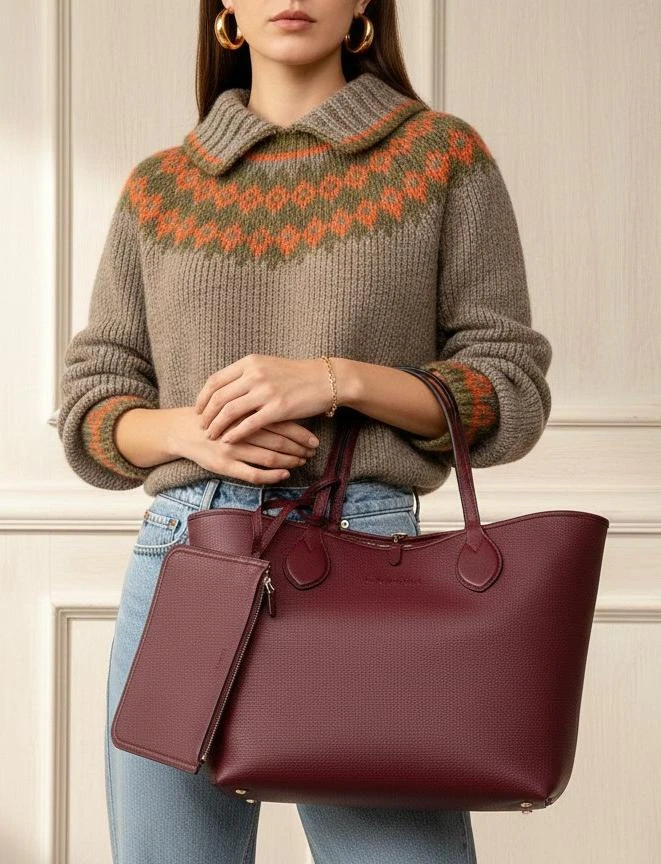 • Дизайн и материал: сумка выполнена из высококачественной зернистой (grained) телячьей кожи насыщенного бордового/марсала цвета. Текстура кожи устойчива к царапинам и придаёт изделию благородный матовый блеск.