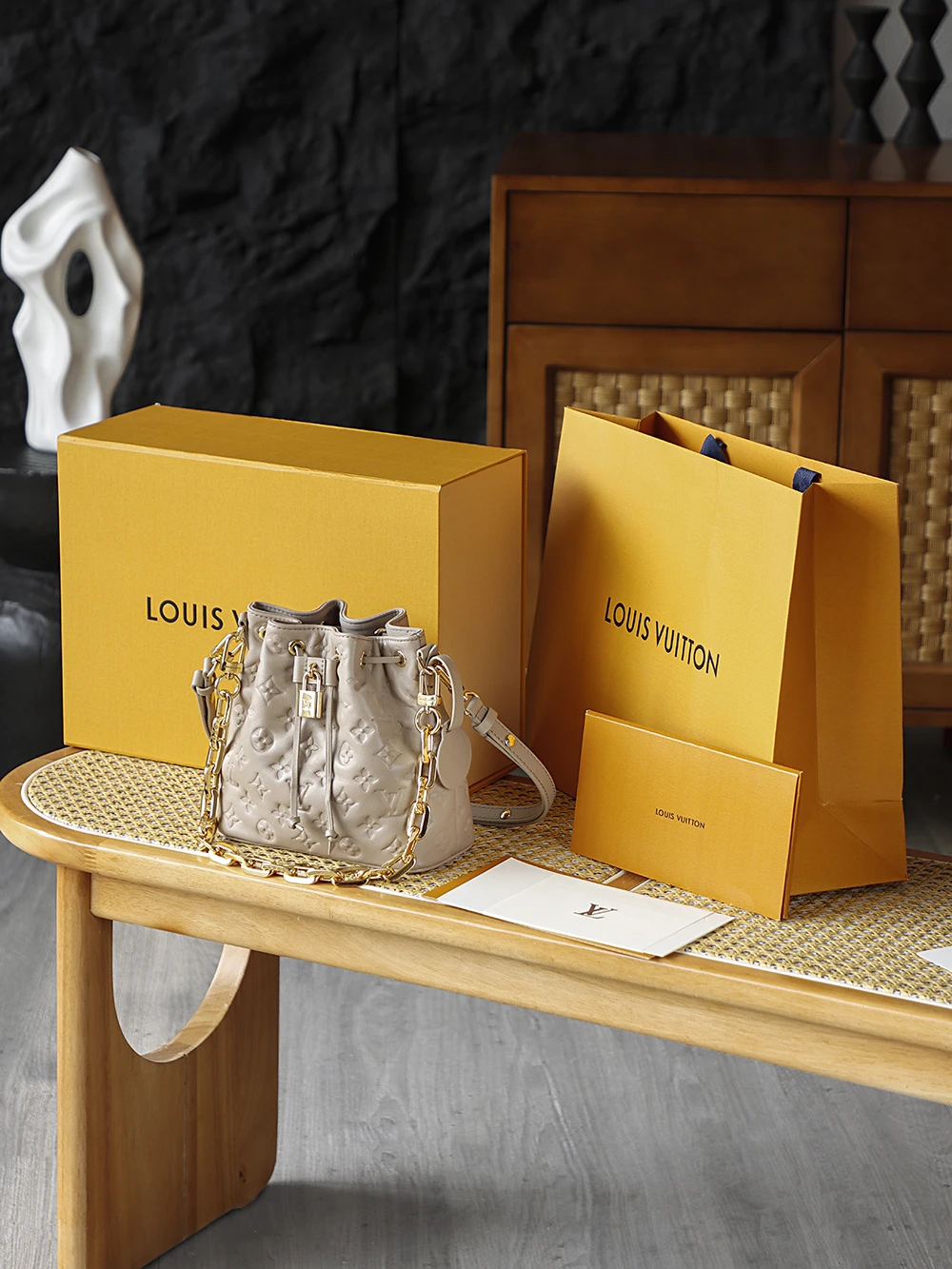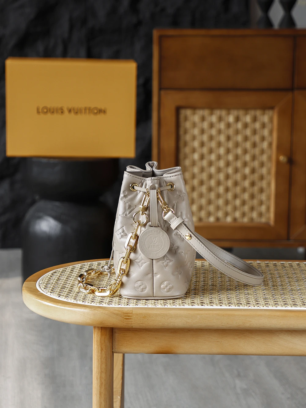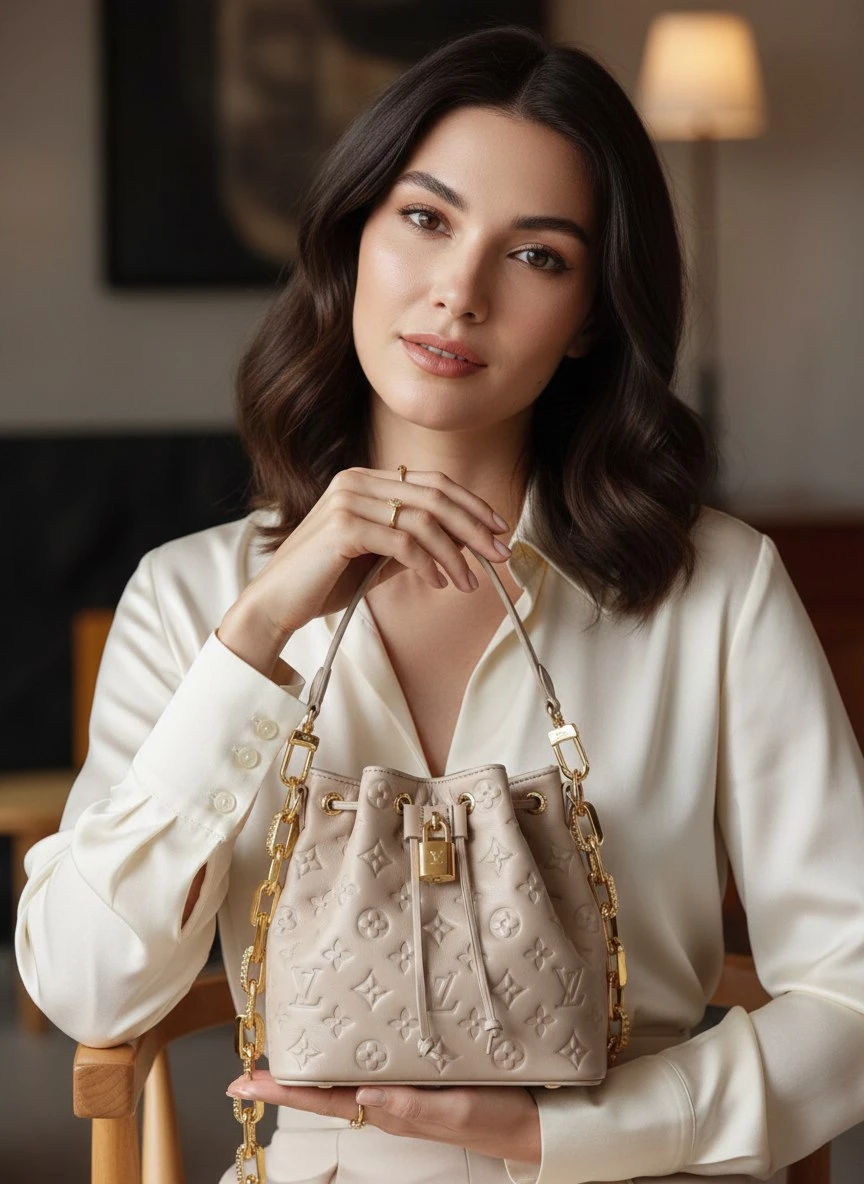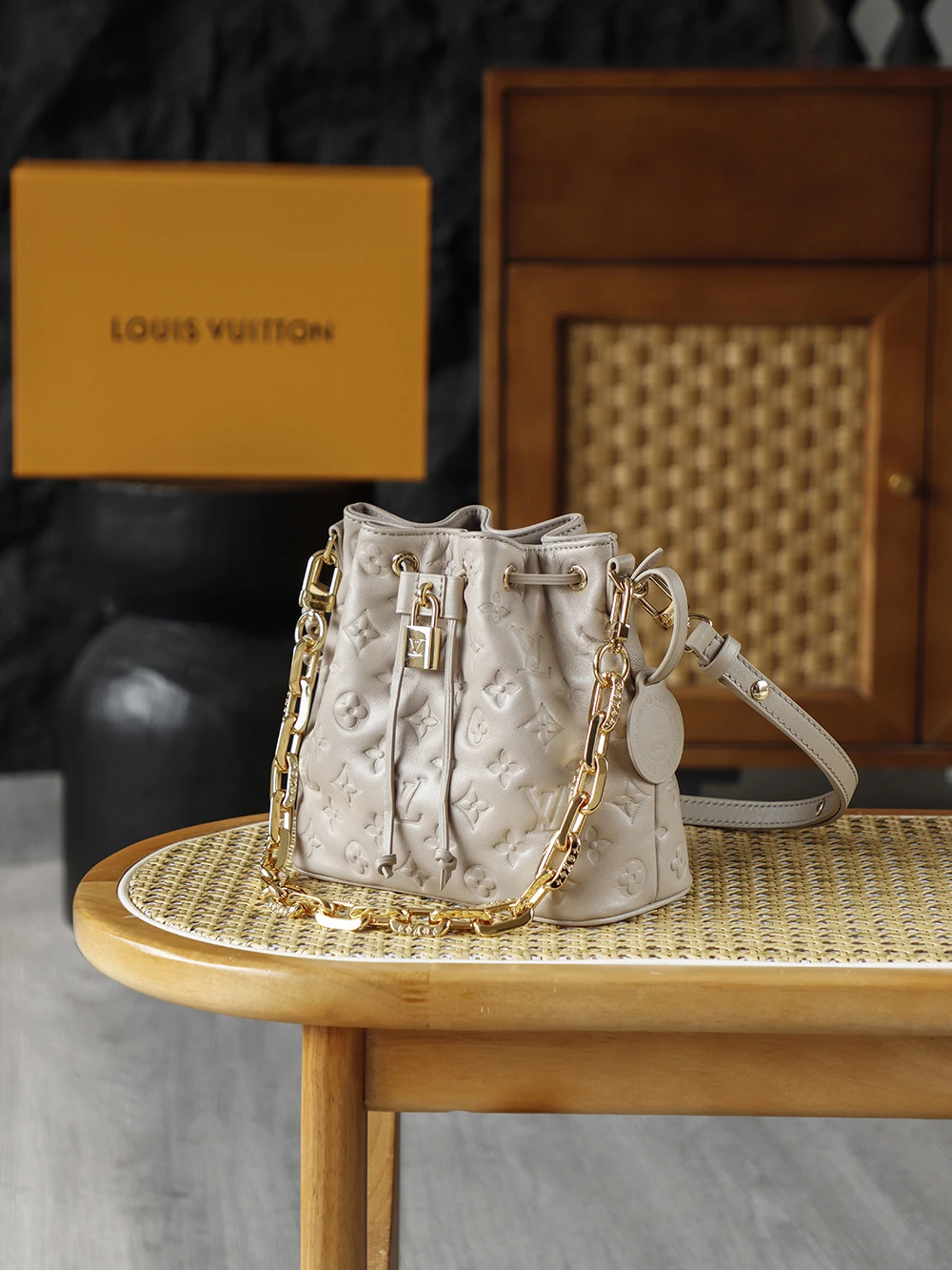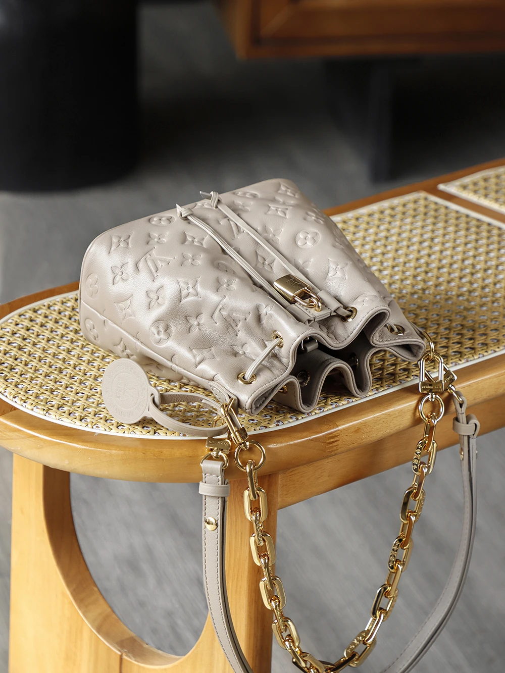 Мягкая объемная форма с тиснением Monogram придаёт сумке утончённую текстуру, а золотистая цепь и мини‑замочек LV — нотку роскоши. Элегантный бежево‑серый оттенок делает модель универсальной: она легко сочетается как с денимом и трикотажем, так и с классическими пальто и платьями.