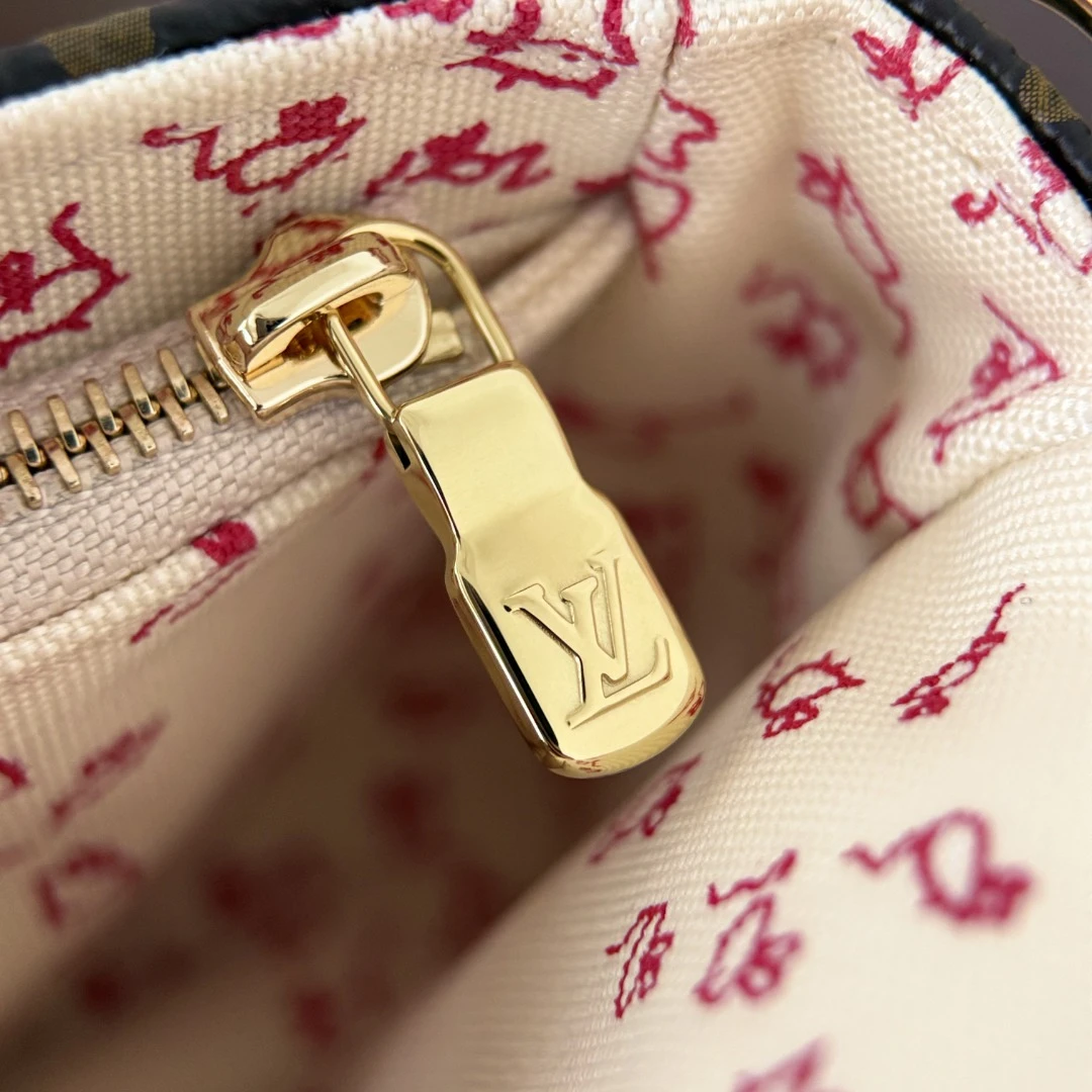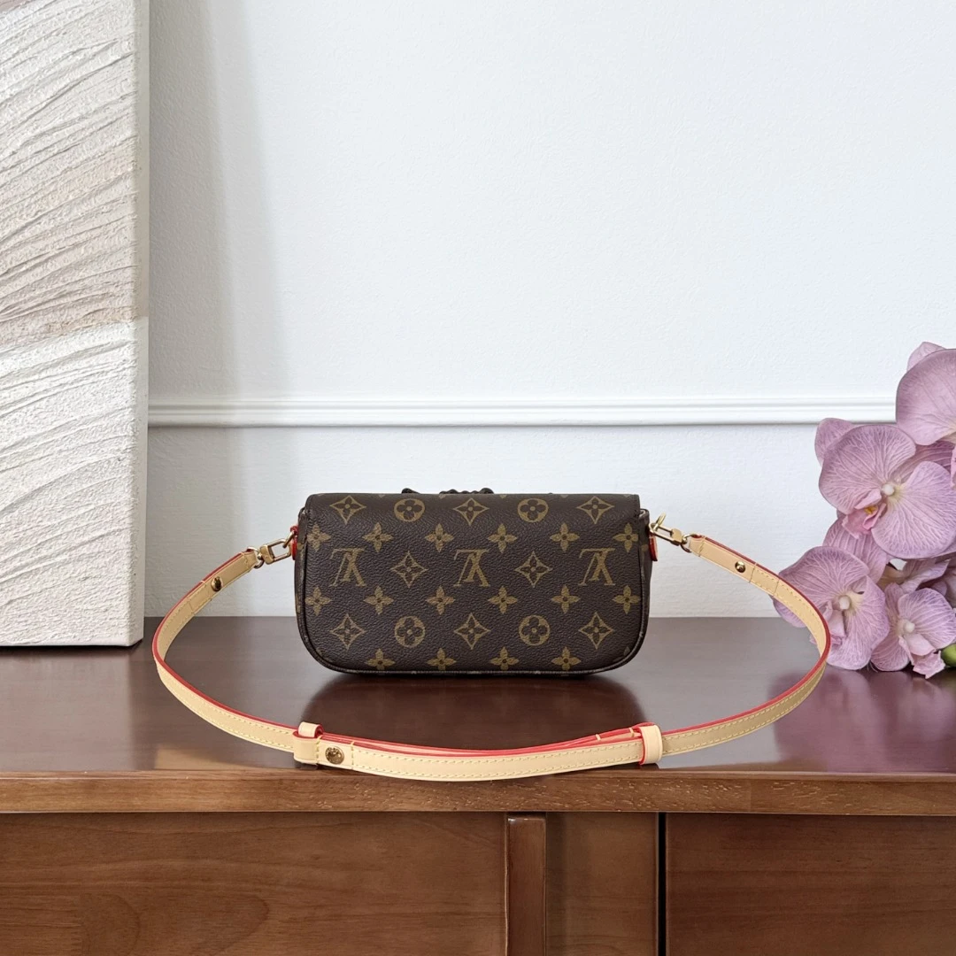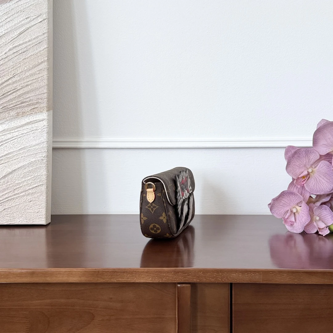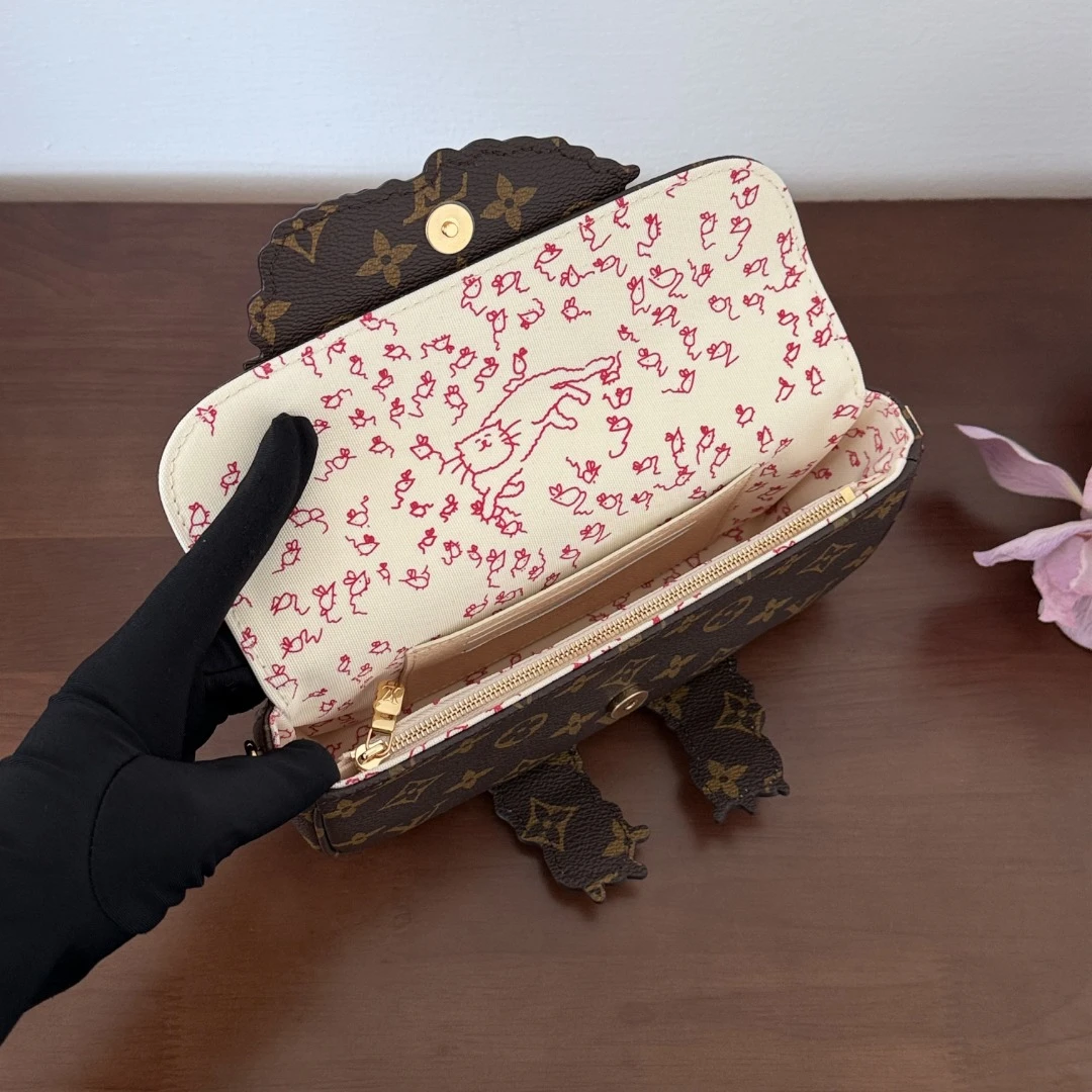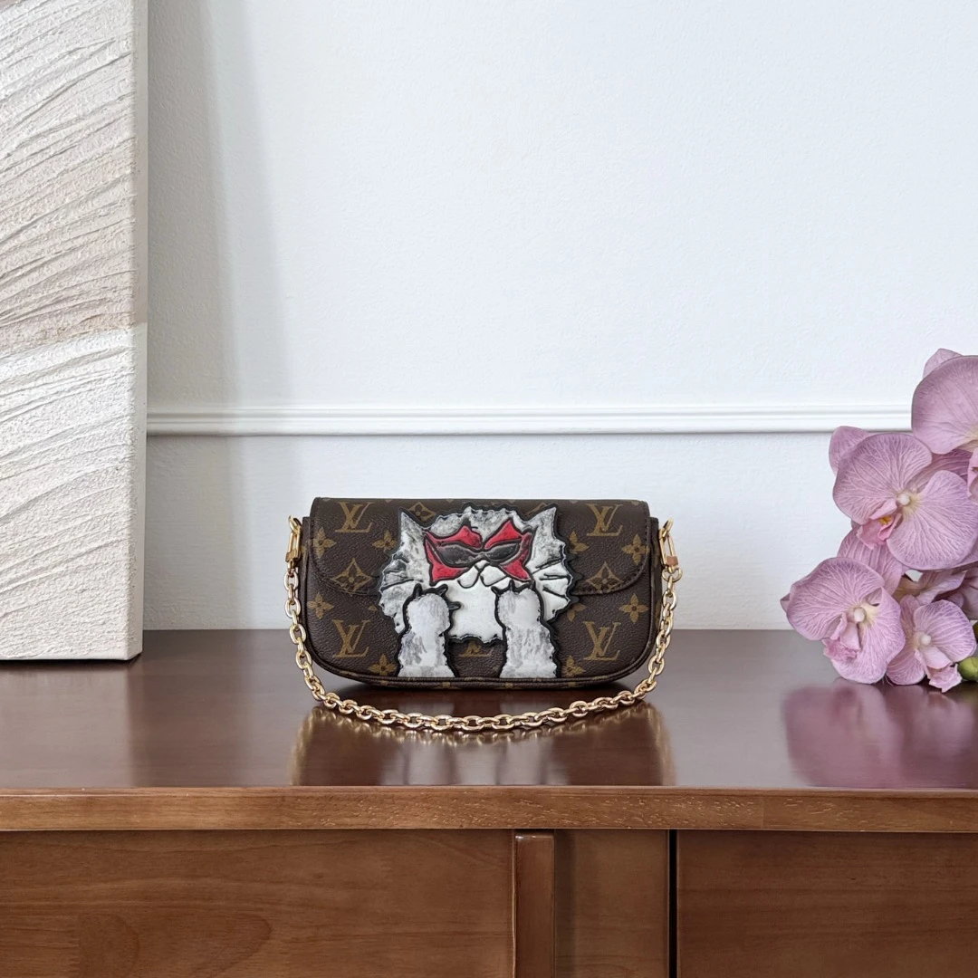 Стильная мини-сумка Louis Vuitton Ivy M15148 — идеальный аксессуар для городских прогулок и вечерних выходов. Выполнена из классического монограммного холста с ярким художесвтенным принтом кота и дополнена золотистой цепочкой — сочетание лаконичности и индивидуальности.