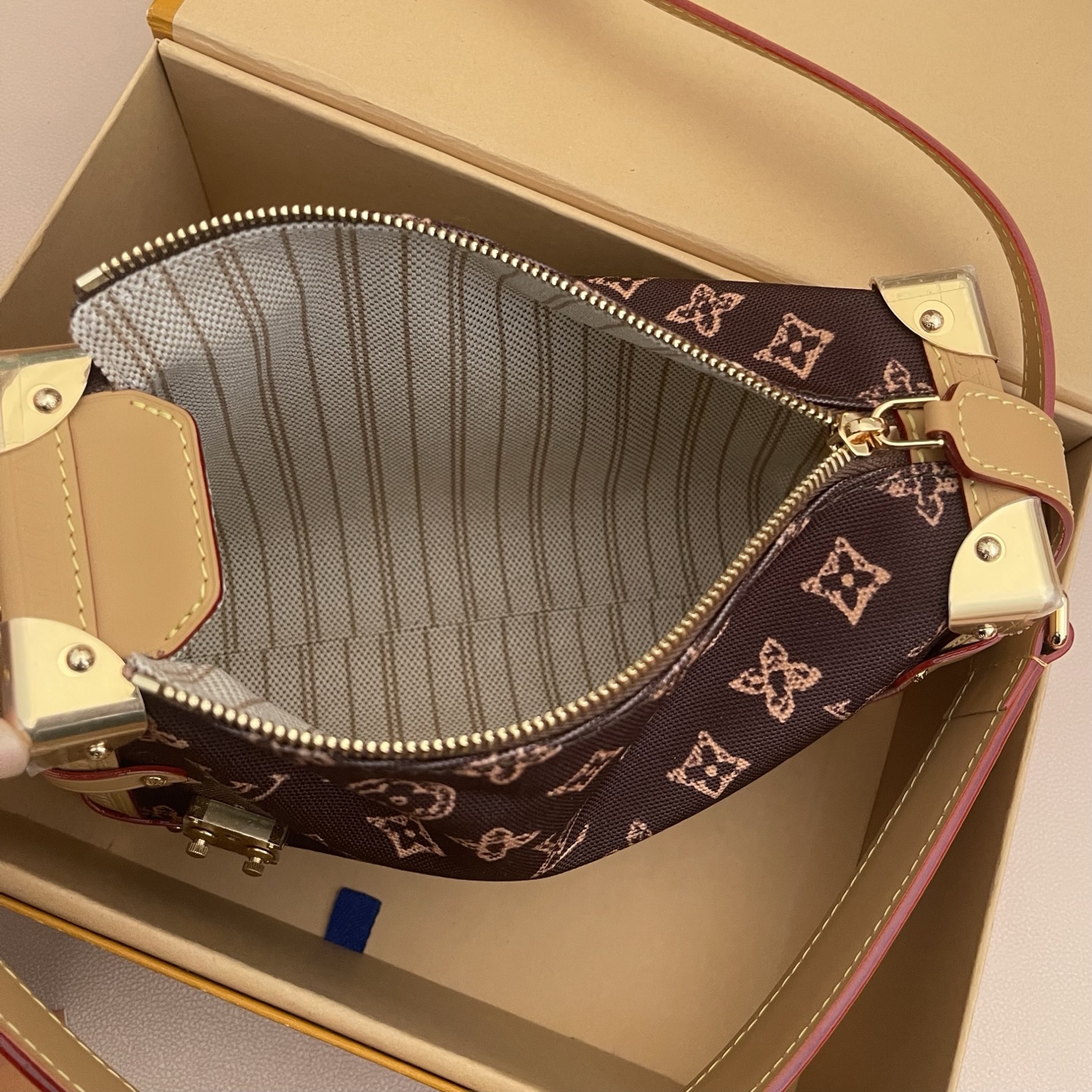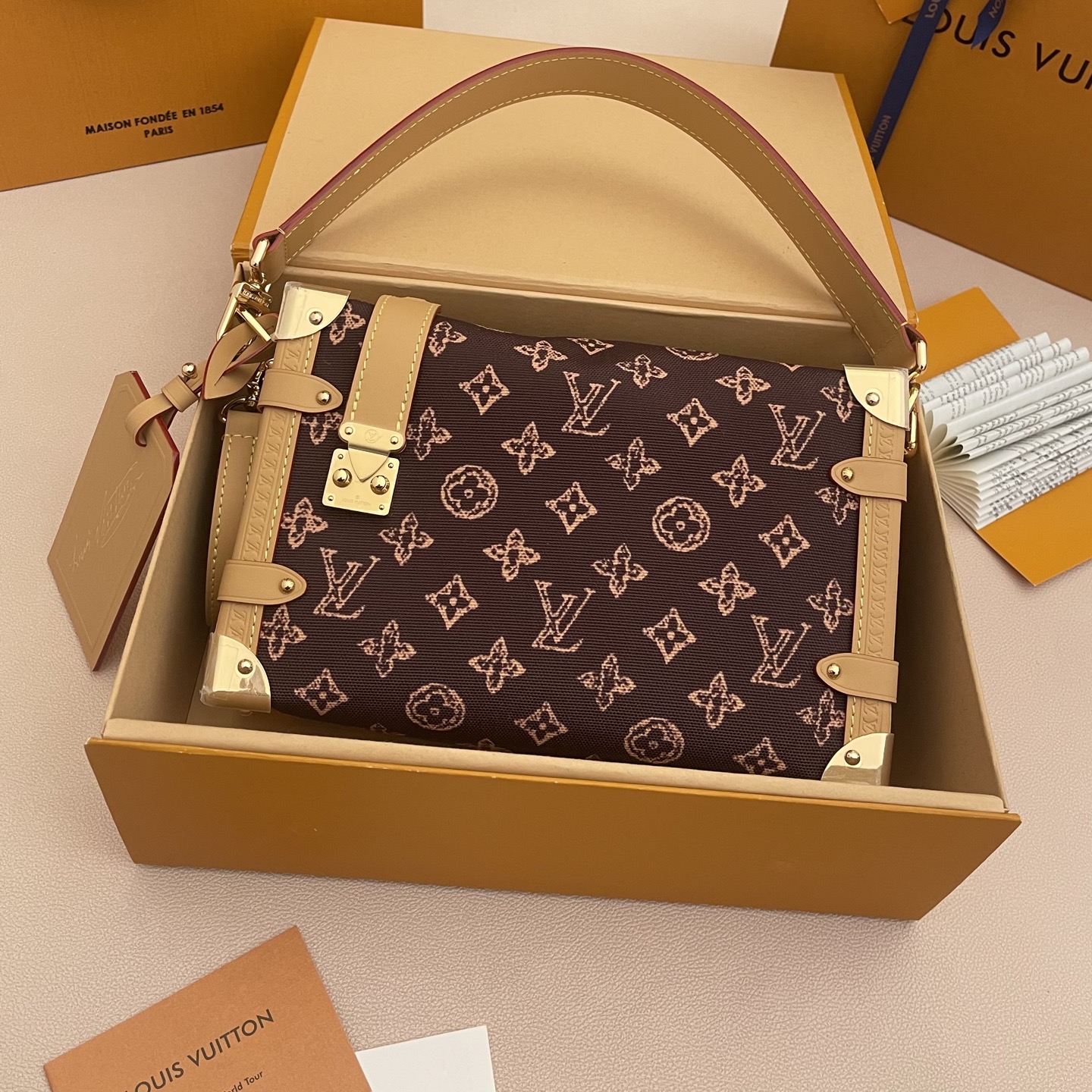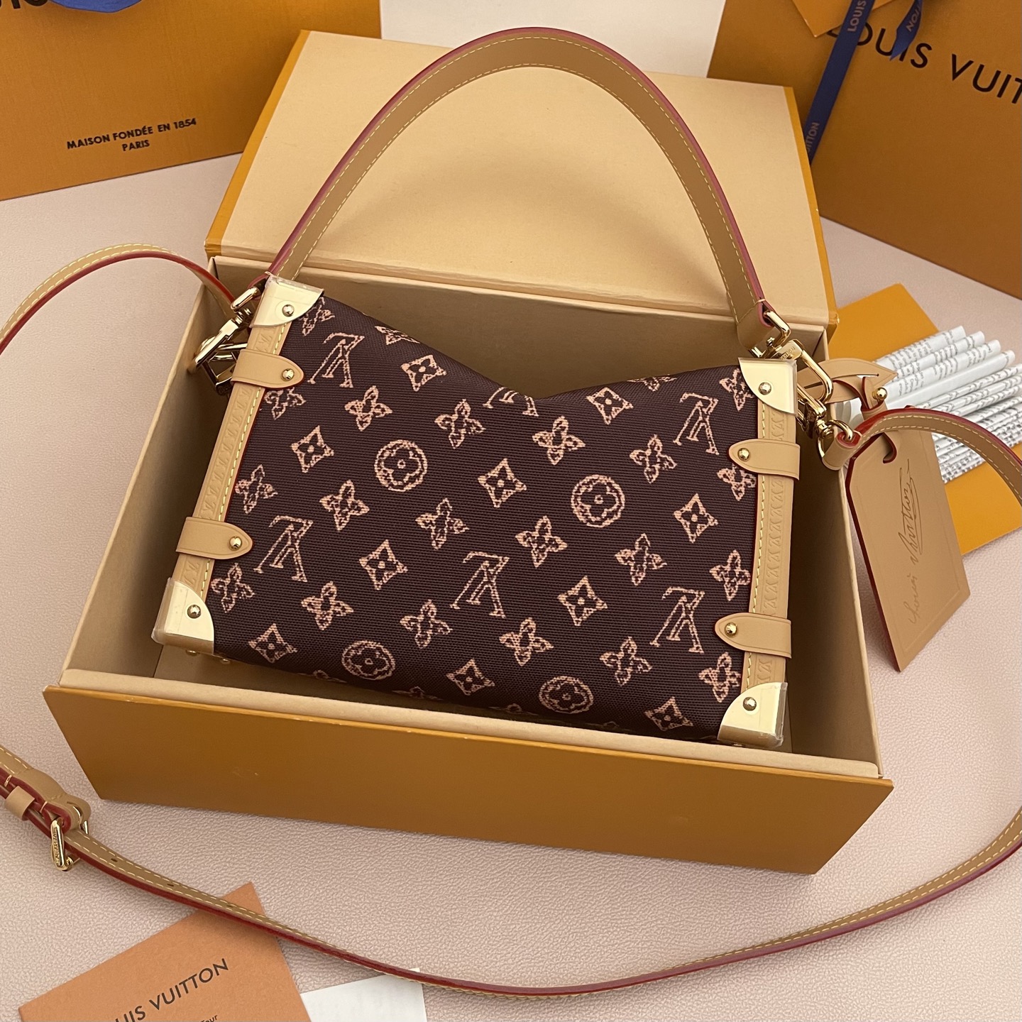 Эффектная мини‑сумка Side Trunk PM от Louis Vuitton — яркий акцент в любом образе. Уникальный «транковый» силуэт, розовый монограммный жаккард и фирменные металлические уголки создают стильный и запоминающийся аксессуар, идеально подходящий для городских прогулок и вечерних выходов.