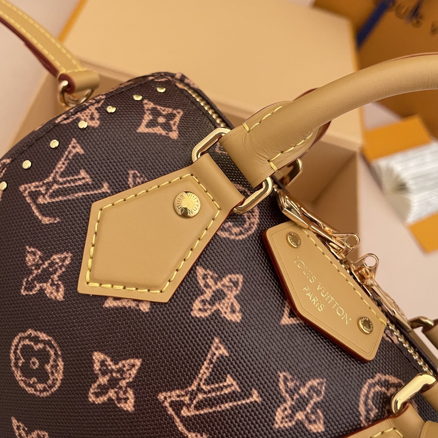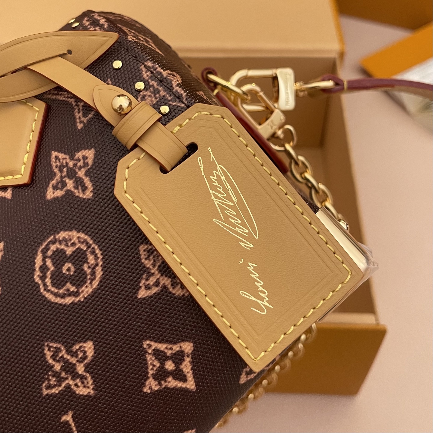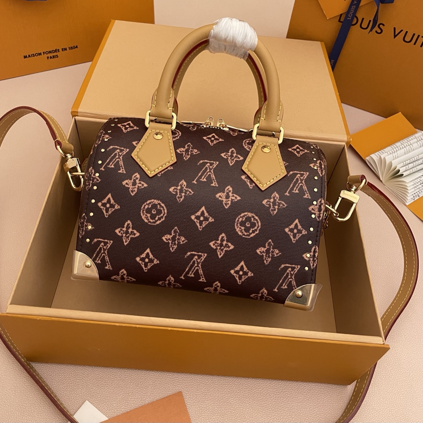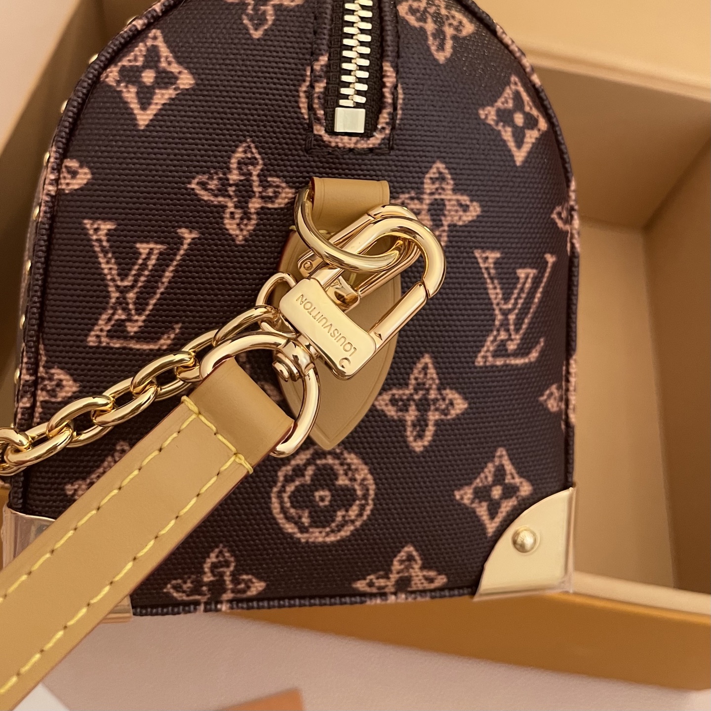Женская сумка Speedy Trunk 20 — современная интерпретация культовой Speedy, выполненная в духе дорожного сундука. На фотографии — компактная модель в классическом коричневом Monogram-холсте с модным контрастным розово-песочным эффектом принта. Стильный, структурный силуэт с металлическими уголками и декоративной строчкой придают аксессуару винтажный «транковый» характер, а аккуратные золотистые элементы и клёпки подчёркивают премиальность исполнения.