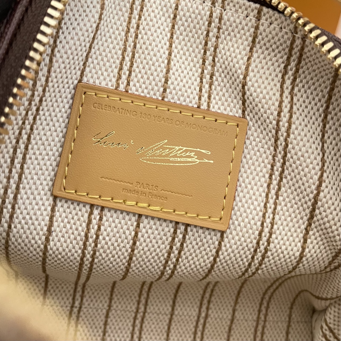 • Материал: Monogram coated canvas с контрастным принтом; кожаные рукояти и окантовка натуральной кожи (vachetta-look), красная кантовка по кромке ручек и ремня.