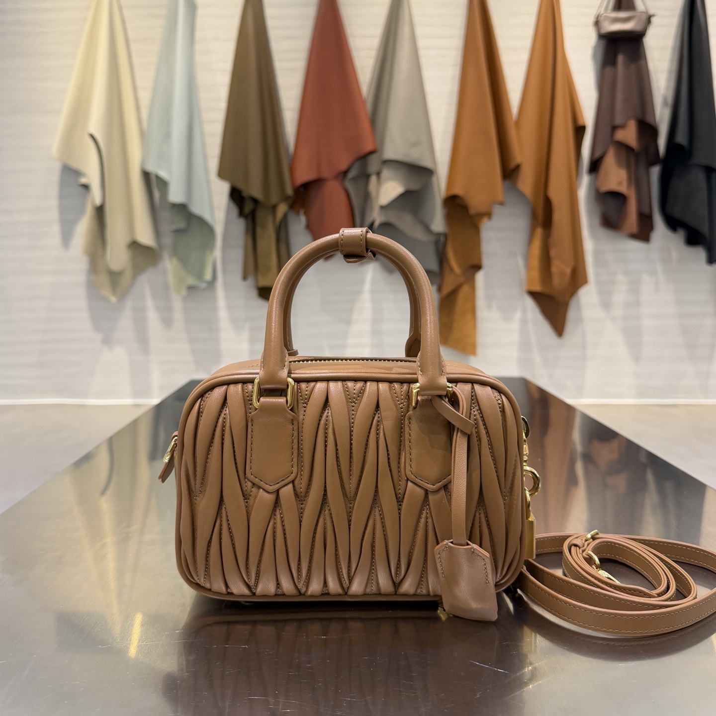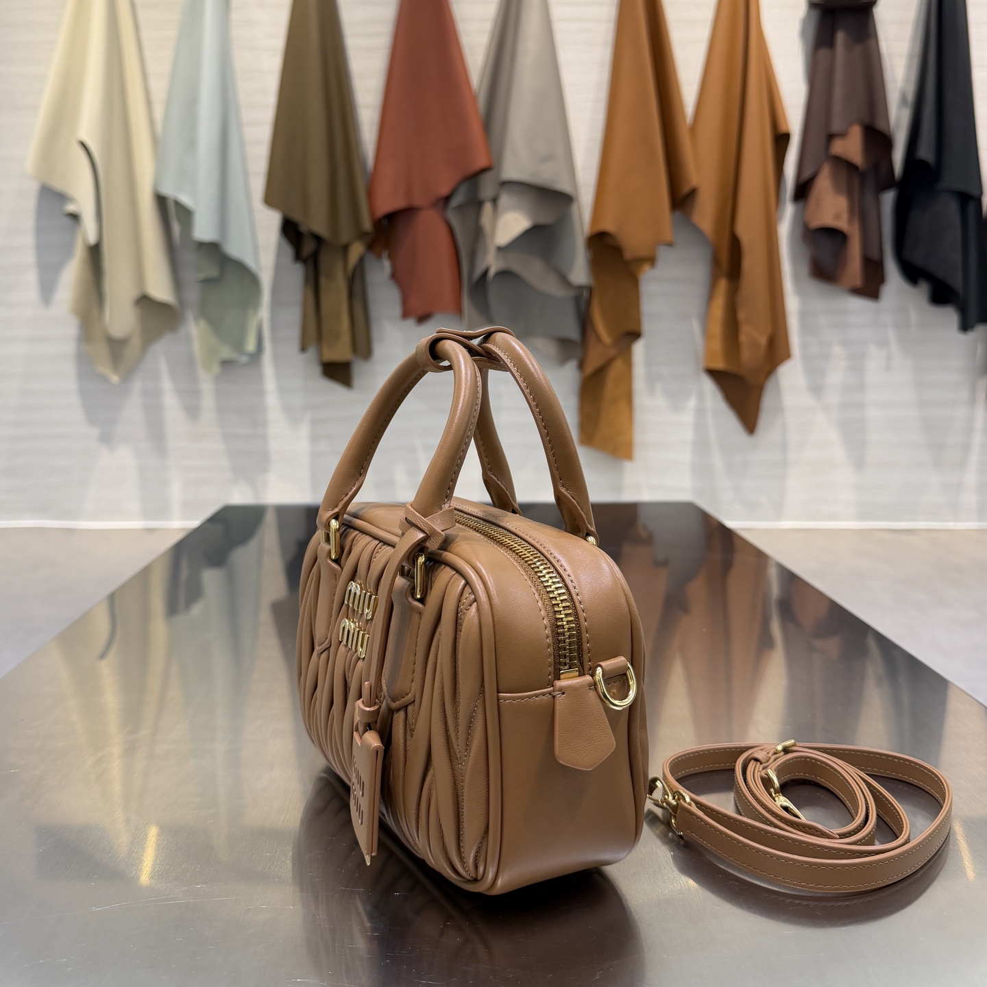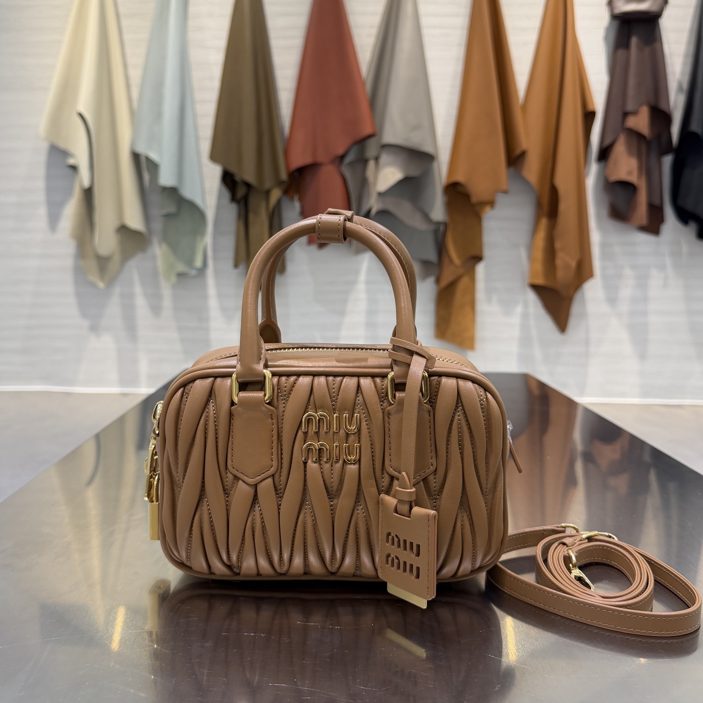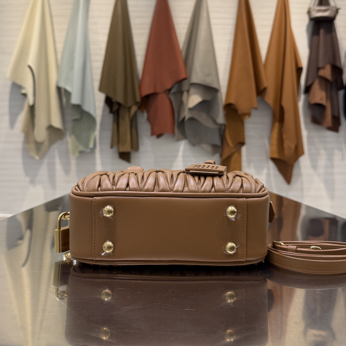 Модель сочетает в себе фирменную технику стежки Miu Miu и лаконичный архитектурный дизайн. Корпус сумки выполнен из мягкой, слегка глянцевой кожи с характерной жатой фактурой: объёмные вертикальные складки придают изделию скульптурность и визуальную глубину. Фронт украшает металлический логотип MIU MIU золотистого оттенка, гармонирующий с остальной фурнитурой.