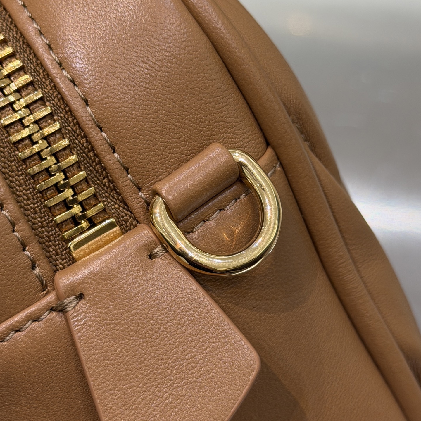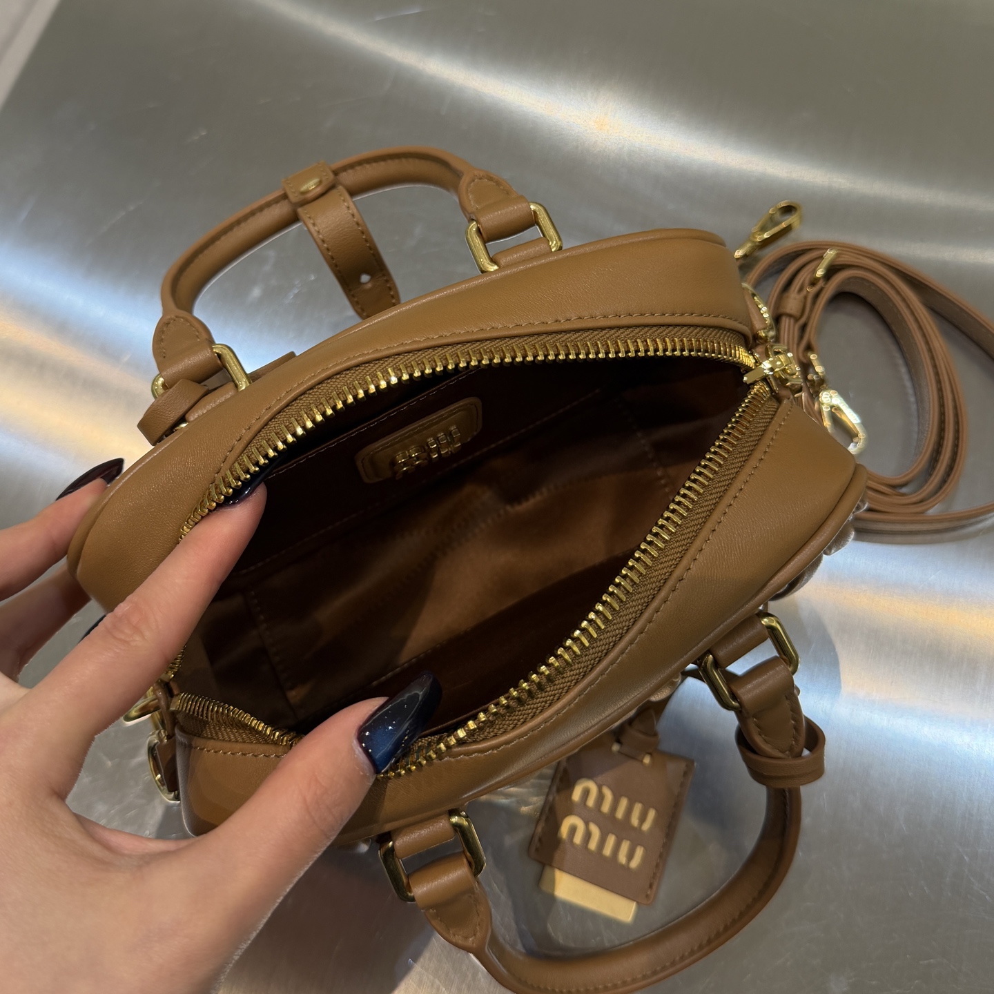 Сумка закрывается на верхнюю молнию, обеспечивая безопасность и сохранность содержимого. Двойные скруглённые ручки позволяют носить модель в руках или на сгибе локтя, а съёмный регулируемый плечевой ремень даёт возможность носить её через плечо или кроссбоди. На передней части виден декоративный кожаный брелок/бирка с фирменной перфорацией — утончённая деталь, подчёркивающая премиальность изделия.