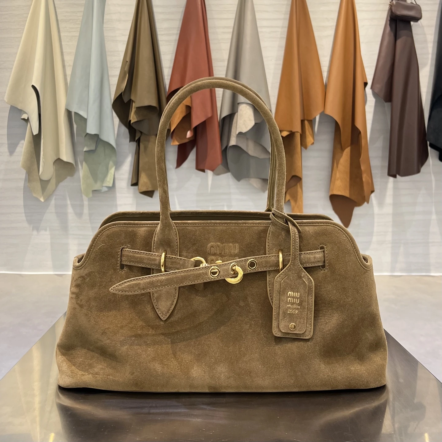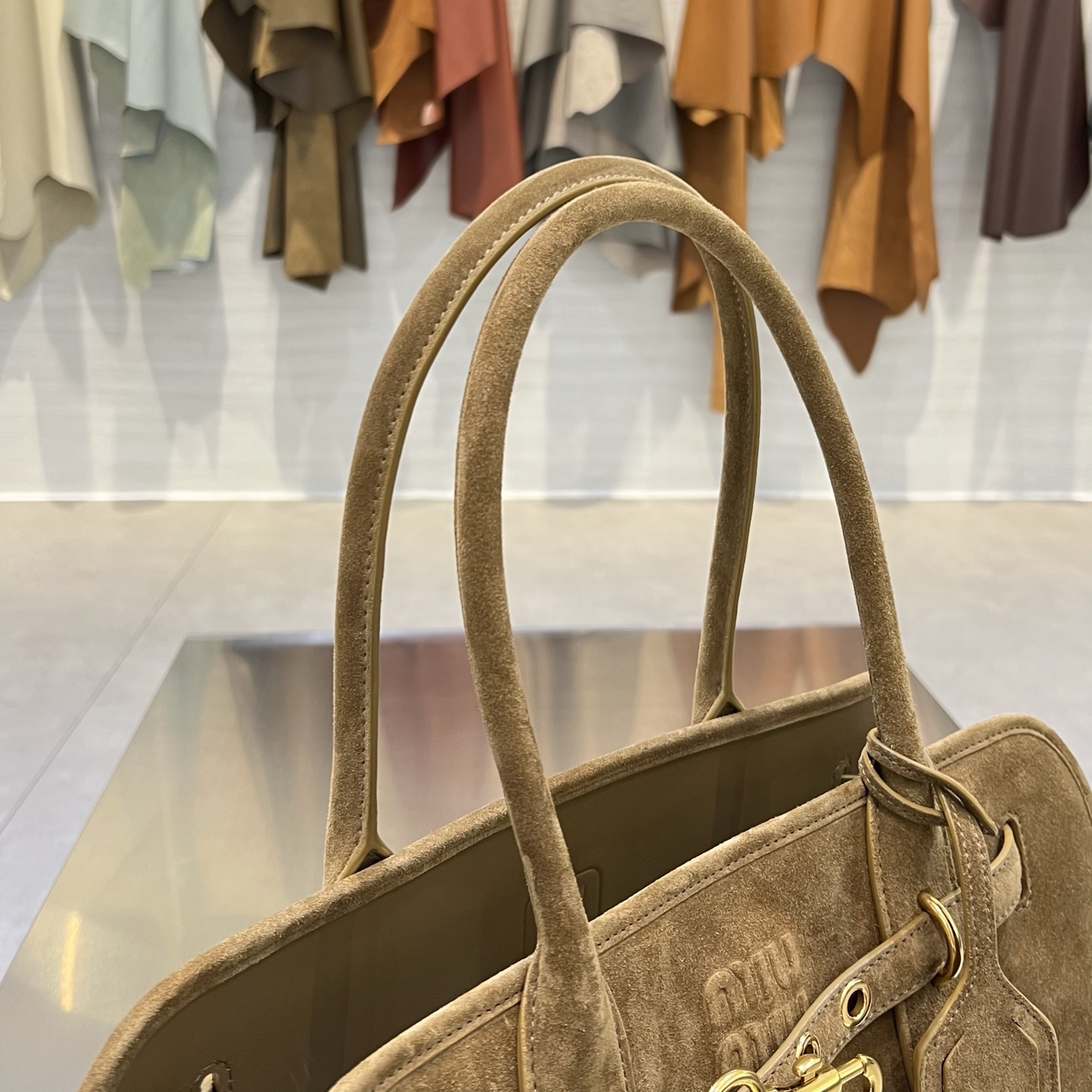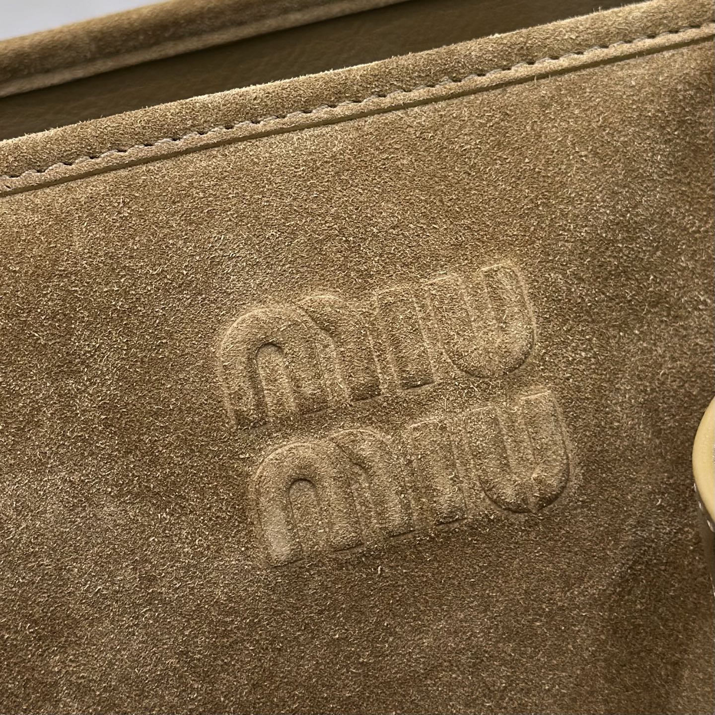 Декоративный ремешок на передней панели с золотистыми металлическими креплениями и замочной деталью подчёркивает фирменный характер модели и служит акцентом на минималистичной отделке. На передней стороне видна тиснёная эмблема Miu Miu, а подвесной бирк‑тэг с фирменным тиснением добавляет завершённости. Сумка выглядит достаточно вместительной для ежедневных вещей, сохраняя при этом утончённый силуэт.