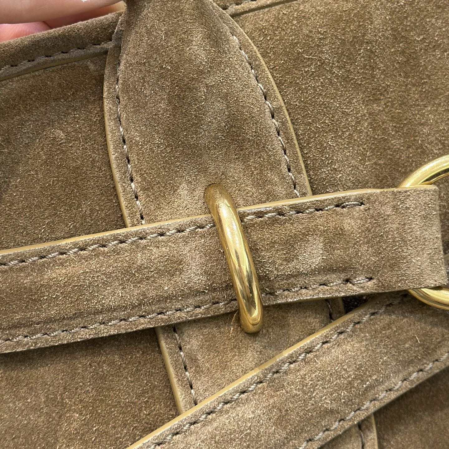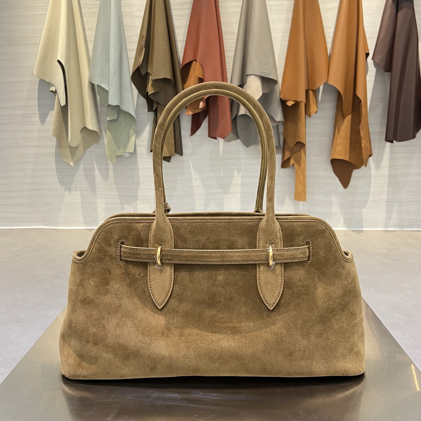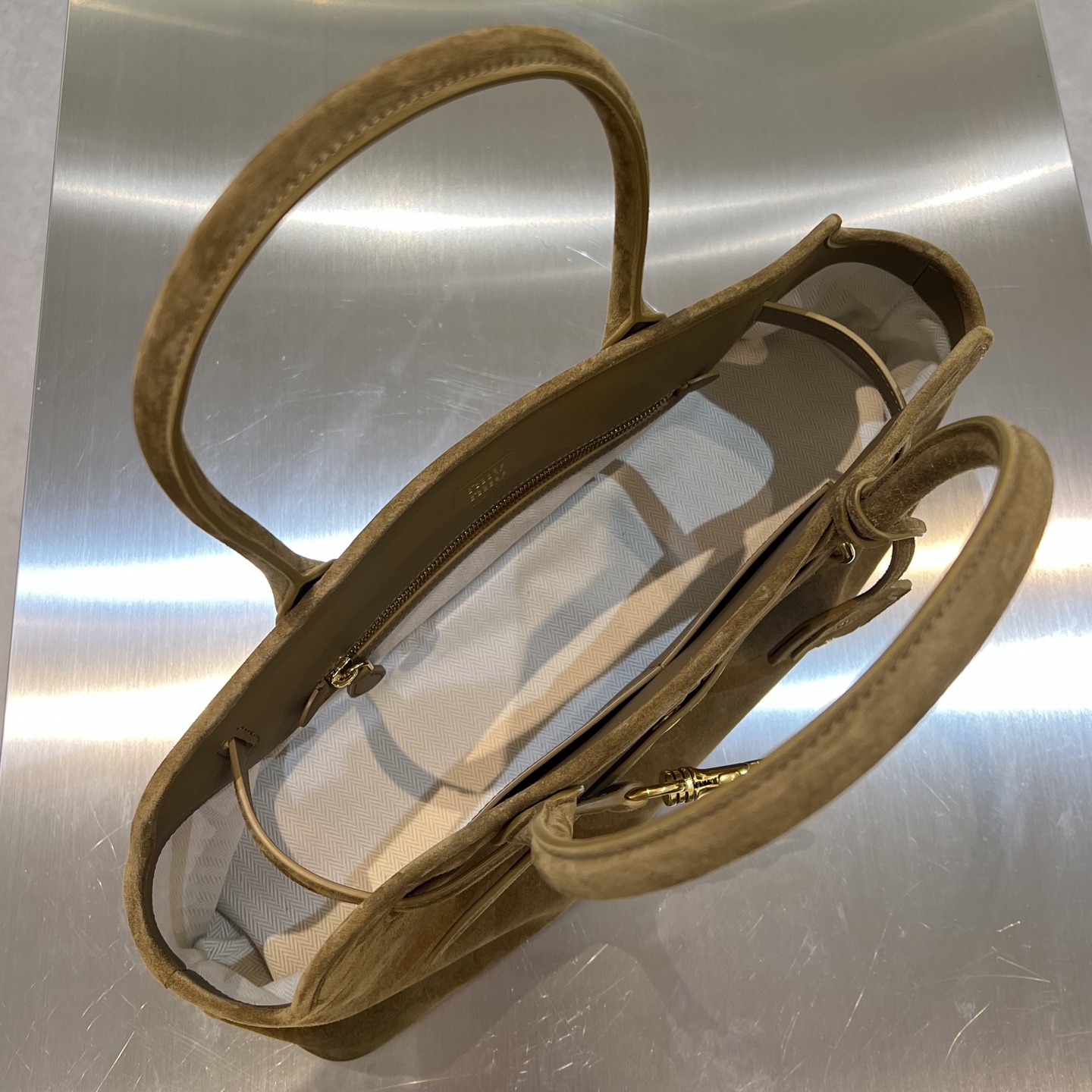 Сумка Aventure Nappa от Miu Miu выполнена из высококачественной замши Nappa с бархатистой текстурой — материал легко читается на фото и создаёт роскошный, тактильно притягательный образ. Форма сумки сочетает структурированную базу с мягкими, плавными линиями корпуса, что придаёт модели одновременно сдержанную строгость и лёгкую женственность. Двойные круглые ручки обеспечивают комфортное ношение в руке или на сгибе локтя.