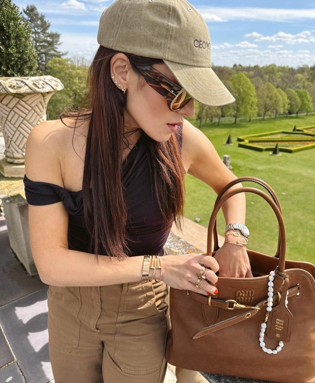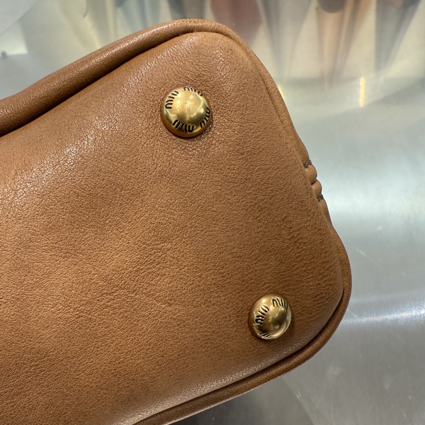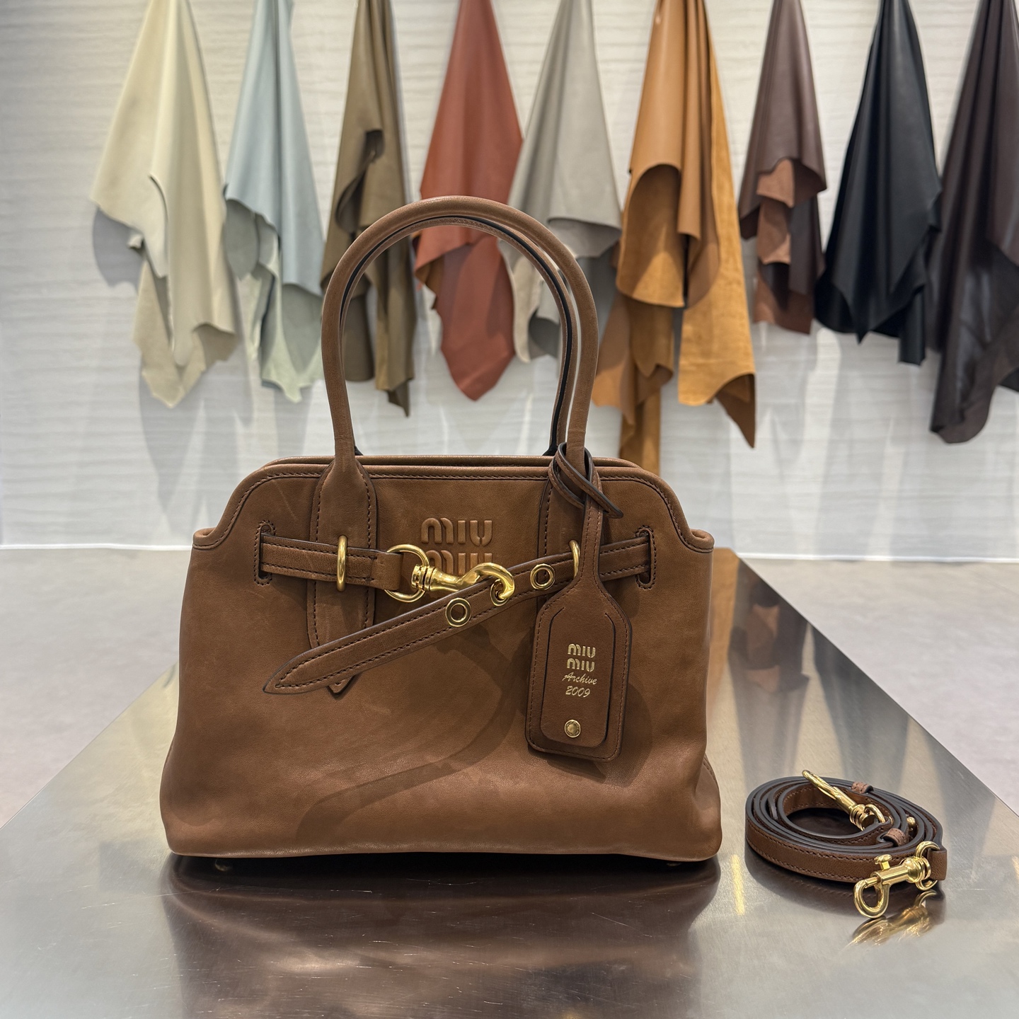 • Декор: кожаный ремешок с поворотным карабином, фирменная кожаная бирка с тиснением MIU MIU