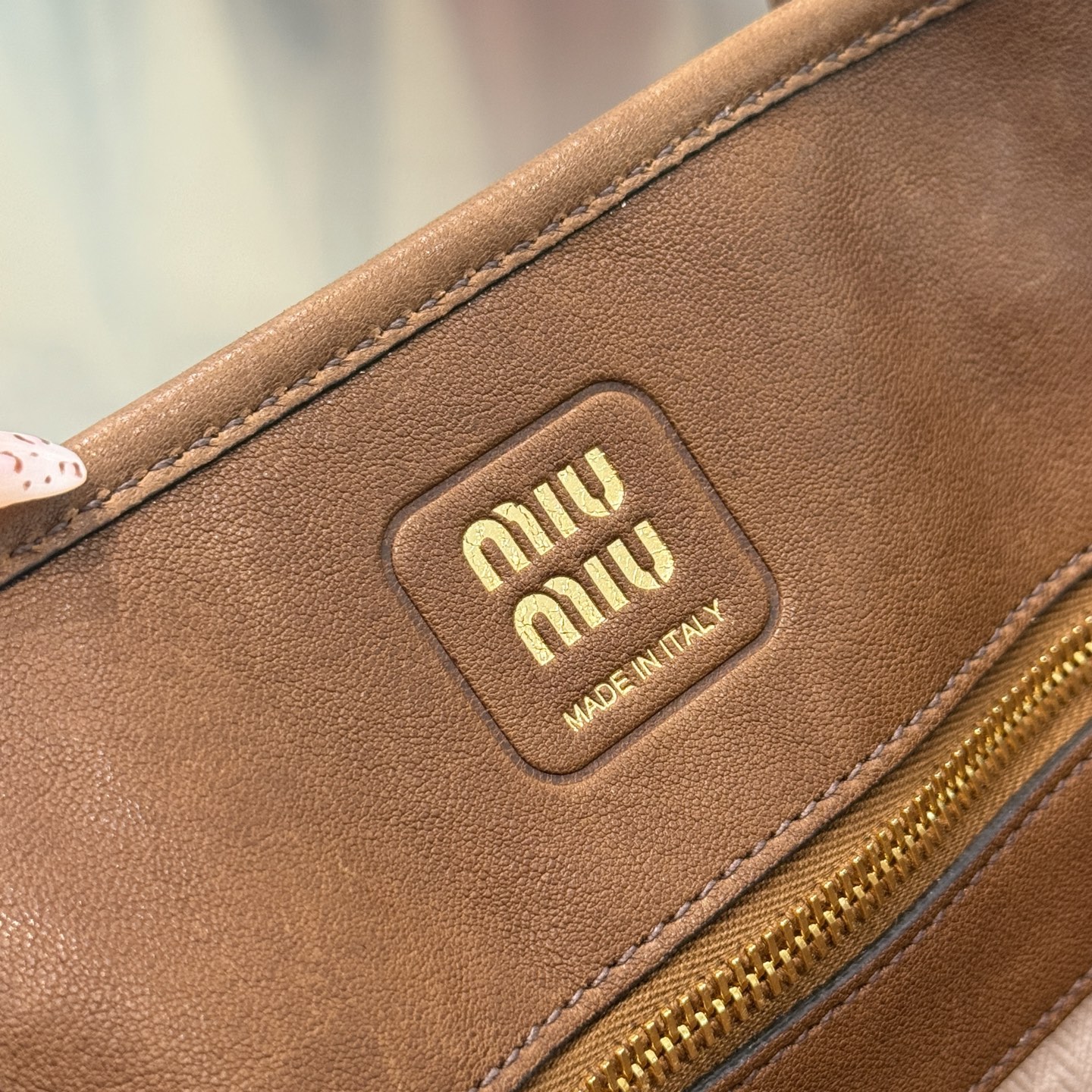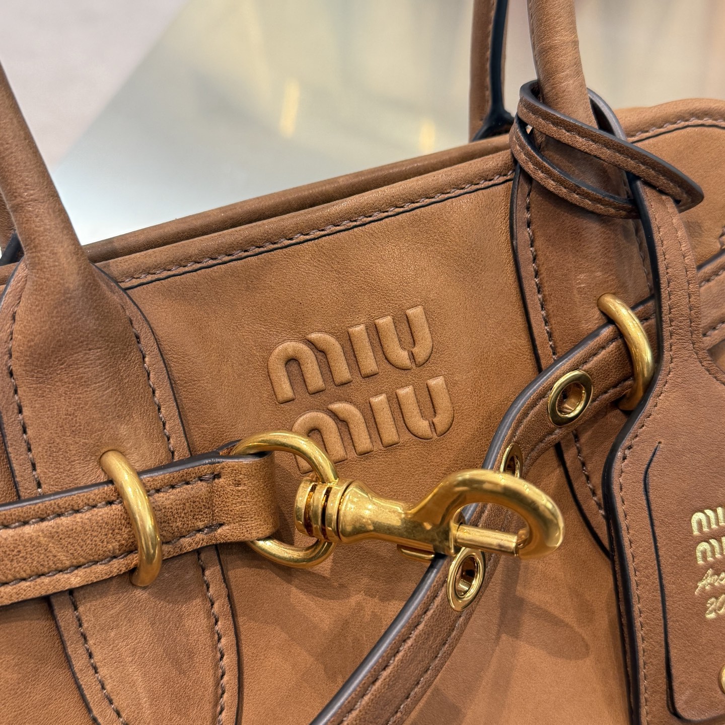 Декоративный акцент — тонкий кожаный ремешок, продёрнутый по передней части и оформленный золотистым поворотным карабином — подчёркивает авиаторскую эстетику модели. На лицевой панели — тиснение логотипа MIU MIU и фирменная кожаная бирка с логотипом. Фурнитура выполнена в тёплом золотистом оттенке и добавляет изделию благородного блеска. Нижняя часть сумки защищена металлическими ножками, которые помогают сохранить форму и чистоту дна.