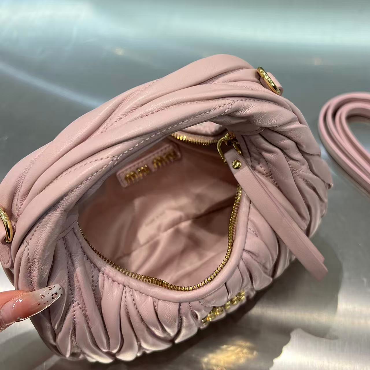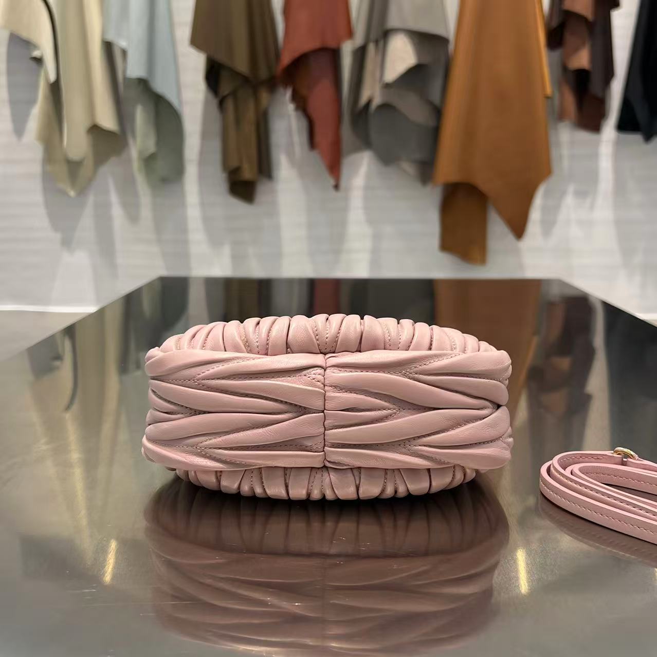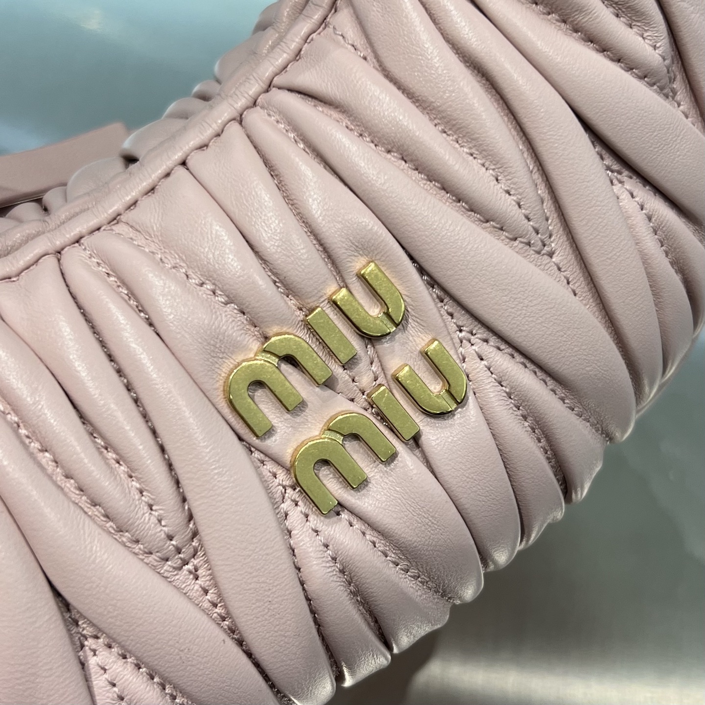 • Материалы и отделка: поверхность выполнена из мягкой стеганой кожи с характерной вертикальной плиссировкой/складками, придающими сумке фактуру и объем. Центральным декоративным акцентом служит фирменный металлический логотип MIU MIU.