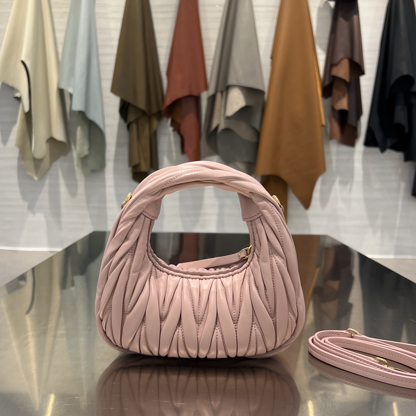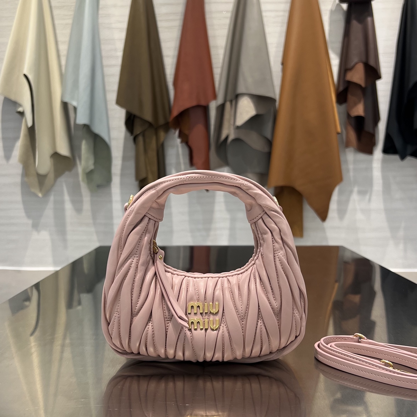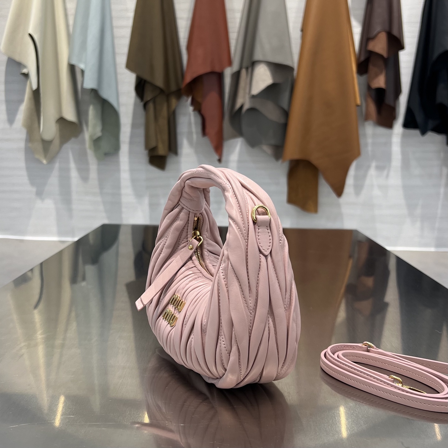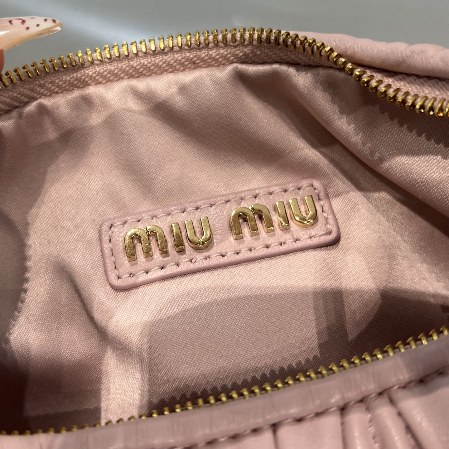 • Материалы и отделка: поверхность выполнена из мягкой стеганой кожи с характерной вертикальной плиссировкой/складками, придающими сумке фактуру и объем. Центральным декоративным акцентом служит фирменный металлический логотип MIU MIU.