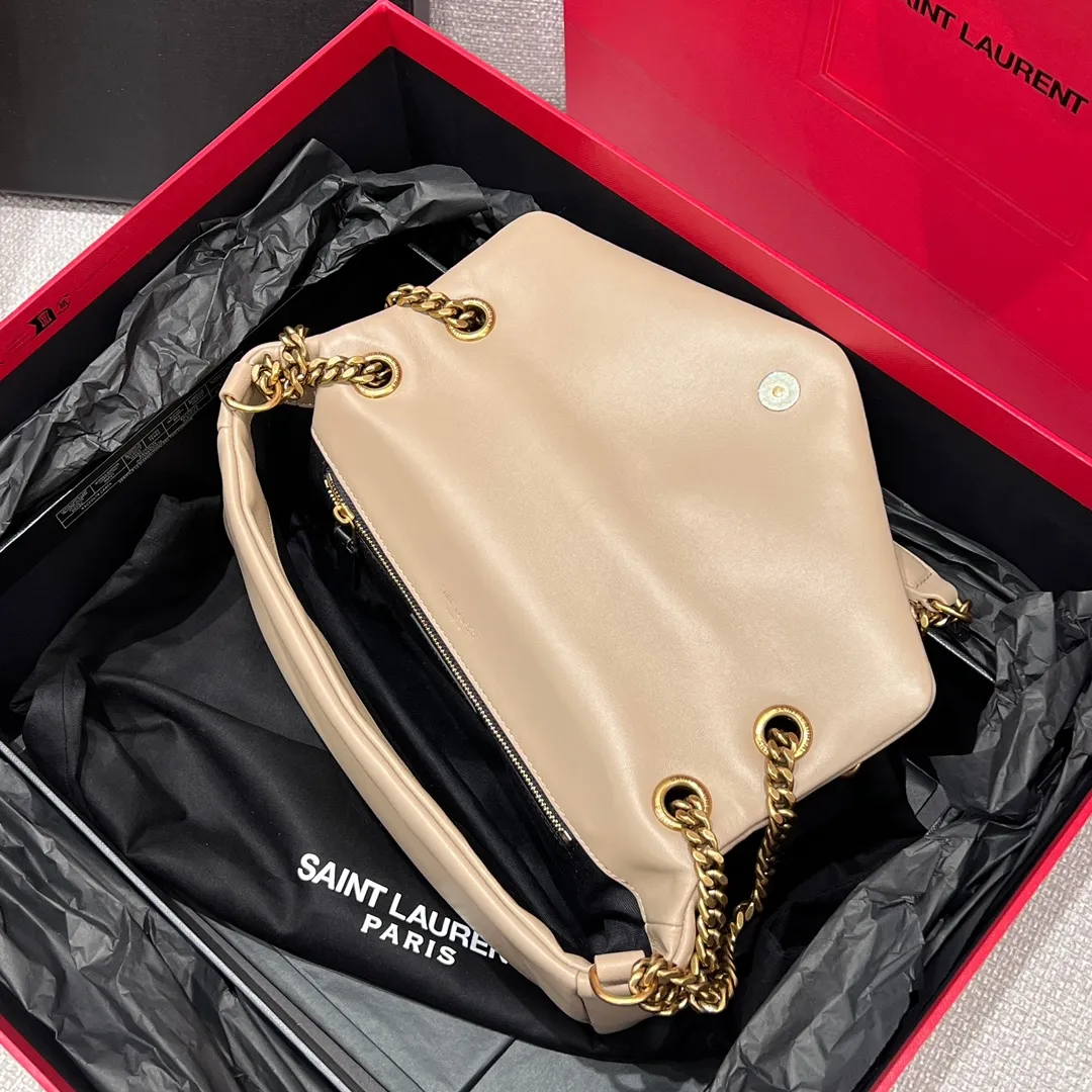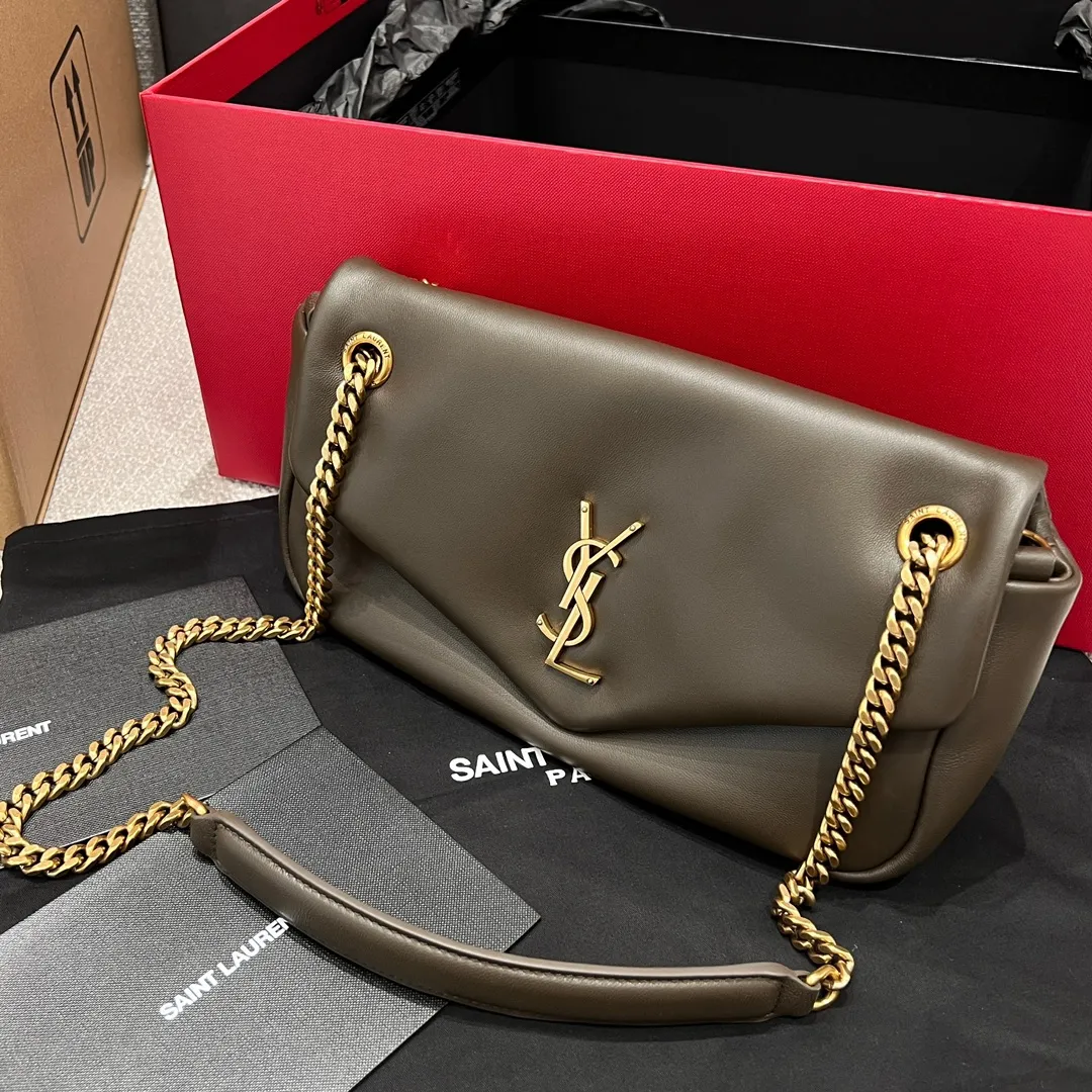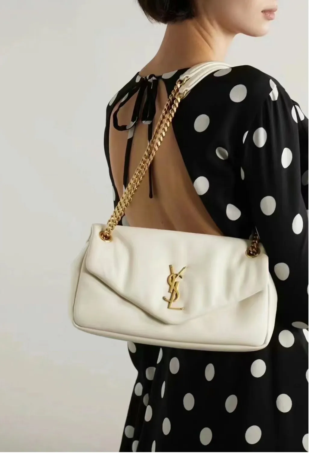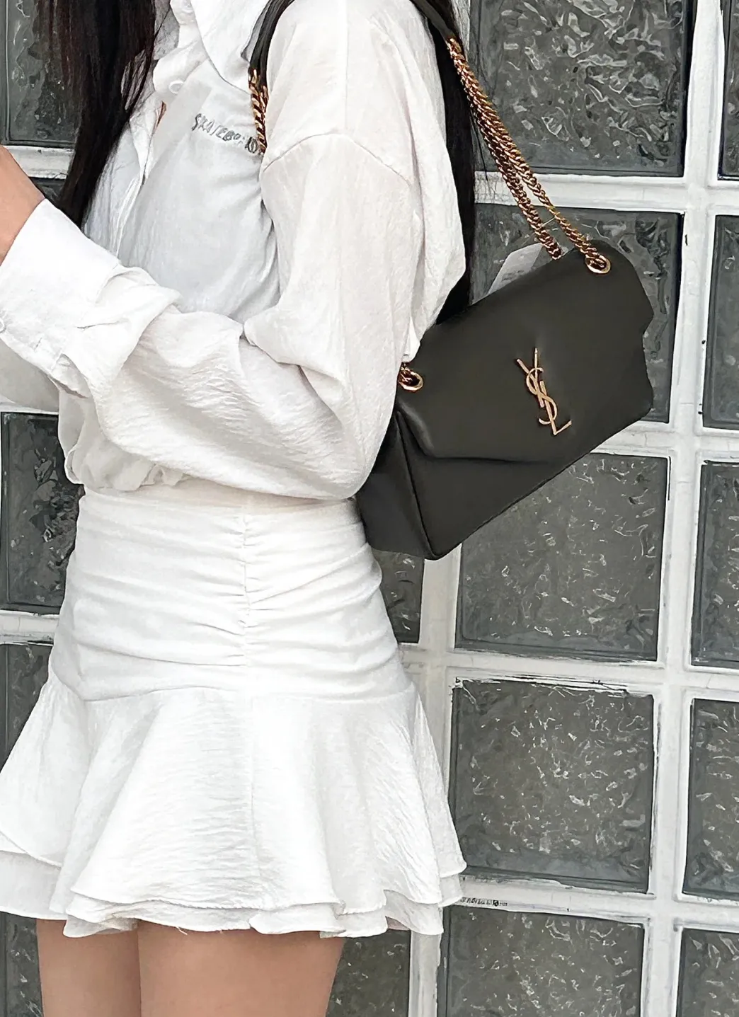 Сумка Calypso из овчины с лаконичным металлическим логотипом YSL. Мягкая и вместительная, она сочетает в себе легкость и практичность. Носите ее на плече с помощью кожаного ремня или цепочки, или же используйте двойную цепочку для более нарядного образа. Ретро-фурнитура придает сумке неповторимый шарм, идеально подходящий для создания повседневных образов.