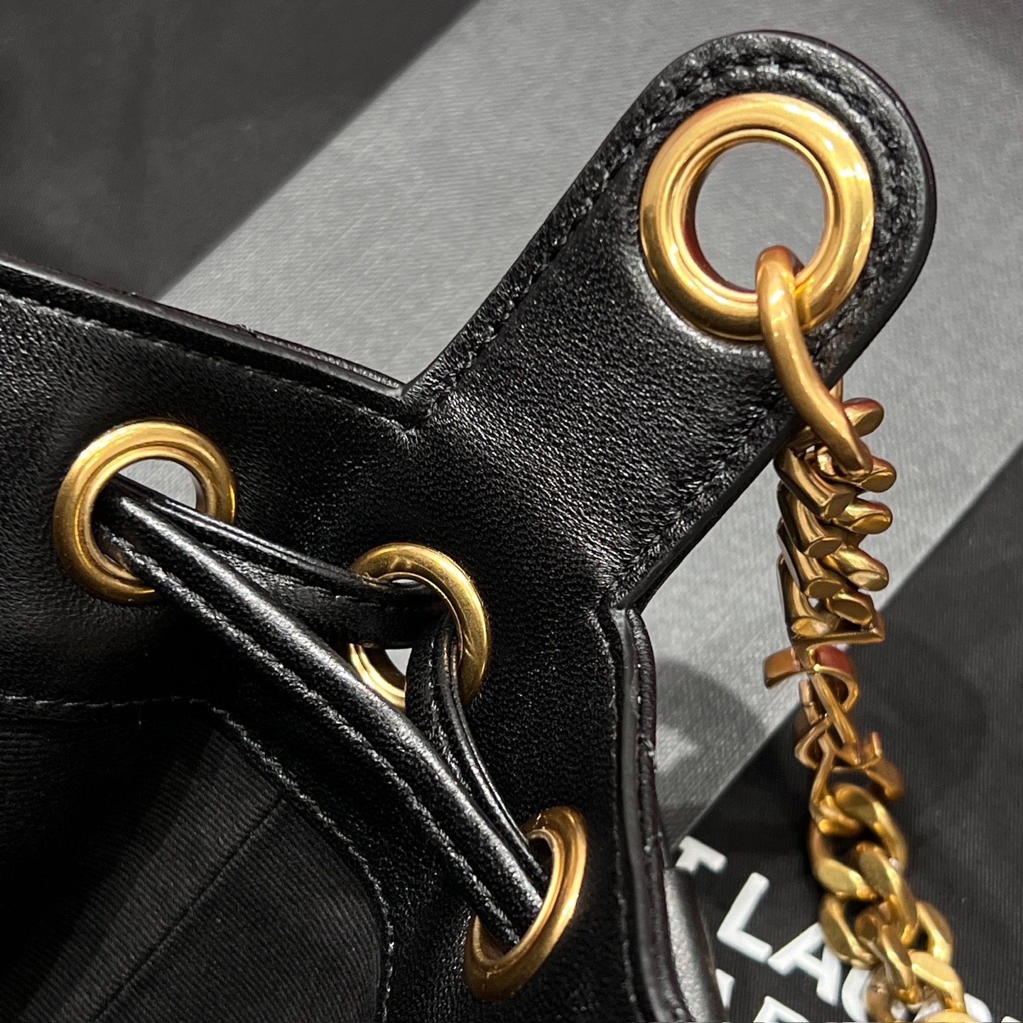 Знаковая фурнитура в благородном золотистом оттенке придаёт образу фирменный акцент Saint Laurent, а аккуратная кулиска добавляет современную женственность. Компактный формат Mini делает сумку идеальным выбором для города, вечерних выходов и стильных повседневных образов.