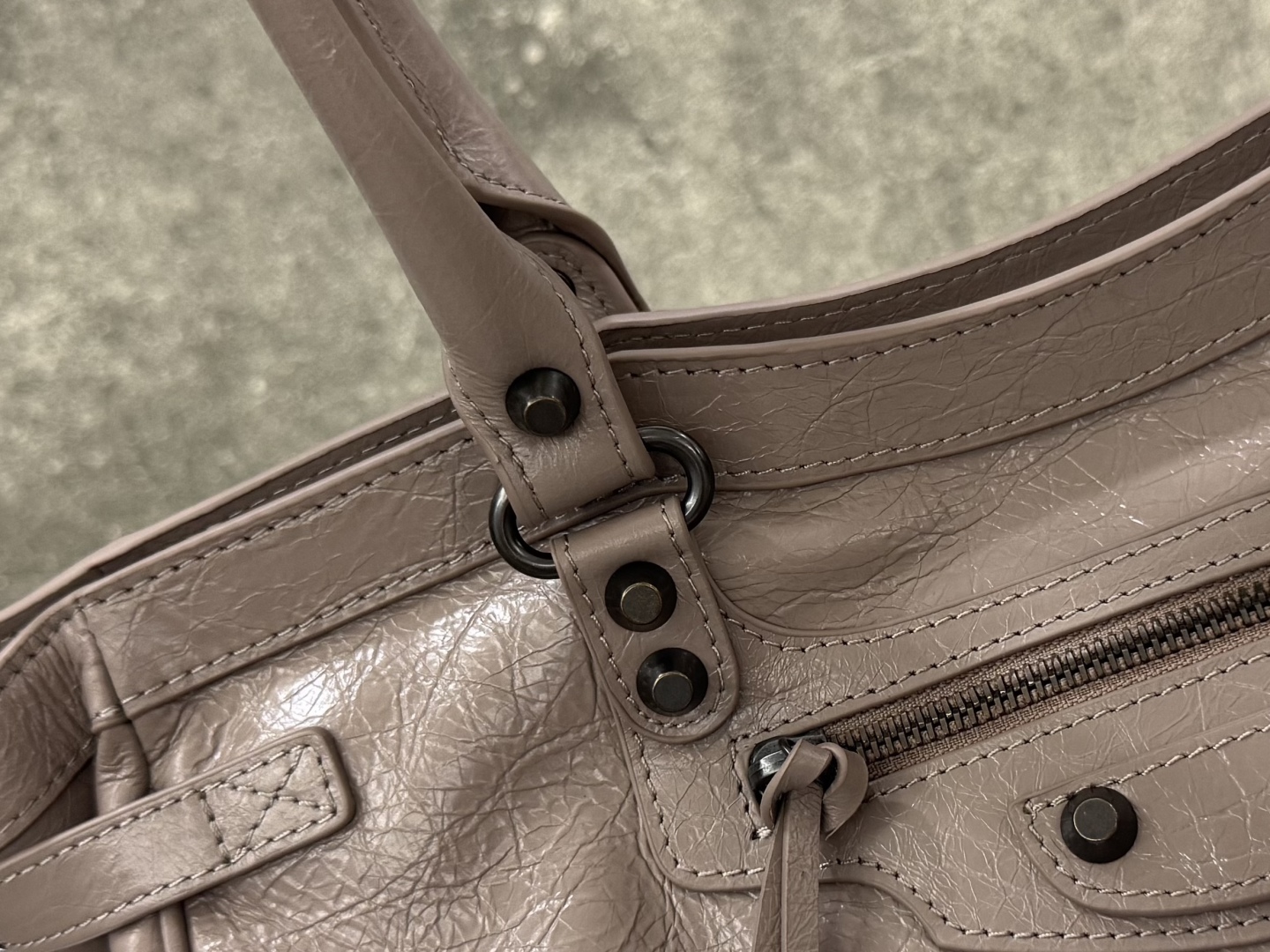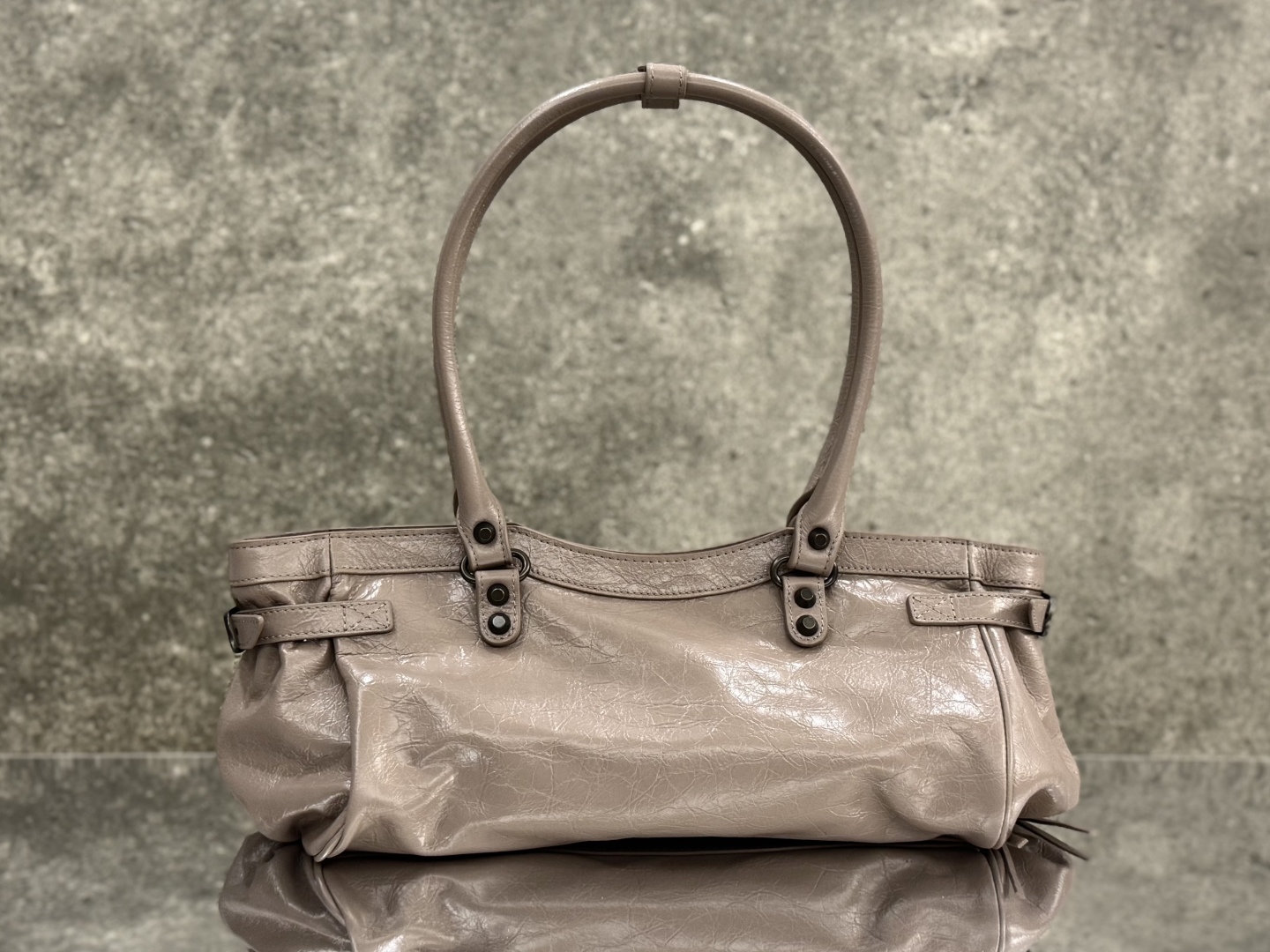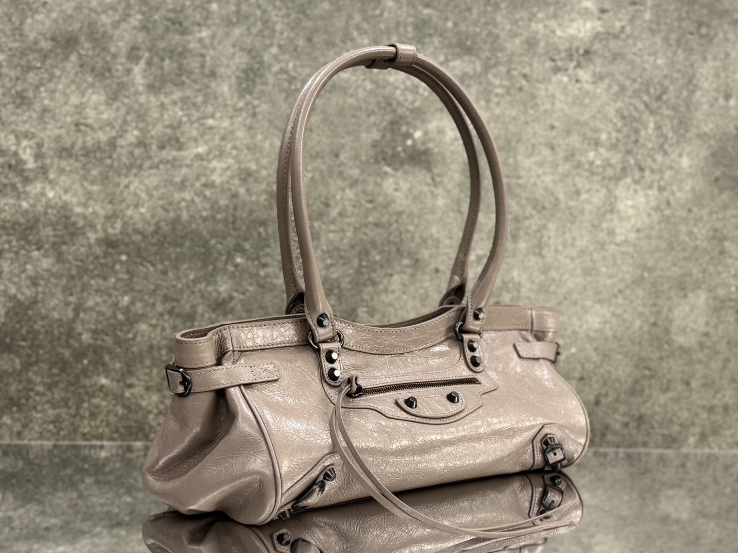 Дизайн LE City вдохновлён архивными архетипами 60-х, с отсылками к оригинальной City, но с современным обновлением: трапециевидная форма с мягкими контурами и усиленным дном обеспечивает стабильность и визуальную гармонию, подчёркивая фирменный силуэт бренда. Две короткие ручки из кожи с металлическими акцентами позволяют удобно носить сумку как классический tote или handheld, в то время как длинный съёмный плечевой ремень (регулируемый с пряжкой и карабинами) добавляет гибкости для кросс-боди стиля, адаптируясь к разным ритмам дня. Фирменные элементы — металлические заклёпки и studs, равномерно распределённые по периметру и фронтальной панели, — создают индустриальный ритм, усиливая текстуру кожи и придавая тактильную глубину.