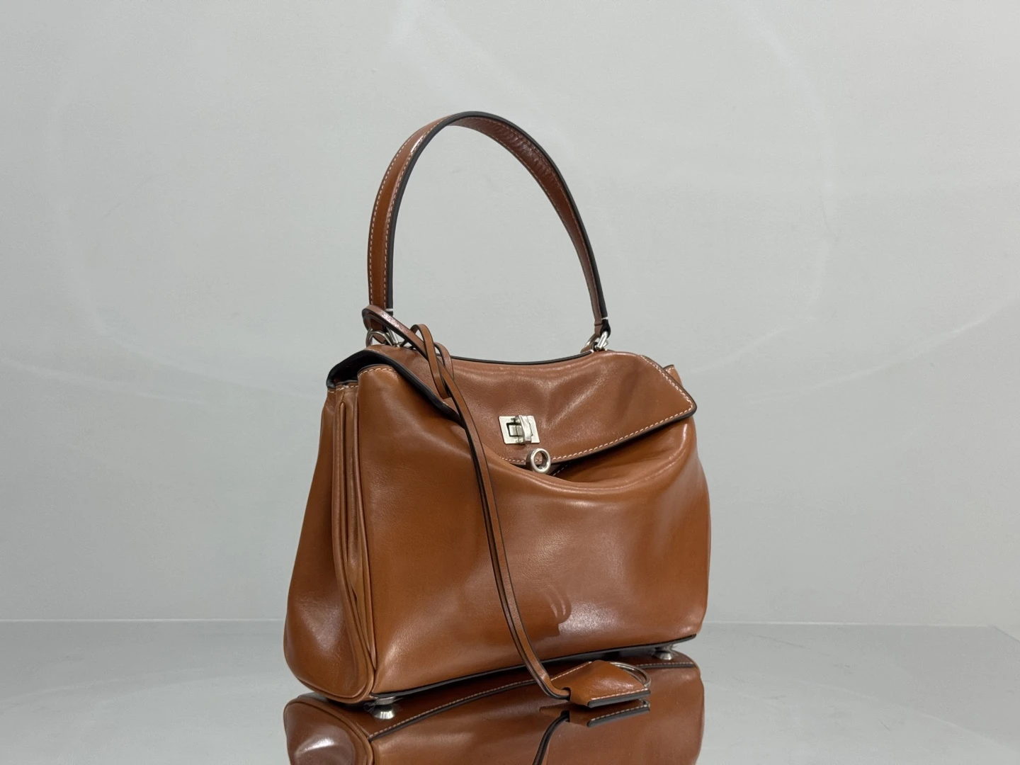 Женская сумка BALENCIAGA Rodeo — это утончённая эволюция иконической модели Rodeo, где фирменный дизайн бренда обретает новую глубину в насыщенном коньячном оттенке премиальной гладкой кожи, идеально подходящая для женщин, ценящих timeless элегантность с ноткой вестерн-шика и урбанистической роскоши. Эта лимитированная версия воплощает философию BALENCIAGA: гармоничный баланс между структурированной формой и органичной грацией, где каждая деталь подчёркивает динамику современной жизни с ощущением тёплой, тактильной изысканности. Компактные пропорции средней сумки обеспечивают идеальный баланс вместительности и лёгкости — достаточно пространства для ежедневных essentials, таких как кошелёк, смартфон, ключи и косметика, но эргономичной для ношения в руке или через плечо, адаптируясь к ритму дня с лёгким, уверенным шармом.