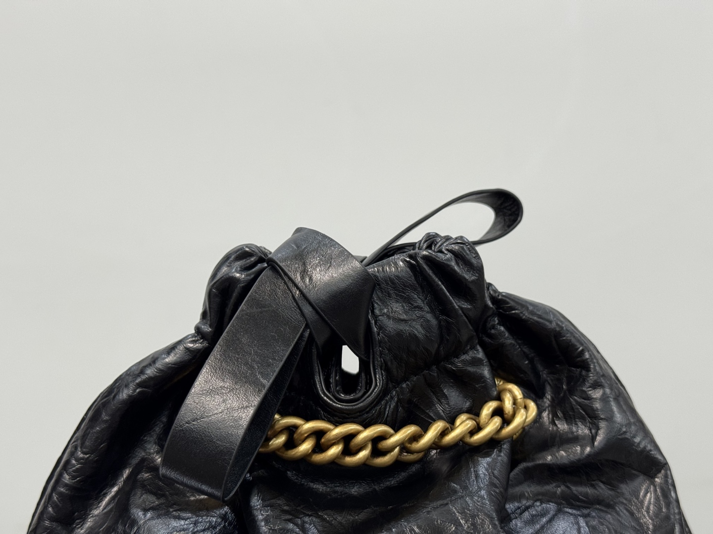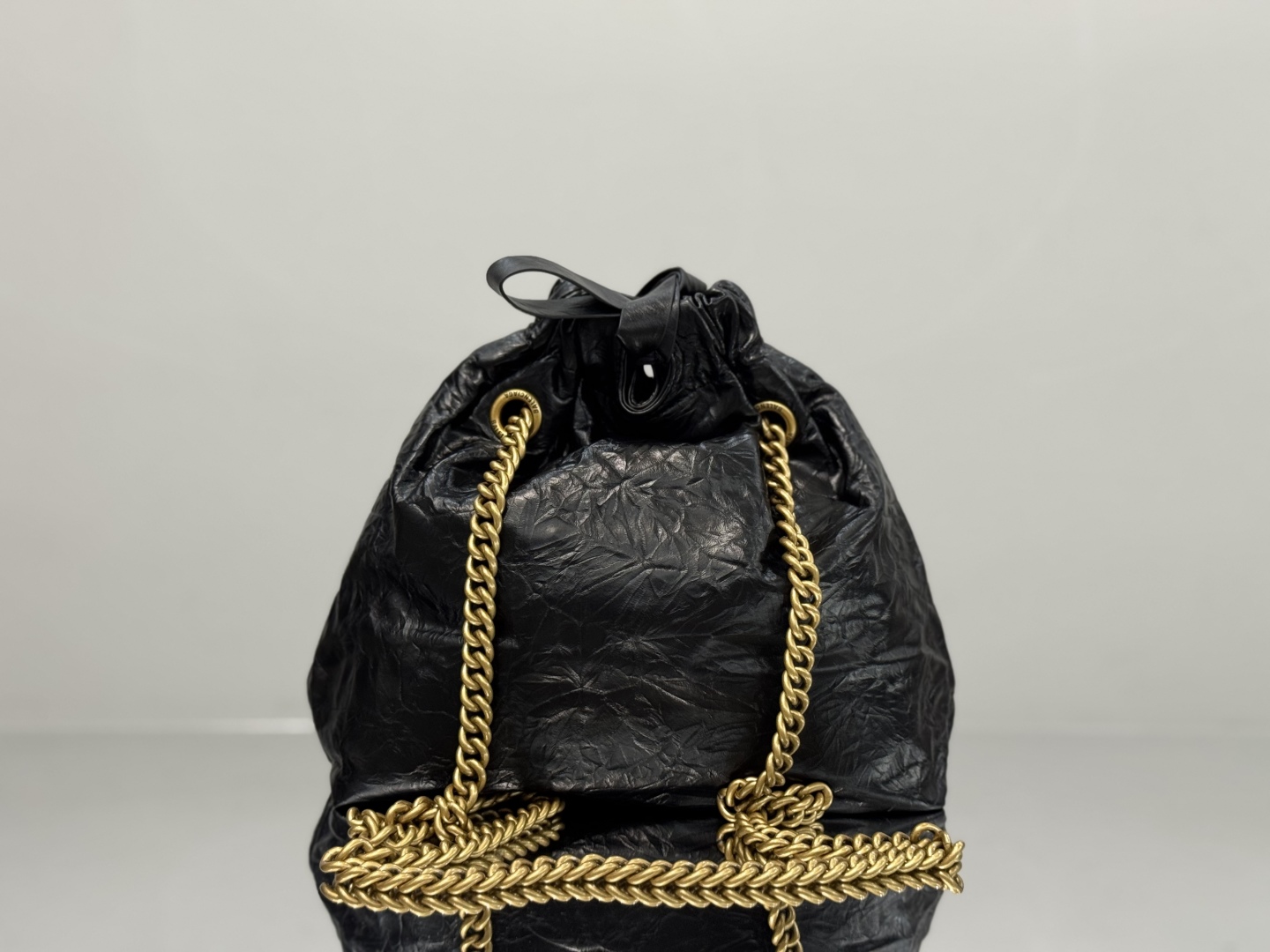Дизайн Tote вдохновлён архивными мотивами 90-х, с отсылками к оригинальным моделям, но с обновлённым акцентом на текстурированную кожу и минималистичные детали: мягкая, слегка трапециевидная форма с плоским дном дарит стабильность и визуальную гармонию, подчёркивая фирменный силуэт бренда с лёгким, скульптурным рельефом. Две короткие ручки из кожи с тонкими швами и интегрированной золотой цепочкой добавляют тактильную глубину и удобство для стиля, усиливая контраст между матовой текстурой и блеском металла. Центральный элемент — съёмная золотая цепочка в виде цепи, регулируемая с карабинами, предлагает гибкость для кросс-боди или shoulder-ношения, делая аксессуар универсальным для активного образа жизни.