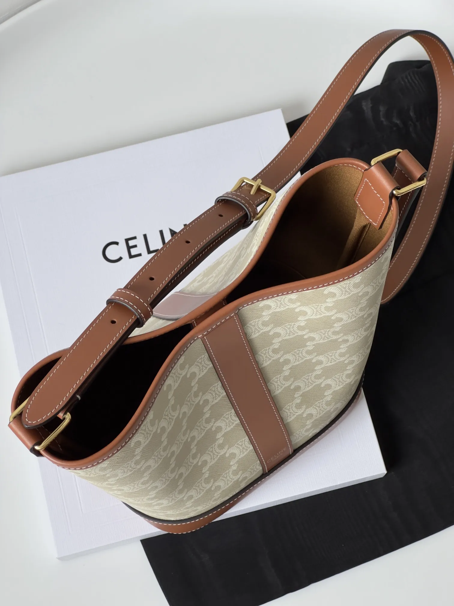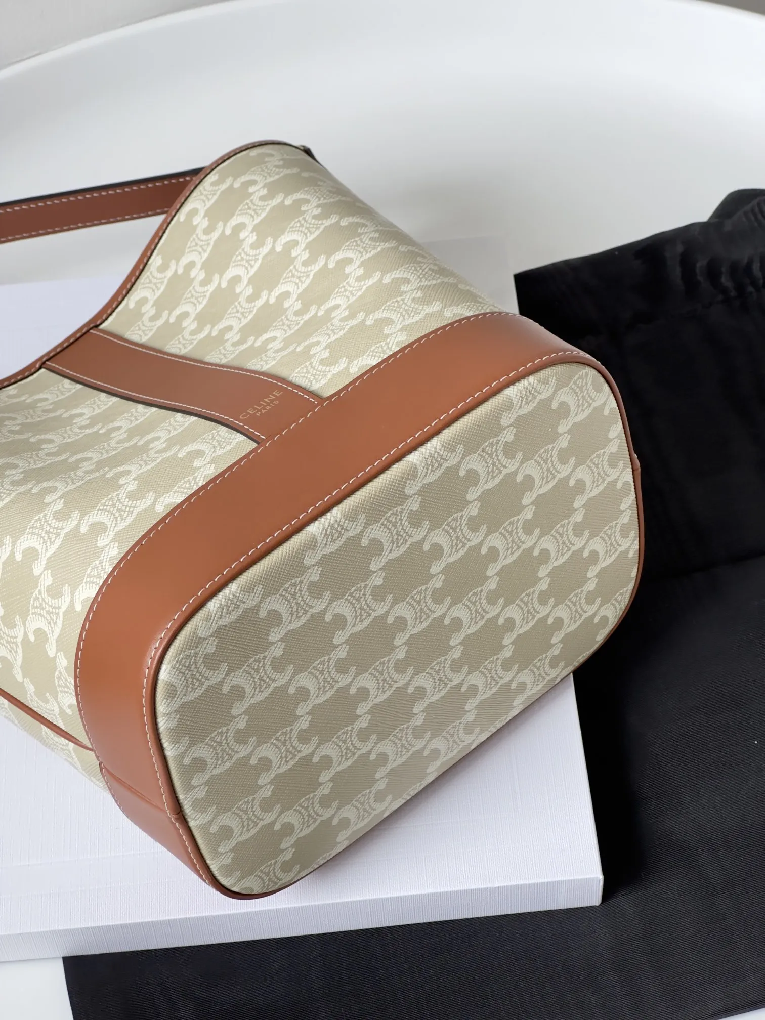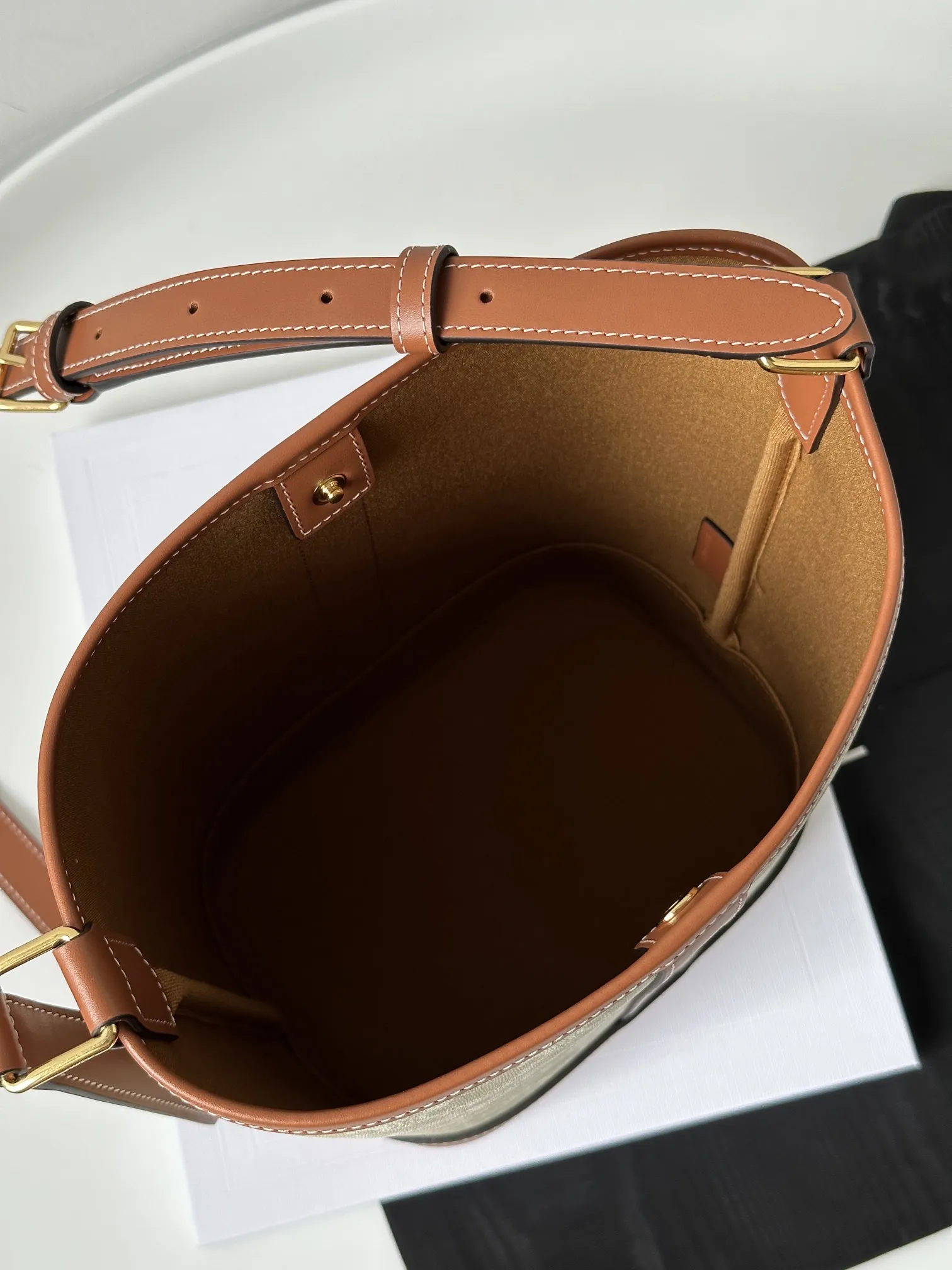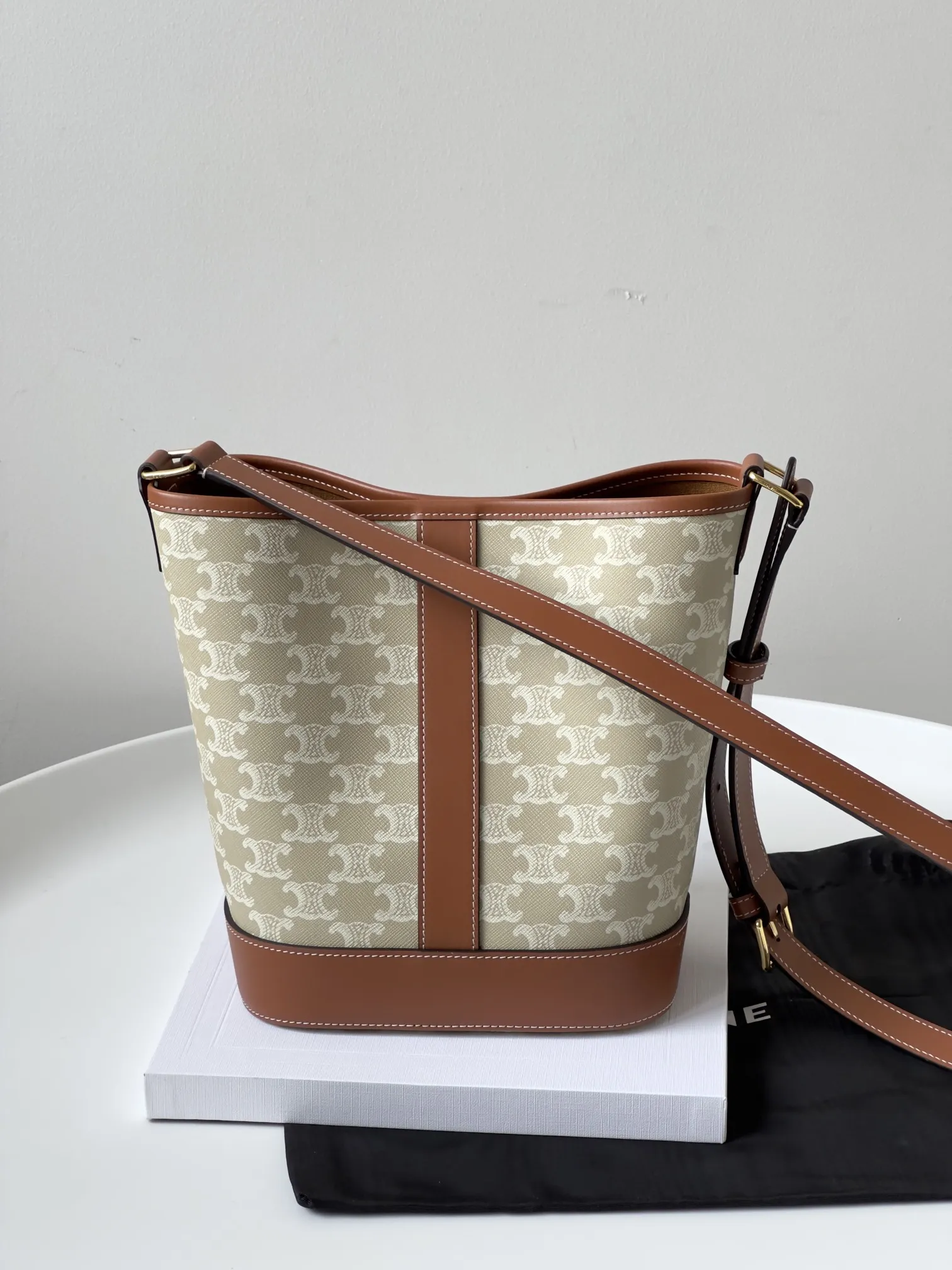 Стильное ведро из канвы Triomphe с отделкой из телячьей кожи объединяет элегантность и функциональность: