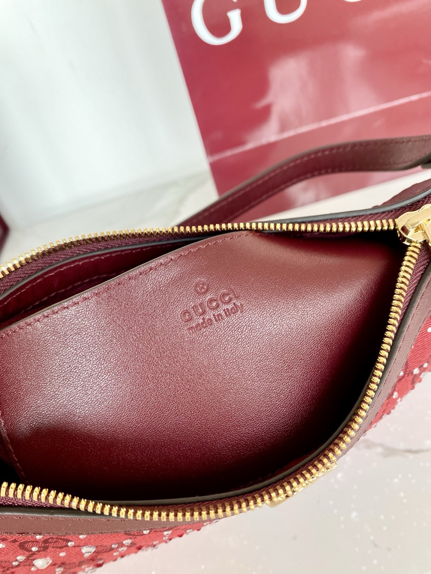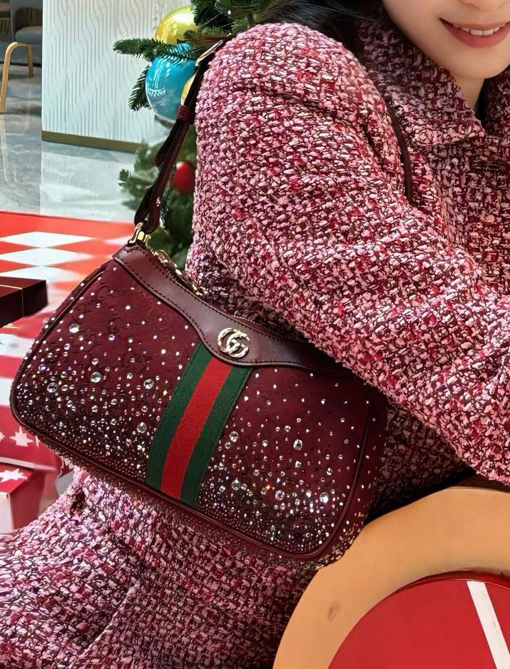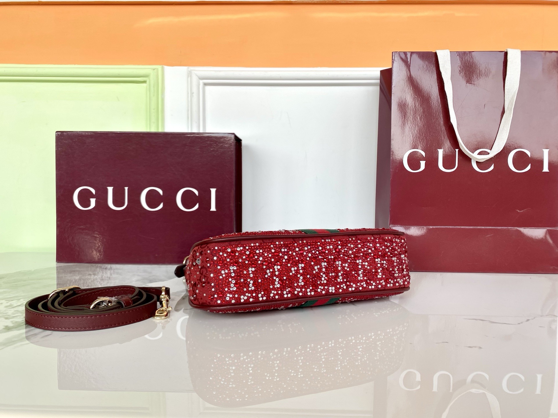Компактная сумка выполнена из текстильного основания, декорированного множеством сверкающих кристаллов разных размеров по всей лицевой части и днищу, что придаёт модели глубину и игру бликов. По центру оформлена фирменная Web‑полоска зелёного и красного цвета. Кромки и ручка отделаны гладкой бордовой кожей, которая подчёркивает насыщенность основного оттенка. На верхней части расположен золотистый металлический элемент с двойной логотип‑GG. Верхняя застёжка — практичная молния, обеспечивающая сохранность содержимого.