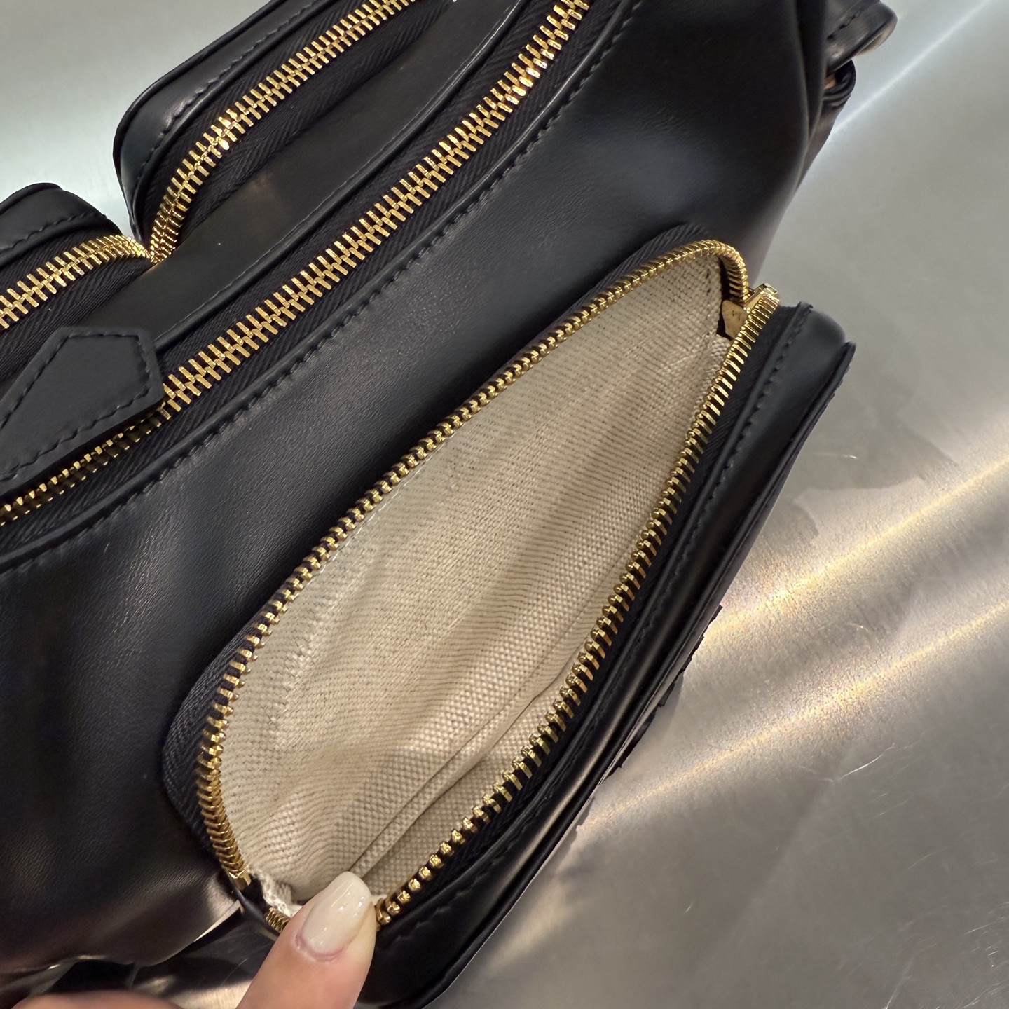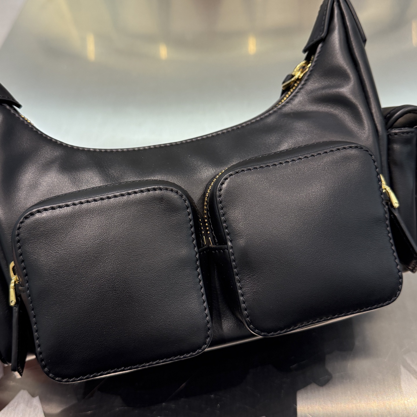 По бокам — аккуратные накладные карманы с клапанами и декоративными элементами, добавляющие функциональности и характерного стиля. Ручка средней длины позволяет носить сумку как на плече, так и в руках. Золотистая фурнитура гармонично контрастирует с чёрной кожей и делает образ более роскошным.