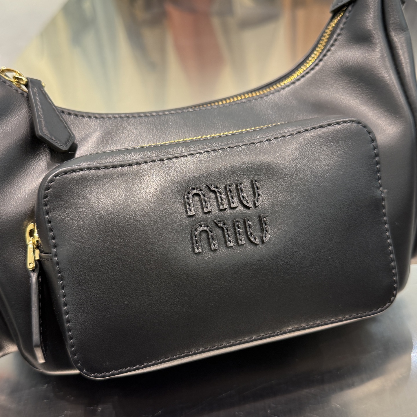 Эта сумка выполнена из гладкой, очень мягкой наппа-кожи премиального качества, которая выглядит благородно и приятно на ощупь. Силуэт — слегка «слouched», придающий модели расслабленную, но аккуратную структуру. На фронтальной части расположено небольшое внешнее отделение на молнии с тиснёным логотипом MIU MIU, которое удобно для быстрого доступа к ключам, картам или наушникам. Основное отделение закрывается верхней молнией, обеспечивая безопасность содержимого.