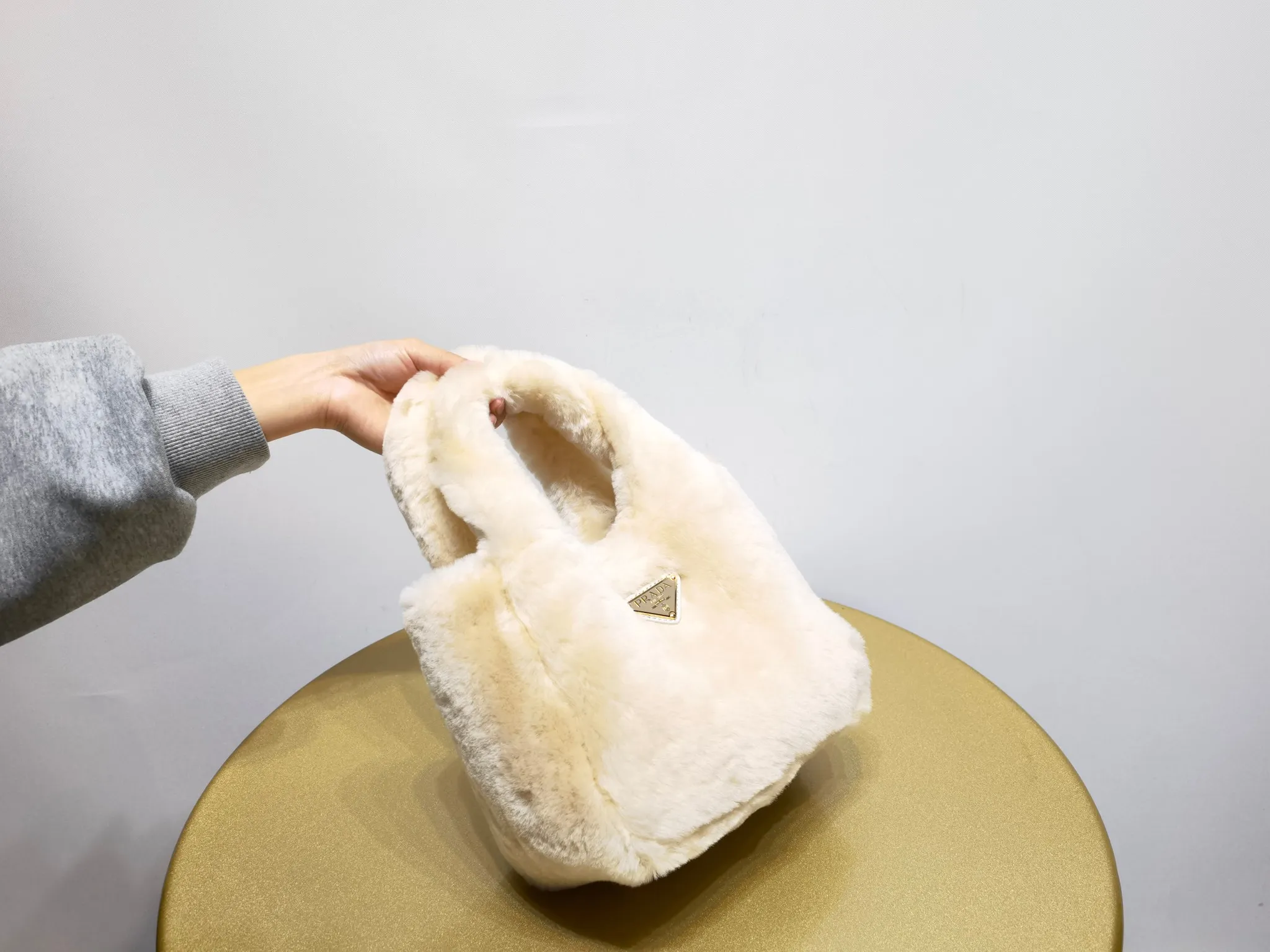 Представляем новую маленькую шерстяную сумку-корзинку от Prada. Уникальная мягкая и округлая форма в сочетании с культовым треугольным логотипом Prada придает сумке классический вид. Внутри уложена мягкая овчина, что обеспечивает дополнительный комфорт. Сумка вместительная и удобная: она имеет три отделения, включая среднее отделение на магнитной пряжке, что позволяет удобно организовать содержимое.