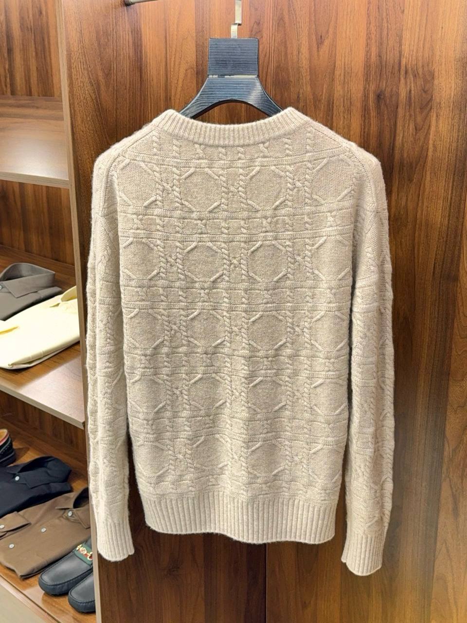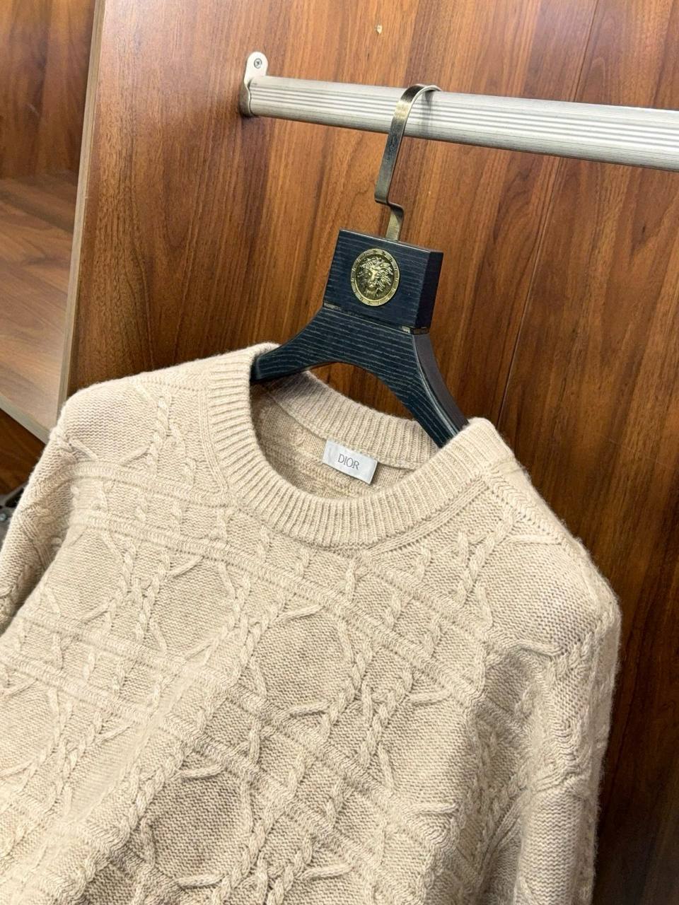 Модель выполнена из мягкого трикотажа премиального качества, который обеспечивает приятные тактильные ощущения и сохраняет тепло в прохладное время года. Бежевый оттенок свитера универсален и подходит для разных случаев и стилей, деликатно подчеркивает индивидуальность владельца. Особое внимание уделено рельефному плетению — на поверхности изделия расположены геометрические узоры, которые создают эффект глубины и делают свитер уникальным. Такой сложный орнамент не только демонстрирует мастерство дизайнеров дома Dior, но и добавляет модели выразительности.