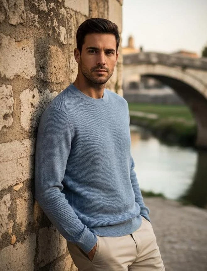 Элегантный мужской свитер от BRIONI в мягком пастельно‑голубом оттенке. Выполнен из высококачественной смеси шерсти и кашемира (90% шерсть, 10% кашемир) — теплый, приятный на ощупь и визуально легкий.